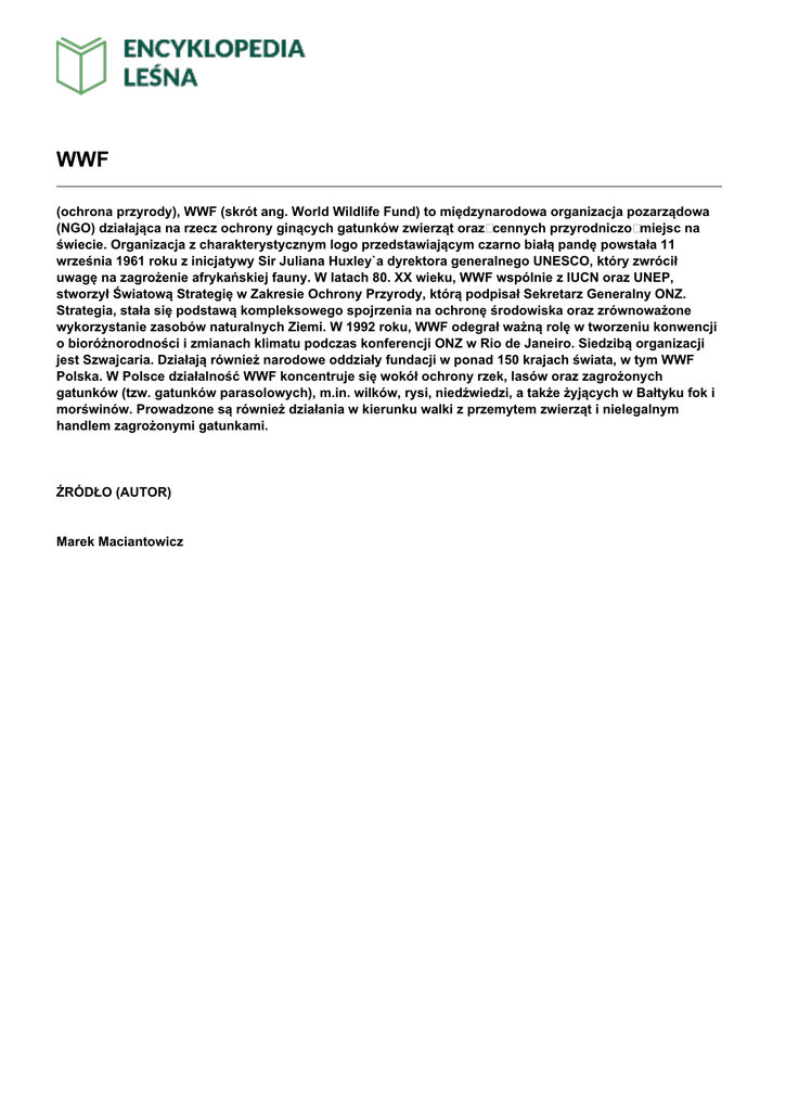 WWF (ochrona przyrody), WWF (skrót ang. World Wildlife Fund) to międzynarodowa organizacja pozarządowa (NGO) działająca na rzecz ochrony ginących gatunków zwierząt oraz cennych przyrodniczo miejsc na świecie. Organizacja z charakterystycznym logo przedstawiającym czarno białą pandę powstała 11 września 1961 roku z inicjatywy Sir Juliana Huxley`a dyrektora generalnego UNESCO, który zwrócił uwagę na zagrożenie afrykańskiej fauny. W latach 80. XX wieku, WWF wspólnie z IUCN oraz UNEP, stworzył Światową Strategię w Zakresie Ochrony Przyrody, którą podpisał Sekretarz Generalny ONZ. Strategia, stała się podstawą kompleksowego spojrzenia na ochronę środowiska oraz zrównoważone wykorzystanie zasobów naturalnych Ziemi. W 1992 roku, WWF odegrał ważną rolę w tworzeniu konwencji o bioróżnorodności i zmianach klimatu podczas konferencji ONZ w Rio de Janeiro. Siedzibą organizacji jest Szwajcaria. Działają również narodowe oddziały fundacji w ponad 150 krajach świata, w tym WWF Polska. W Polsce działalność WWF koncentruje się wokół ochrony rzek, lasów oraz zagrożonych gatunków (tzw. gatunków parasolowych), m.in. wilków, rysi, niedźwiedzi, a także żyjących w Bałtyku fok i morświnów. Prowadzone są również działania w kierunku walki z przemytem zwierząt i nielegalnym handlem zagrożonymi gatunkami. ŹRÓDŁO (AUTOR) Marek Maciantowicz