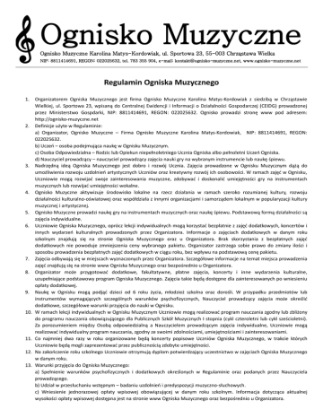 Ognisko Muzyczne & Ognisko Muzyczne Karolina Matys-Kordowiak, ul. Sportowa 23, 55-003 Chrząstawa Wielka NIP: 8811414691, REGON: 022025632, tel. 783 355 904, e-mail: [email protected], www.ognisko-muzyczne.net Regulamin Ogniska Muzycznego 1. 2. 3. 4. 5. 6. 7. 8. 9. 10. 11. 12. 13. Organizatorem Ogniska Muzycznego jest firma Ognisko Muzyczne Karolina Matys-Kordowiak z siedzibą w Chrząstawie Wielkiej, ul. Sportowa 23, wpisaną do Centralnej Ewidencji i Informacji o Działalności Gospodarczej (CEIDG) prowadzonej przez Ministerstwo Gospdarki, NIP: 8811414691, REGON: 022025632. Ognisko prowadzi stronę www pod adresem: http://ognisko-muzyczne.net Definicje użyte w Regulaminie: a) Organizator, Ognisko Muzyczne – Firma Ognisko Muzyczne Karolina Matys-Kordowiak, NIP: 8811414691, REGON: 022025632. b) Uczeń – osoba podejmująca naukę w Ognisku Muzycznym. c) Osoba Odpowiedzialna – Rodzic lub Opiekun niepełnoletniego Ucznia Ogniska albo pełnoletni Uczeń Ogniska. d) Nauczyciel prowadzący – nauczyciel prowadzący zajęcia nauki gry na wybranym instrumencie lub naukę śpiewu. Nadrzędną ideą Ogniska Muzycznego jest dobro i rozwój Ucznia. Zajęcia prowadzone w Ognisku Muzycznym dążą do umożliwienia rozwoju uzdolnień artystycznych Uczniów oraz kreatywny rozwój ich osobowości. W ramach zajęć w Ognisku, Uczniowie mogą rozwijać swoje zainteresowania muzyczne, zdobywać i doskonalić umiejętności gry na instrumentach muzycznych lub rozwijać umiejętności wokalne. Ognisko Muzyczne aktywizuje środowisko lokalne na rzecz działania w ramach szeroko rozumianej kultury, rozwoju działalności kulturalno-oświatowej oraz współdziała z innymi organizacjami i samorządem lokalnym w popularyzacji kultury muzycznej i artystycznej. Ognisko Muzyczne prowadzi naukę gry na instrumentach muzycznych oraz naukę śpiewu. Podstawową formą działalności są zajęcia indywidualne. Uczniowie Ogniska Muzycznego, oprócz lekcji indywidualnych mogą korzystać bezpłatnie z zajęć dodatkowych, koncertów i innych wydarzeń kulturalnych prowadzonych przez Organizatora. Informacje o zajęciach dodatkowych w danym roku szkolnym znajdują się na stronie Ogniska Muzycznego oraz u Organizatora. Brak skorzystania z bezpłatnych zajęć dodatkowych nie powoduje zmniejszenia ceny wybranego pakietu. Organizator zastrzega sobie prawo do zmiany ilości i sposobu prowadzenia bezpłatnych zajęć dodatkowych w ciągu roku, bez wpływu na podstawową cenę pakietu. Zajęcia odbywają się w miejscach wyznaczonych przez Organizatora. Szczegółowe informacje na temat miejsca prowadzenia zajęć znajdują się na stronie www Ogniska Muzycznego oraz bezpośrednio u Organizatora. Organizator może przygotować dodatkowe, fakultatywne, płatne zajęcia, koncerty i inne wydarzenia kulturalne, uzupełniające podstawowy program Ogniska Muzycznego. Zajęcia takie będą dostępne dla zainteresowanych po wniesieniu opłaty dodatkowej. Naukę w Ognisku mogą podjąć dzieci od 6 roku życia, młodzież szkolna oraz dorośli. W przypadku przedmiotów lub instrumentów wymagających szczególnych warunków psychofizycznych, Nauczyciel prowadzący zajęcia może określić dodatkowe, szczegółowe warunki przyjęcia do nauki w Ognisku. W ramach lekcji indywidualnych w Ognisku Muzycznym Uczniowie mogą realizować program nauczania zgodny lub zbliżony do programu nauczania obowiązującego dla Publicznych Szkół Muzycznych I stopnia (cykl czteroletni lub cykl sześcioletni). Za porozumieniem między Osobą odpowiedzialną a Nauczycielem prowadzącym zajęcia indywidualne, Uczniowie mogą realizować indywidualny program nauczania, zgodny ze swoimi zdolnościami, umiejętnościami i zainteresowaniami. Co najmniej dwa razy w roku organizowane będą koncerty popisowe Uczniów Ogniska Muzycznego, w trakcie których Uczniowie będą mogli zaprezentować przez publicznością zdobyte umiejętności. Na zakończenie roku szkolnego Uczniowie otrzymują dyplom potwierdzający uczestnictwo w zajęciach Ogniska Muzycznego w danym roku. Warunki przyjęcia do Ogniska Muzycznego: a) Spełnienie warunków psychofizycznych i dodatkowych określonych w Regulaminie oraz podanych przez Nauczyciela prowadzącego. b) Udział w przesłuchaniu wstępnym – badaniu uzdolnień i predyspozycji muzyczno-słuchowych. c) Wniesienie jednorazowej opłaty wpisowej obowiązującej w danym roku szkolnym. Informacja dotycząca aktualnej wysokości opłaty wpisowej dostępna jest na stronie www Ogniska Muzycznego oraz bezpośrednio u Organizatora. d) Dostępność miejsca i uruchomienie nauki gry na wybranym instrumencie. 14. Uczniowie mają prawo do: a) Właściwie zorganizowanego procesu kształcenia, rozwoju swoich zainteresowań, zdolności i umiejętności muzycznych. b) Wystąpienia podczas koncertu popisowego Uczniów Ogniska Muzycznego, w trakcie którego mogą przedstawić zdobyte umiejętności. c) Bieżącej, rzetelnej informacji na temat oceny postępów w nauce w Ognisku Muzycznym d) Udziału w bezpłatnych zajęciach dodatkowych prowadzonych przez Organizatora. e) Szczególnie uzdolnieni Uczniowie mają prawo do zapewnienia sprzyjających warunków rozwoju zdolności i umiejętności. 15. Osoby Odpowiedzialne mają prawo do: a) Bieżącej, rzetelnej informacji na temat oceny postępów Ucznia w nauce w Ognisku Muzycznym b) Współdziałania z Nauczycielem prowadzącym w celu określenia programu indywidualnego rozwoju dostosowanego do możliwości, zdolności i zainteresowań Ucznia. c) Uzyskiwania od Nauczycieli prowadzących informacji, porad i wskazówek odnośnie dalszego rozwoju artystycznego Ucznia, zalecanych ćwiczeń, oraz sposobów udzielania dziecku wsparcia w przypadkach problemów edukacyjnych i wychowawczych. d) Wyrażania opinii na temat realizowanego programu, organizacji zajęć oraz zgłaszania Organizatorowi wszelkich własnych propozycji dotyczących oferty edukacyjnej i wychowawczej. 16. Nauczyciel prowadzący