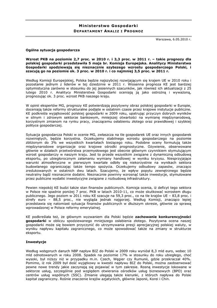 M i n is te r st w o Go sp od a rk i DEPARTAMENT ANALIZ I PROGNOZ Warszawa, 6.05.2010 r. Ogólna sytuacja gospodarcza Wzrost PKB na poziomie 2,7 proc. w 2010 r. i 3,3 proc. w 2011 r. – takie prognozy dla polskiej gospodarki przedstawiła 5 maja br. Komisja Europejska. Analitycy Ministerstwa Gospodarki spodziewają się nieznacznie szybszego wzrostu gospodarczego Polski, i szacują go na poziomie ok. 3 proc. w 2010 r. i co najmniej 3,5 proc. w 2011 r. Według Komisji Europejskiej, Polska będzie najszybciej rozwijającym się krajem UE w 2010 roku i pozostanie jednym z liderów w tej dziedzinie w 2011 r. Wiosenna prognoza KE jest bardziej optymistyczna zarówno w stosunku do jej jesiennych szacunków, jak równieŜ ich aktualizacji z 25 lutego 2010 r. Analitycy Ministerstwa Gospodarki oceniają ją jako ostroŜną i wywaŜoną, prognozując ok. 3 proc. wzrost PKB naszego kraju. W opinii ekspertów MG, prognozy KE potwierdzają pozytywny obraz polskiej gospodarki w Europie, doceniają takŜe reformy strukturalne podjęte w ostatnim czasie przez krajowe instytucje publiczne. KE podkreśla wyjątkowość polskiej gospodarki w 2009 roku, upatrując przyczyn dobrych wyników w silnym i zdrowym sektorze bankowym, mniejszej otwartości na wymianę międzynarodową, korzystnym zmianom na rynku pracy, znaczącemu osłabieniu złotego oraz prawidłowej i szybkiej polityce gospodarczej. Sytuacja gospodarcza Polski w ocenie MG, zwłaszcza na tle gospodarek UE oraz innych gospodarek rozwiniętych, będzie korzystna. Oczekujemy stabilnego wzrostu gospodarczego na poziomie zbliŜonym do 3% we wszystkich kwartałach bieŜącego roku. Podobne oceny formułują takŜe międzynarodowe organizacje oraz krajowe ośrodki prognostyczne. OŜywienie, obserwowane głównie w działach przetwórstwa przemysłowego jest obecnie głównym czynnikiem stymulującym wzrost gospodarczy w naszym kraju. Jest to przede wszystkim związane z dynamiczną odbudową eksportu, po ubiegłorocznym załamaniu wymiany handlowej w wyniku kryzysu. Niesprzyjające warunki atmosferyczne w pierwszym kwartale odbiły się niekorzystnie na wynikach sektora budowlanego ograniczając takŜe tempo spoŜycia. Oczekujemy odbudowy zapasów, znacząco zredukowanych w ostatnich dwu latach. Szacujemy, Ŝe wpływ popytu zewnętrznego będzie neutralny bądź nieznacznie dodatni. Nieznacznie powinny wzrosnąć takŜe inwestycje, stymulowane przez publiczne wydatki inwestycyjne związane z rozbudową infrastruktury. Pewien niepokój KE budzi takŜe stan finansów publicznych. Komisja ocenia, iŜ deficyt tego sektora w Polsce nie spadnie poniŜej 7 proc. PKB w latach 2010-11, co moŜe skutkować wzrostem długu publicznego. Jego poziom w 2011 roku KE szacuje na 59,3 proc., co na tle krajów UE – 83,8 proc. i strefy euro – 88,5 proc., nie wygląda jednak najgorzej. Według Komisji, znacząco lepiej przedstawia się natomiast sytuacja finansów publicznych w dłuŜszym okresie, głównie za sprawą wprowadzonej w Polsce reformy emerytalnej. KE podkreślała teŜ, Ŝe głównym wyzwaniem dla Polski będzie zachowanie konkurencyjności gospodarki w obliczu spodziewanego mniejszego osłabienia złotego. Pozytywna ocena naszej gospodarki moŜe się bowiem przyczynić do utrzymywania presji aprecjacyjnej polskiej waluty, w wyniku napływu kapitału zagranicznego, co moŜe spowodować takŜe na zmiany w strukturze eksportu. Inwestycje Według wstępnych danych NBP napływ BIZ do Polski w 2009 roku wyniósł 8,3 mld euro, wobec 10 mld odnotowanych w roku 2008. Spadek na poziomie 17% w stosunku do roku ubiegłego, choć wysoki, był niŜszy niŜ w przypadku m.in. Czech, Węgier czy Rumunii, gdzie przekraczał 40%. Pomimo, iŜ rok 2009 był dość wyjątkowy w kwestii napływu BIZ do Polski, moŜna zaobserwować pewne nowe trendy jakie zaczynają się pojawiać w tym zakresie. Rosną inwestycje lokowane w sektorze usług, szczególnie pod względem otwierania ośrodków usług biznesowych (BPO) oraz centrów usług wspólnych (SSC). Zmianie ulegają takŜe kierunki, z których napływa do Polski kapitał zagraniczny. Rośnie znaczenie krajów azjatyckich, głównie Japonii, Korei i Chin. Zmiany w strukturze sektorowej BIZ są tym korzystniejsze, iŜ to właśnie m.in. centra BPO uwaŜa się za jeden z najbardziej perspektywicznych sektorów do lokowania kapitału zagranicznego (obok sektora lotniczego - w Polsce mamy Dolinę Lotniczą na Podkarpaciu oraz maszynowego). W tym teŜ kierunku moŜna się spodziewać będą się rozwijały BIZ w Polsce. W ujęciu wartościowym, w najbliŜszych trzech latach, trudno się spodziewać znaczącego wzrostu inwestycji. Skutki globalnego kryzysu będą jeszcze odczuwalne przez dłuŜszy czas, co ograniczy skłonność inwestorów do podejmowania działalności. Tym niemniej moŜna się spodziewać, Ŝe ze względu na swoją stabilną sytuację gospodarczą Polska pozostanie krajem cieszącym się duŜym zainteresowaniem ze strony inwestorów zagranicznych, nawet w tym trudnym okresie. Kurs PLN Polska waluta, podobnie jak i większość walut krajów zaliczanych do rynków wschodzących, traci na fali globalnej ucieczki od ryzyka, wywołanej obawami o rozprzestrzenienie się greckiego kryzysu na inne europejskie kraje mające podobny problem z nadmiernym zadłuŜeniem, co mogłoby zachwiać stabilnością całej strefy euro. W tym kontekście wymienia się przede wszystkim Portugalię i Hiszpanię. Szczególnie groźne byłoby, gdyby kryzys fiskalny nasilił się w przypadku tego ostatniego kraju. Hiszpania tworzy aŜ 11 proc. PKB całej strefy euro, a jej zadłuŜenie stanowi 6,7 proc. ogólnego zadłuŜenia. Dla porównania, w przypadku Grecji te wielkości kształtują się odpowiednio na poziomie 2,3 proc. i 3,7 proc Dzisiaj rano złoty ponownie się osłabił. Euro podroŜało w okolice 4,1160 zł, a dolar do 3,23 zł. Taką dynamikę obserwowaliśmy ostatnio na przełomie 2008/09 r. Kolejne godziny przyniosły jedn