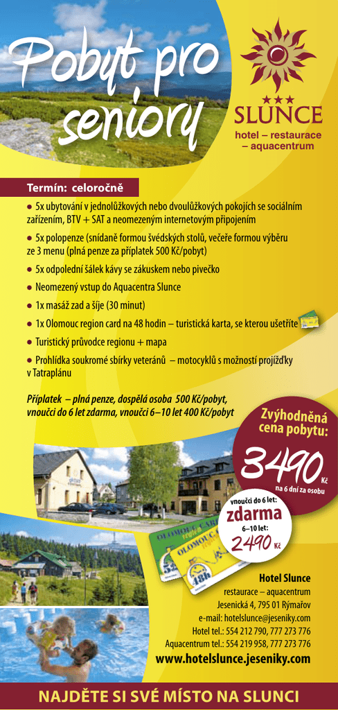 Pobyt pro seniory hotel – restaurace – aquacentrum Termín: celoročně 5x ubytování v jednolůžkových nebo dvoulůžkových pokojích se sociálním zařízením, BTV + SAT a neomezeným internetovým připojením 5x polopenze (snídaně formou švédských stolů, večeře formou výběru ze 3 menu (plná penze za příplatek 500 Kč/pobyt) 5x odpolední šálek kávy se zákuskem nebo pivečko Neomezený vstup do Aquacentra Slunce 1x masáž zad a šíje (30 minut) 1x Olomouc region card na 48 hodin – turistická karta, se kterou ušetříte Turistický průvodce regionu + mapa Prohlídka soukromé sbírky veteránů – motocyklů s možností projížďky v Tatraplánu Příplatek – plná penze, dospělá osoba 500 Kč/pobyt, vnoučci do 6 let zdarma, vnoučci 6–10 let 400 Kč/pobyt Zvýhodněná cena pobytu: 3490 Kč na 6 dní za osobu vnoučci do 6 let: zdarma 6–10 let: 2 49 0 Kč Hotel Slunce restaurace – aquacentrum Jesenická 4, 795 01 Rýmařov e-mail: [email protected] Hotel tel.: 554 212 790, 777 273 776 Aquacentrum tel.: 554 219 958, 777 273 776 www.hotelslunce.jeseniky.com najděte si své místo na slunci Pobyt dla seniorów hotel – restauracja – aquacentrum Termin: całorocznie 5x nocleg w pokojach jednoosobowych lub dwuosobowych z wygodami, kolorowym TV + SAT oraz nieograniczonym łączem internetowym 5x dwa posiłki dziennie (śniadania w formie stołów szwedzkich, kolacje z możliwością wyboru dania z 3 menu (wyżywienie całodzienne za dopłatą 500 CZK/pobyt) 5x popołudniowa kawa z ciastkiem albo piwko nieograniczony wstęp do parku wodnego Aquacentrum Slunce 1x masaż pleców i karku (30 min) 1x Olomouc region card na 48 godzin – karta turystyczna, z którą zaoszczędzisz Przewodnik turystyczny regionu + mapa Zwiedzanie prywatnej kolekcji zabytkowych samochodów i motocykli – z możliwością przejażdżki Tatraplanem Dopłata – wyżywienie całodzienne, osoby dorosłe 500 CZK/pobyt, wnuki 6–10 lat 400 CZK/pobyt, wnuki do 6 lat bezpłatnie. Ulgowa cena pobytu 3490 wnuki do 6 lat: CZK /6 dni za osobę bezp6–10łalat:tnie 2 49 0 CZK Hotel Slunce restauracja – aquacentrum Jesenická 4, 795 01 Rýmařov e-mail: [email protected] Hotel tel.: +420 554 212 790, 777 273 776 Aquacentrum tel.: +420 554 219 958, 777 273 776 www.hotelslunce.jeseniky.com Znajdź swoje miejsce pod słońcem