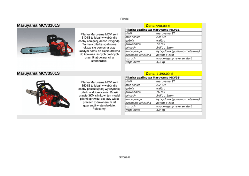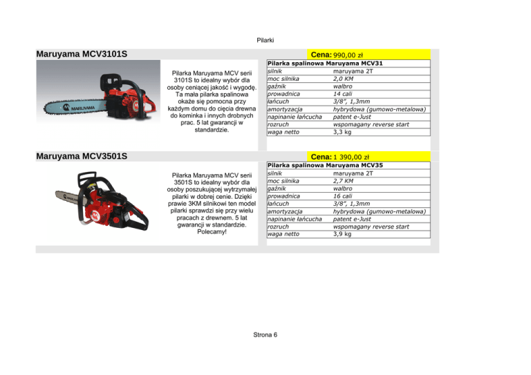 Pilarki Maruyama MCV3101S Cena: 990,00 zł Pilarka Maruyama MCV serii 3101S to idealny wybór dla osoby ceniącej jakość i wygodę. Ta mała pilarka spalinowa okaże się pomocna przy każdym domu do cięcia drewna do kominka i innych drobnych prac. 5 lat gwarancji w standardzie. Pilarka spalinowa Maruyama MCV31 silnik maruyama 2T moc silnika 2,0 KM gaźnik walbro prowadnica 14 cali łańcuch 3/8”, 1,3mm amortyzacja hybrydowa (gumowo-metalowa) napinanie łańcucha patent e-Just rozruch wspomagany reverse start waga netto 3,3 kg Pilarka Maruyama MCV serii 3501S to idealny wybór dla osoby poszukującej wytrzymałej pilarki w dobrej cenie. Dzięki prawie 3KM silnikowi ten model pilarki sprawdzi się przy wielu pracach z drewnem. 5 lat gwarancji w standardzie. Polecamy! Pilarka spalinowa Maruyama MCV35 silnik maruyama 2T moc silnika 2,7 KM gaźnik walbro prowadnica 16 cali łańcuch 3/8”, 1,3mm amortyzacja hybrydowa (gumowo-metalowa) napinanie łańcucha patent e-Just rozruch wspomagany reverse start waga netto 3,9 kg Maruyama MCV3501S Cena: 1 390,00 zł Strona 6