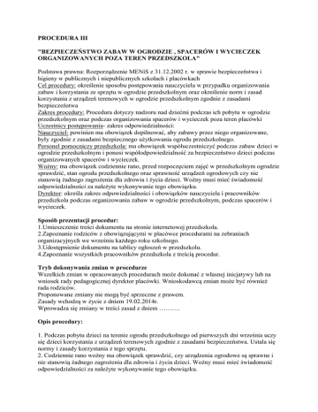 PROCEDURA III "BEZPIECZEŃSTWO ZABAW W OGRODZIE , SPACERÓW I WYCIECZEK ORGANIZOWANYCH POZA TEREN PRZEDSZKOLA" Podstawa prawna: Rozporządzenie MENiS z 31.12.2002 r. w sprawie bezpieczeństwa i higieny w publicznych i niepublicznych szkołach i placówkach Cel procedury: określenie sposobu postępowania nauczyciela w przypadku organizowania zabaw i korzystania ze sprzętu w ogrodzie przedszkolnym oraz określenie norm i zasad korzystania z urządzeń terenowych w ogrodzie przedszkolnym zgodnie z zasadami bezpieczeństwa Zakres procedury: Procedura dotyczy nadzoru nad dziećmi podczas ich pobytu w ogrodzie przedszkolnym oraz podczas organizowania spacerów i wycieczek poza teren placówki Uczestnicy postępowania- zakres odpowiedzialności: Nauczyciel: powinien ma obowiązek dopilnować, aby zabawy przez niego organizowane, były zgodnie z zasadami bezpiecznego użytkowania ogrodu przedszkolnego. Personel pomocniczy przedszkola: ma obowiązek współuczestniczyć podczas zabaw dzieci w ogrodzie przedszkolnym i ponosi współodpowiedzialność za bezpieczeństwo dzieci podczas organizowanych spacerów i wycieczek. Woźny: ma obowiązek codziennie rano, przed rozpoczęciem zajęć w przedszkolnym ogrodzie sprawdzić, stan ogrodu przedszkolnego oraz sprawność urządzeń ogrodowych czy nie stanowią żadnego zagrożenia dla zdrowia i życia dzieci. Woźny musi mieć świadomość odpowiedzialności za należyte wykonywanie tego obowiązku. Dyrektor: określa zakres odpowiedzialności i obowiązków nauczyciela i pracowników przedszkola podczas organizowania zabaw w ogrodzie przedszkolnym, podczas spacerów i wycieczek. Sposób prezentacji procedur: 1.Umieszczenie treści dokumentu na stronie internetowej przedszkola. 2.Zapoznanie rodziców z obowiązującymi w placówce procedurami na zebraniach organizacyjnych we wrześniu każdego roku szkolnego. 3.Udostępnienie dokumentu na tablicy ogłoszeń w przedszkolu. 4.Zapoznanie wszystkich pracowników przedszkola z treścią procedur. Tryb dokonywania zmian w procedurze Wszelkich zmian w opracowanych procedurach może dokonać z własnej inicjatywy lub na wniosek rady pedagogicznej dyrektor placówki. Wnioskodawcą zmian może być również rada rodziców. Proponowane zmiany nie mogą być sprzeczne z prawem. Zasady wchodzą w życie z dniem 19.02.2014r. Wprowadza się zmiany w treści zasad z dniem ………. Opis procedury: 1. Podczas pobytu dzieci na terenie ogrodu przedszkolnego od pierwszych dni września uczy się dzieci korzystania z urządzeń terenowych zgodnie z zasadami bezpieczeństwa. Ustala się normy i zasady korzystania z tego sprzętu. 2. Codziennie rano woźny ma obowiązek sprawdzić, czy urządzenia ogrodowe są sprawne i nie stanowią żadnego zagrożenia dla zdrowia i życia dzieci. Woźny musi mieć świadomość odpowiedzialności za należyte wykonywanie tego obowiązku. 3. W czasie pobytu w ogrodzie nie przewiduje się możliwości gromadzenia nauczycielek w jednym miejscu. Nauczyciele powinni być w bezpośrednim kontakcie ze swoimi dziećmi i przebywać w miejscach największych zagrożeń. 4. Podczas zabaw nie wolno dzieciom oddalać się samowolnie z terenu. Dzieci wracają z terenu kolumną prowadzoną przez nauczyciela. Po ustawieniu podopiecznych w kolumnę nauczyciel powinien każdorazowo sprawdzić, czy wszystkie dzieci będące w danym dniu w jego grupie znajdują się w kolumnie. 5. Z terenu przedszkolnego można pozwolić dziecku odejść dopiero wtedy, gdy rodzic dotarł na miejsce pobytu grupy. 6. Nauczyciel w przypadku organizowania zabaw w ogrodzie: a) wychodzi do ogrodu po uprzednim sprawdzeniu stanu terenu i sprzętu ogrodowego, b) przestrzega wymogu, aby zabawy były organizowane były zgodnie z zasadami bezpiecznego użytkowania ogrodu przedszkolnego umieszczonymi na drzwiach wejściowych do ogrodu, c) zobowiązany jest sprawdzić stan liczebny dzieci przed wyjściem do ogrodu i przed powrotem do sali. 7. W przypadku wyjścia na spacer: a) nauczyciel odnotowuje dzień, miejsce i godzinę wyjścia z grupą w zeszycie wycieczek, b) zaopatruje dzieci w kamizelki odblaskowe, c) zapewnia opiekę jednego dorosłego na najwyżej 15 dzieci, d) idzie zawsze od strony ulicy, e) dostosowuje trasę do możliwości dzieci, f) stale sprawdza stan liczebny grupy, zwłaszcza przed wyjściem na spacer, przed powrotem i po powrocie ze spaceru. 8. W przypadku organizowania wycieczki dyrektor przedszkola powołuje spośród nauczycieli kierownika wycieczki, którego obowiązkiem jest: a) zobowiązać nauczycieli prowadzących grupę do zebrania pisemnej zgody od rodziców na udział dzieci w wycieczce i do sprawdzenia, czy u dzieci nie występują przeciwwskazania zdrowotne, ograniczające ich uczestnictwo w wycieczce/ informacje lub oświadczenia rodziców/opiekunów prawnych/, b) sporządzić program i regulamin wycieczki, listę uczestników, opiekunów, umieścić te informacje w karcie wycieczki i przedstawić do zatwierdzenia dyrektorowi co najmniej na 5 dni przed planowaną wycieczką, c) zapoznać opiekunów grup oraz rodziców/prawnych opiekunów z programem i regulaminem wycieczki, d) powierzyć opiece jednego opiekuna nie więcej niż 15 dzieci, e) dostosować organizację i program wycieczki do wieku, potrzeb, możliwości i zainteresowań dzieci, f) zabrać ze sobą kompletną i sprawdzoną apteczkę pierwszej pomocy oraz zaopatrzyć dzieci w kamizelki odblaskowe, g) czuwać nad przestrzeganiem regulaminu wycieczki a w razie potrzeby dyscyplinować uczestników, h) w chwili wypadku koordynować przebieg akcji ratunkowej, ponosić pełna odpowiedzialność za podjęte działania, i) bezwzględnie odwołać wyjazd w przypadku burzy, śnieżycy i innych niesprzyjających warunków atmosferycznych, j) nie dopuścić do przewozu dzieci w przypadku stwierdzenia sytuacji zagrażającej bezpieczeństwu zdrowia i życia. 9. Za organizację i przebieg wycieczki odpowiedzialni są także opiekunowie grup, których