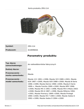 Karta produktu ZRS-114 Symbol: ZRS-114 Producent: 4CARMEDIA Parametry produktu Typ złącza samochodowego: Rodzaj złącza: Przeznaczenie marka samochodu: do radioodbiorników fabrycznych ISO Mazda Przeznaczenie - Mazda 121 1991->1996, Mazda 323 1989->2001, Mazda model samochodu: 626 1987->2000, Mazda 929 1988->2000, Mazda B-Serie 1996->1999, Mazda Demio 1998->2000, Mazda E-Serie 1999->, Mazda Familia 1990->2000, Mazda MPV 1996>2000, Mazda MX-3 1991->1998, Mazda MX-5 Miata 2003>2008, Mazda MX-6 1987->1998, Mazda Millenia 1994>2001, Mazda Premacy 1999->2000, Mazda Protegé 1990->2000, Mazda RX-7 1993->2000, Mazda Xedos 6 1992->1999, Mazda Xedos 9 1994->2000 Strona: 1 http://pl.4carmedia.com/product/4carmedia/zlacze/zrs-114 Karta produktu ZRS-114 Ilość pinów: 20 Informacje dodatkowe Masa brutto: Strona: 2 0,042 kg http://pl.4carmedia.com/product/4carmedia/zlacze/zrs-114