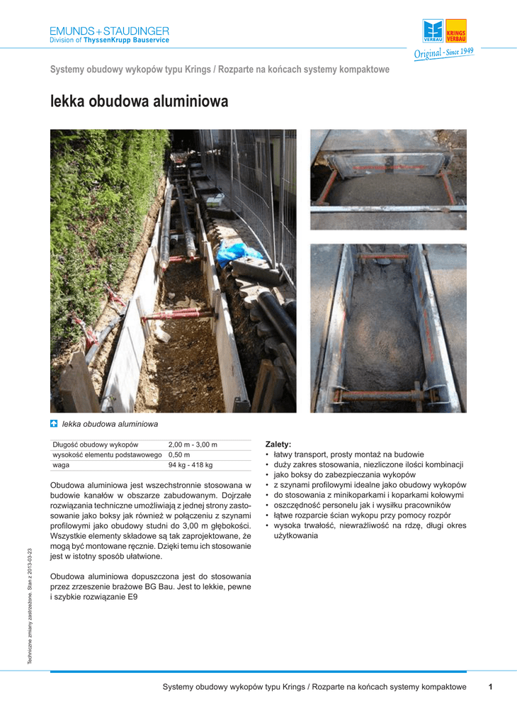 Systemy obudowy wykopów typu Krings / Rozparte na końcach systemy kompaktowe lekka obudowa aluminiowa lekka obudowa aluminiowa Techniczne zmiany zastrzeżone. Stan z 2013-03-23 Długość obudowy wykopów 2,00 m - 3,00 m wysokość elementu podstawowego 0,50 m waga 94 kg - 418 kg Obudowa aluminiowa jest wszechstronnie stosowana w budowie kanałów w obszarze zabudowanym. Dojrzałe rozwiązania techniczne umożliwiają z jednej strony zastosowanie jako boksy jak również w połączeniu z szynami profilowymi jako obudowy studni do 3,00 m głębokości. Wszystkie elementy składowe są tak zaprojektowane, że mogą być montowane ręcznie. Dzięki temu ich stosowanie jest w istotny sposób ułatwione. Zalety: • łatwy transport, prosty montaż na budowie • duży zakres stosowania, niezliczone ilości kombinacji • jako boksy do zabezpieczania wykopów • z szynami profilowymi idealne jako obudowy wykopów • do stosowania z minikoparkami i koparkami kołowymi • oszczędność personelu jak i wysiłku pracowników • łątwe rozparcie ścian wykopu przy pomocy rozpór • wysoka trwałość, niewrażliwość na rdzę, długi okres użytkowania Obudowa aluminiowa dopuszczona jest do stosowania przez zrzeszenie brażowe BG Bau. Jest to lekkie, pewne i szybkie rozwiązanie E9 Systemy obudowy wykopów typu Krings / Rozparte na końcach systemy kompaktowe 1 lekka obudowa aluminiowa lekka obudowa aluminiowa wysokość element długość długość przelotu dla rur b bc hc tpl szerokość obudowy szerokość światła wysokość przelotu dla rur grubość płyt lekka obudowa aluminiowa (wszystkie wymiary w mm) 2 Systemy obudowy wykopów typu Krings / Rozparte na końcach systemy kompaktowe Techniczne zmiany zastrzeżone. Stan z 2013-03-23 I, II HB l lc lekka obudowa aluminiowa elementy podstawowe Art.-Nr. krótki opis l [m] h [m] hc [m] G / VP [kg] 805 400 płyta aluminiowa 2,00 0,50 0,22 31,5 805 500 płyta aluminiowa 3,00 0,50 0,22 43,6 elementy przedłużające Art.-Nr. krótki opis 118 050 KVL rozpora Typ A, SP KVL - 70x600 0,465 - 0,670 l [m] G [kg] 9,0 118 080 KVL rozpora Typ B, SP KVL - 70x800 0,665 - 1,070 13,1 118 010 KVL rozpora Typ C, SP KVL - 70x1180 1,065 - 1,870 18,3 118 060 KVL rozpora Typ A, SP KVL - 70x650 0,523 - 0,617 12,2 118 070 KVL rozpora Typ B, SP KVL - 70x740 0,613 - 0,797 13,4 118 090 KVL rozpora Typ C, SP KVL - 70x920 0,799 - 1,161 15,8 118 020 KVL rozpora Typ D, SP KVL - 70x1280 1,153 - 1,878 20,5 118 100 KVL rozpora Typ E, SP KVL - 70x1470 1,339 - 2,254 25,4 szerokość wykopu Art.-Nr. krótki opis posuw [m] bc [m] b [m] 118 050 KVL rozpora Typ A, SP KVL - 70x600 0,205 0,475 - 0,680 0,575 - 0,780 118 080 KVL rozpora Typ B, SP KVL - 70x800 0,405 0,675 - 1,080 0,775 - 1,180 118 010 KVL rozpora Typ C, SP KVL - 70x1180 0,805 1,075 - 1,880 1,175 - 1,980 118 060 KVL rozpora Typ A, SP KVL - 70x650 0,094 0,533 - 0,627 0,633 - 0,727 118 070 KVL rozpora Typ B, SP KVL - 70x740 0,184 0,623 - 0,807 0,723 - 0,907 118 090 KVL rozpora Typ C, SP KVL - 70x920 0,362 0,809 - 1,171 0,909 - 1,271 118 020 KVL rozpora Typ D, SP KVL - 70x1280 0,725 1,163 - 1,888 1,263 - 1,988 118 100 KVL rozpora Typ E, SP KVL - 70x1470 0,915 1,349 - 2,264 1,449 - 2,364 wyposażenie / części zapasowe Art.-Nr. krótki opis 138 030 bolec 125 x 20 888 407 Coupler for Aluminium/Flex shoring 888 405 Coupler for Aluminium/Flex shoring 138 200 wtyczka sprężynowa 92 x 5 długość wysokość płyty grubość płyty G G / VP G [kg] 0,125 0,4 0,83 14,0 1,33 21,4 0,092 0,1 d [m] norma 0,020 0,005 waga waga / płyty Techniczne zmiany zastrzeżone. Stan z 2013-03-23 l h tpl l [m] Systemy obudowy wykopów typu Krings / Rozparte na końcach systemy kompaktowe 3