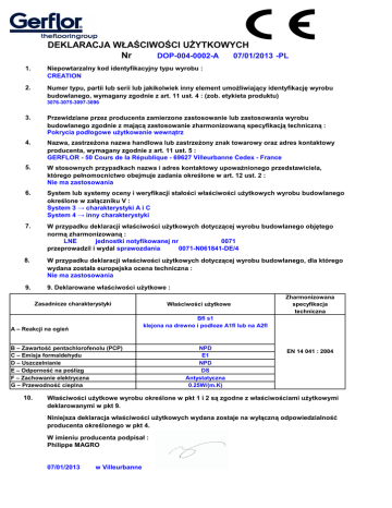 DEKLARACJA WŁAŚCIWOŚCI UŻYTKOWYCH Nr DOP-004-0002-A 07/01/2013 -PL 1. Niepowtarzalny kod identyfikacyjny typu wyrobu : CREATION 2. Numer typu, partii lub serii lub jakikolwiek inny element umożliwiający identyfikację wyrobu budowlanego, wymagany zgodnie z art. 11 ust. 4 : (zob. etykieta produktu) 3076-3075-3097-3096 3. Przewidziane przez producenta zamierzone zastosowanie lub zastosowania wyrobu budowlanego zgodnie z mającą zastosowanie zharmonizowaną specyfikacją techniczną : Pokrycia podłogowe użytkowanie wewnątrz 4. Nazwa, zastrzeżona nazwa handlowa lub zastrzeżony znak towarowy oraz adres kontaktowy producenta, wymagany zgodnie z art. 11 ust. 5 : GERFLOR - 50 Cours de la République - 69627 Villeurbanne Cedex - France 5. W stosownych przypadkach nazwa i adres kontaktowy upoważnionego przedstawiciela, którego pełnomocnictwo obejmuje zadania określone w art. 12 ust. 2 : Nie ma zastosowania 6. System lub systemy oceny i weryfikacji stałości właściwości użytkowych wyrobu budowlanego określone w załączniku V : System 3 → charakterystyki A i C System 4 → inny charakterystyki 7. W przypadku deklaracji właściwości użytkowych dotyczącej wyrobu budowlanego objętego normą zharmonizowaną : LNE jednostki notyfikowanej nr 0071 przeprowadzil i wydal sprawozdania 0071-N061841-DE/4 8. W przypadku deklaracji właściwości użytkowych dotyczącej wyrobu budowlanego, dla którego wydana została europejska ocena techniczna : Nie ma zastosowania 9. 9. Deklarowane właściwości użytkowe : Zasadnicze charakterystyki Właściwości użytkowe Bfl s1 klejona na drewno i podłoze A1fl lub na A2fl A – Reakcji na ogień B – Zawartość pentachlorofenolu (PCP) C – Emisja formaldehydu D – Uszczelnianie E – Odporność na poślizg F – Zachowanie elektryczna G – Przewodność cieplna 10. Zharmonizowana specyfikacja techniczna NPD E1 NPD DS Antystatyczna 0.25W/(m.K) EN 14 041 : 2004 Właściwości użytkowe wyrobu określone w pkt 1 i 2 są zgodne z właściwościami użytkowymi deklarowanymi w pkt 9. Niniejsza deklaracja właściwości użytkowych wydana zostaje na wyłączną odpowiedzialność producenta określonego w pkt 4. W imieniu producenta podpisał : Philippe MAGRO 07/01/2013 w Villeurbanne