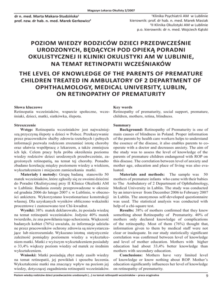 Magazyn Lekarza Okulisty 2/2007 dr n. med. Marta Makara-Studzińska1 prof. nzw. dr hab. n. med. Marek Gerkowicz2 Klinika Psychiatrii AM w Lublinie kierownik: prof. dr hab. n. med. Marek Masiak 2 II Klinika Okulistyki AM w Lublinie p.o. kierownik: dr n. med. Wojciech Kątski 1 Poziom wiedzy rodziców dzieci przedwcześnie urodzonych, będących pod opieką Poradni Okulistycznej II Kliniki Okulistyki AM w Lublinie, na temat retinopatii wcześniaków The level of knowledge of the parents of premature children treated in Ambulatory of 2 Department of Ophthalmology, Medical University, Lublin, on retinopathy of prematurity Słowa kluczowe Key words Retinopatia wcześniaków, wsparcie społeczne, wcze- Retinopathy of prematurity, social support, premature, śniaki, dzieci, matki, siatkówka, ślepota. children, mothers, retina, blindness. Streszczenie Wstęp: Retinopatia wcześniaków jest najważniejszą przyczyną ślepoty u dzieci w Polsce. Przekazywanie przez pracowników służby zdrowia rzetelnych i pełnych informacji pozwala rodzicom zrozumieć istotę choroby oraz ułatwia współpracę z lekarzem, a także zmniejsza ich lęk. Celem pracy była próba określenia poziomu wiedzy rodziców dzieci urodzonych przedwcześnie, zagrożonych retinopatią, na temat tej choroby. Ponadto zbadano korelację między poziomem wiedzy a wiekiem, wykształceniem i miejscem zamieszkania matki. Materiały i metody: Grupę badaną stanowiło 50 matek wcześniaków, które zgłosiły się ze swoimi dziećmi do Poradni Okulistycznej przy II Klinice Okulistki AM w Lublinie. Badania zostały przeprowadzone w okresie od grudnia 2006 do lutego 2007 r. w Lublinie, w obecności ankietera. Wykorzystano kwestionariusz konstrukcji własnej. Dla uzyskanych wyników obliczono wskaźniki procentowe i zastosowano test Chi-kwadrat. Wyniki: 38% matek deklarowało, że posiada wiedzę na temat retinopatii wcześniaków. Jedynie 40% matek twierdziło, że zna powikłania tego schorzenia. Większość badanych kobiet (76%) uważała, że informacje udzielane przez pracowników ochrony zdrowia są niewystarczające lub niezrozumiałe. Wykazano istotną statystycznie zależność pomiędzy poziomem wiedzy a wykształceniem matki. Matki z wyższym wykształceniem posiadały o 33,4% większy poziom wiedzy od matek ze średnim wykształceniem. Wnioski: Matki posiadają zbyt mały zasób wiedzy na temat retinopatii, jej powikłań i sposobu leczenia. Wykształcenie matki ma znaczący wpływ na poziom jej wiedzy, dotyczącej zagadnienia retinopatii wcześniaków. Summary Background: Retinopathy of Prematurity is one of main causes of blindness in Poland. Proper information of the parents by health care workers helps to understand the essence of the disease, it also enables parents to cooperate with a doctor and decreases anxiety. The aim of the study was to assess the level of knowledge of the parents of premature children endangered with ROP on this disease. The correlation between level of anxiety and mother age, education and place of living was also evaluated. Materials and methods: The sample was 50 mothers of premature infants who came with their babies to The Ambulatory of 2 Department of Ophthalmology, Medical University in Lublin. The study was conducted by an interviewer from December 2006 to February 2007 in Lublin. The anonymous self-developed questionnaire was used. The statistical analysis was conducted with help of a chi-square test. Results: 38% of mothers confirmed that they knew something about Retinopathy of Prematurity. 40% of mothers only declared knowledge of complications of the retinopathy. Most of them (76%) thought that, information given to them by medical staff were not clear or inadequate. In our study statistically significant correlation was confirmed between level of knowledge and level of mother education. Mothers with higher education had about 33,4% better knowledge than mothers with secondary education. Conclusions: Mothers have very limited level of knowledge or know nothing about ROP. Mother’s education significantly influences her level of knowledge on retinopathy of prematurity. Poziom wiedzy rodziców dzieci przedwcześnie urodzonych (...) na temat retinopatii wcześniaków – praca oryginalna 9