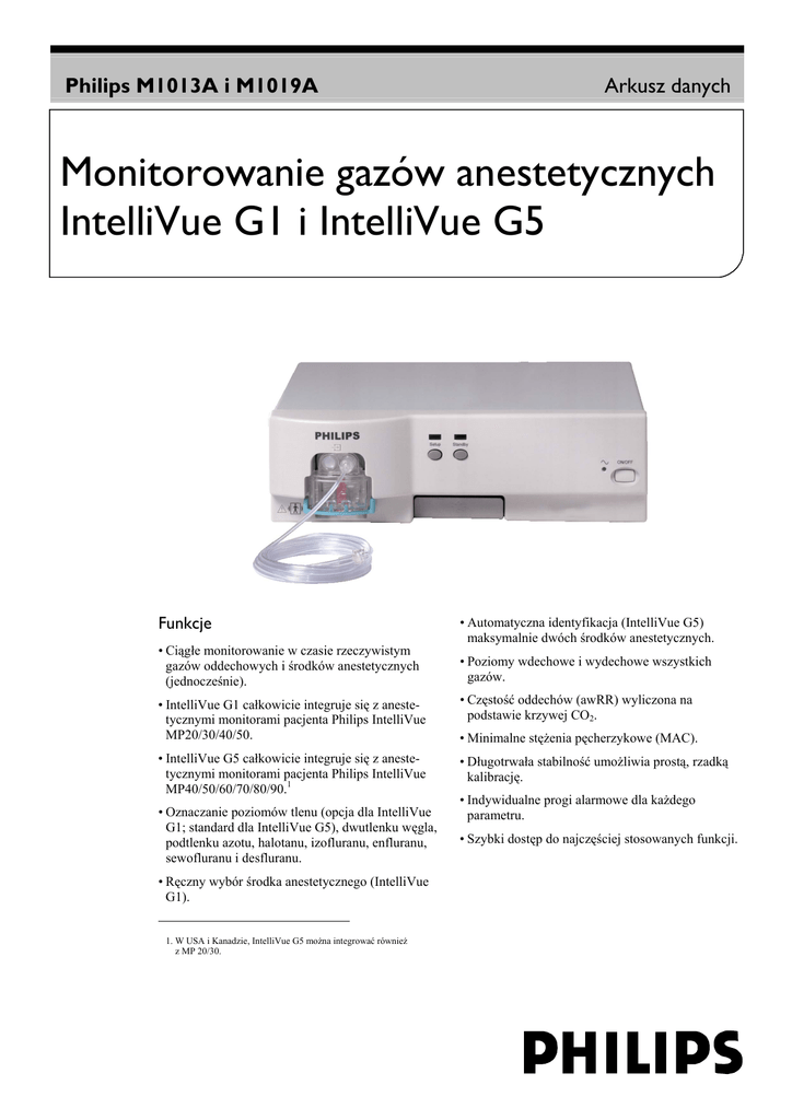 Philips M1013A i M1019A Arkusz danych Monitorowanie gazów anestetycznych IntelliVue G1 i IntelliVue G5 Funkcje • Ciągłe monitorowanie w czasie rzeczywistym gazów oddechowych i środków anestetycznych (jednocześnie). • IntelliVue G1 całkowicie integruje się z anestetycznymi monitorami pacjenta Philips IntelliVue MP20/30/40/50. • IntelliVue G5 całkowicie integruje się z anestetycznymi monitorami pacjenta Philips IntelliVue MP40/50/60/70/80/90.1 • Oznaczanie poziomów tlenu (opcja dla IntelliVue G1; standard dla IntelliVue G5), dwutlenku węgla, podtlenku azotu, halotanu, izofluranu, enfluranu, sewofluranu i desfluranu. • Ręczny wybór środka anestetycznego (IntelliVue G1). 1. W USA i Kanadzie, IntelliVue G5 można integrować również z MP 20/30. • Automatyczna identyfikacja (IntelliVue G5) maksymalnie dwóch środków anestetycznych. • Poziomy wdechowe i wydechowe wszystkich gazów. • Częstość oddechów (awRR) wyliczona na podstawie krzywej CO2. • Minimalne stężenia pęcherzykowe (MAC). • Długotrwała stabilność umożliwia prostą, rzadką kalibrację. • Indywidualne progi alarmowe dla każdego parametru. • Szybki dostęp do najczęściej stosowanych funkcji. Opis Uwaga: Prawo federalne USA zezwala na sprzedaż tego urządzenia przez lekarzy bądź na zlecenie lekarza. Moduł M1013A IntelliVue G1, a także M1019A IntelliVue G5 wykonuje pomiary gazów oddechowych i anestetycznych, wykorzystując technikę pomiaru zwaną „non-dispersive infrared” oraz pomiar stężenia tlenu czujnikiem paramagnetycznym (Fast O2). Środowiskowe dane techniczne Temperatura robocza 10 do 40 °C (50 do 104 °F). IntelliVue G1 został skonstruowany do pracy z monitorami pacjenta Philips IntelliVue MP20/30/ 40/50 z opcją anestetyczną #H30 a IntelliVue G5 z monitorem Philips MP40/50/60/70/80/901 z opcją anestetyczną #H30, do których jest podłączany poprzez interfejs szeregowy (RS232). Archiwizacja -20 do 65 °C (-4 do 149 °F). Wilgotność podczas pracy maksymalnie 5 do 90 % RH przy 40 °C (104 °F). Obydwa analizatory gazów są przeznaczone do oznaczania poziomów gazów oddechowych u pacjentów wentylowanych mechanicznie w trakcie indukcji, podtrzymania i wychodzenia ze znieczulenia ogólnego. Wilgotność podczas przechowywania maksymalnie 5 do 95 % RH przy 65 °C (149 °F). Wysokość n.p.m. podczas pracy Analizatory gazów opracowują krzywe O2, CO2, N2O i środków anestetycznych, a także dane numeryczne wdechowych i końcowo-wydechowych poziomów O2, CO2, N2O, środków anestetycznych, wartości MAC i częstości oddechów (pomiar w drogach oddechowych). –305 do 2900 m, (–1000 do 9515 ft). Wysokość n.p.m. podczas składowania –305 do 5000 m, (–1000 do 16404 ft). W przypadku IntelliVue G1, aby pomiar poziomu środka anestetycznego był możliwy, należy go wybrać ręcznie. Prędkość przepływu próbki 200 ml/min. (± 20 ml/min.). IntelliVue G5 potrafi automatycznie zidentyfikować dwa spośród pięciu środków anestetycznych jednocześnie. Czas nagrzewania 1 - 2 minuty do pomiaru CO2, zazwyczaj krócej niż 6 minut do uzyskania pełnej dokładności. Automatyczne zerowanie, niezbędne dla zapewnienia wysokiej dokładności pomiarów, jest przeprowadzane przez moduły gazów anestetycznych IntelliVue G1 i IntelliVue G5, stosownie do potrzeb. Interfejs RS-232-C (RJ45) Dane techniczne Odstęp kalibracji Test kalibracji gazów wykonywany co rok. Kalibracja jest stabilna i normalnie wymaga jedynie kontroli. Parametry fizyczne Wymiary (Wys. x Szer. x Głęb.) 85 x 300 x 232 mm, (3,35 x 11,81 x 9,13 cala). Jednostki Waga mmHg, kPa, vol% dla wszystkich gazów (poza CO2, bez vol%). < 4 kg (8,8 lb.) netto. Bezpieczeństwo Wymagania odnośnie mocy Spełnia wymagania: • Napięcie wejściowe: 100 do 240 V ±10% ac. • IEC/EN 60601-1 • UL 60601-1 • CSA C22.2 No. 601.1-M90 • IEC/EN 60601-1-1 • IEC/EN 60601-1-2 • Częstotliwość: 50/60 Hz. • Pobór mocy: 45 VA max. 1. W USA i Kanadzie, IntelliVue G5 można integrować również z MP20/30. 2 Monitorowane gazy / parametry Mierzona częstość oddechów Wyliczona na podstawie krzywej CO2. • O2 Zakres • CO2 0 - 60 rpm. • Częstość oddechów (awRR) Dokładność • N2O ± 1 rpm. • Środki anestetyczne: halotan, enfluran, izofluran, sewofluran i desfluran. IntelliVue G1 potrafi jednocześnie mierzyć poziom jednego, ręcznie wybranego anestetyku. IntelliVue G1 potrafi jednocześnie mierzyć poziom dwóch, automatycznie wybranych anestetyków. Rozdzielczość 1rpm. Kryteria detekcji adaptacyjna wartość progowa • Minimalne stężenia pęcherzykowe (MAC) Pomiar podtlenku azotu Pomiar stężenia tlenu Zakres Zakres 0 do 100 vol%. 5 do 100 vol%. Dokładność1 Dokładność1 2,0 % + 8 % wartości względnej. ± 3 vol%. Rozdzielczość Rozdzielczość 1 vol%. 1 vol%. Czas narastania Czas narastania 500 ms (typowy).2 < 500 ms (typowy). Pomiar środka anestetycznego Pomiar dwutlenku węgla Moduły IntelliVue G1 i IntelliVue G5 potrafią zidentyfikować dowolny spośród wymienionych środków anestetycznych. Zakres 0 do 76 mmHg. W przypadku IntelliVue G1, środek anestetyczny musi być wybrany ręcznie. IntelliVue G5 potrafi automatycznie zidentyfikować dwa spośród wymienionych środków anestetycznych: Dokładność1 ±0,5 vol% lub 12% względnej, większa z wartości. Rozdzielczość 1 mmHg. Czas narastania 350 ms (typowy).2 1. Dane techniczne dokładności odnoszą się do warunków BTPS dla mmHg kPa i STPD dla vol% przy 40 - 60% wilgotności względnej. W przypadku stosowania linii M1658A tubing i skraplacza M1657B. 2. Z linią M1658A o długości 2,6 m i skraplaczem M1657B (10-90% odpowiedź skokowa) przy 25°C i wilgotności względnej 40%. Tabela 1: Pomiar środka anestetycznego Anestetyk Zakres (vol%) Dokładność Rozdzielczość (vol%) Czas narastania, typowy (ms) Halotan 0 – 8,5 0,15 vol% + 15,0% w. względnej 0,05 < 500 Enfluran 0 – 10,0 0,15 vol% + 15,0% w. względ