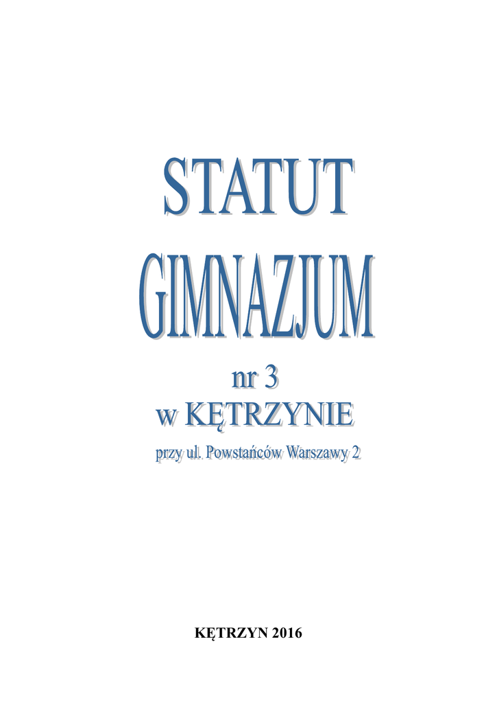KĘTRZYN 2016 ROZDZIAŁ I Nazwa i typ szkoły §1 Szkoła nosi nazwę: Gimnazjum nr 3 w Kętrzynie przy ul. Powstańców Warszawy 2 §2 1. Organem prowadzącym Gimnazjum jest Powiat Kętrzyński. 2. Nadzór pedagogiczny nad Gimnazjum sprawuje Warmińsko - Mazurski Kurator Oświaty. §3 Gimnazjum, zwane w statucie szkołą jest szkołą publiczną w myśl art. 7 Ustawy z dnia 7 września 1991 r. o systemie oświaty (tekst jednolity: Dz. U. z 2015 r., poz. 2156 ze zm.) i stanowi jednostkę budżetową. ROZDZIAŁ II Inne informacje o szkole §4 1. Czas trwania cyklu kształcenia zgodnie z przepisami w sprawie ramowych planów nauczania wynosi 3 lata. 2. Szkoła może prowadzić oddziały sportowe i językowe. W przypadku tworzenia oddziałów sportowych szczegółowe zasady ich funkcjonowania zostaną wprowadzone w trybie zmiany do statutu, a programy szkolenia będą tworzone z uwzględnieniem przepisów ustawy z dnia 18 stycznia 1996 r. o kulturze fizycznej. 3. Szkoła na podstawie odrębnych przepisów może prowadzić innowacje pedagogiczne i eksperymenty. W przypadku wprowadzania takiej działalności jej organizacja zostanie określona w trybie zmiany do statutu szkoły. ROZDZIAŁ III Cele i zadania szkoły §5 Szkoła realizuje cele i zadania określone w Ustawie o systemie oświaty, wydanych na jej podstawie aktach wykonawczych oraz programie wychowawczym szkoły, w szczególności: 1. wspomagając rozwój ucznia: a) wprowadza w świat nauki poprzez poznanie języka, pojęć, twierdzeń i metod właściwych dla wybranych dyscyplin naukowych na poziomie umożliwiającym dalsze kształcenie, b) rozbudza i rozwija indywidualne zainteresowania ucznia, c) wprowadza w dziedzictwo kultury, sztuki regionalnej i narodowej postrzeganej w perspektywie kultury europejskiej; 2. wprowadzając ucznia w życie społeczne: a) uczy szacunku dla dobra wspólnego jako podstawy życia społecznego, b) przygotowuje do życia w rodzinie, w społeczności lokalnej i państwie w duchu przekazu dziedzictwa kulturowego i kształtowania postaw patriotycznych, c) rozwija umiejętności społeczne poprzez zdobywanie prawidłowych doświadczeń we współżyciu i współdziałaniu w grupie rówieśniczej, d) uruchamia odpowiednio do istniejących potrzeb działania profilaktyczne; 3. wypełniając funkcję opiekuńczą sprawuje opiekę nad uczniami odpowiednio do ich potrzeb i posiadanych możliwości. §6 Zadania opiekuńcze szkoły 1. Opiekę nad uczniami przebywającymi w szkole podczas zajęć obowiązkowych i pozalekcyjnych sprawuje wyznaczony do tego celu nauczyciel w ramach pracy dydaktycznej, wychowawczej i opiekuńczej. 2. Zasady sprawowania opieki podczas zajęć poza terenem szkoły i w trakcie wycieczek organizowanych przez szkołę przestrzegając zasad, że za bezpieczeństwo uczniów może być odpowiedzialny tylko nauczyciel tej szkoły, określają odrębne przepisy. 3. Porządek, czas i miejsce pełnienia dyżurów nauczycielskich w szkole odbywa się według opracowanego planu dyżurów na dany okres lub rok szkolny. 4. Szkoła udziela uczniom pomocy psychologicznej i pedagogicznej w celu wspomagania rozwoju psychicznego i efektywności uczenia się, w szczególności poprzez korygowanie odchyleń od normy, wyrównanie i korygowanie nauczania oraz eliminowanie przyczyn, przejawów zaburzeń, w tym zaburzeń zachowania. 5. Pomoc psychologiczna i pedagogiczna w szkole może być organizowana w formie: a) zajęć dydaktyczno – wyrównawczych i zajęć specjalistycznych (korekcyjno – kompensacyjnych, logopedycznych, socjoterapii oraz innych zajęć o charakterze terapeutycznym), b) świetlic terapeutycznych. 6. Zasady organizowania poszczególnych zajęć określają odrębne przepisy. 7. W szkole pomoc psychologiczną i pedagogiczną organizuje pedagog szkolny lub zatrudnieni w szkole specjaliści wspomagający proces nauczania i wychowania. 8. Za prawidłową organizację i przebieg pomocy psychologicznej i pedagogicznej odpowiedzialny jest dyrektor szkoły. 9. Uczniom z dysfunkcją narządu ruchu uniemożliwiającą lub utrudniającą uczęszczanie do szkoły, przewlekle chorym i innym stale lub okresowo niezdolnym do nauki i wychowania w warunkach szkolnych można organizować indywidualne nauczanie i wychowanie. 10. Indywidualne nauczanie i wychowanie organizuje się w miejscu pobytu ucznia w szczególności : w domu rodzinnym, rodzinie zastępczej. W szczególnie uzasadnionych przypadkach indywidualne nauczanie i wychowanie ucznia może być organizowane na terenie szkoły. 11. Zasady organizowania indywidualnego nauczania określają odrębne przepisy. 12. W celu umożliwienia uczniowi rozwijania szczególnych uzdolnień i zainteresowań poprzez dostosowanie zakresu i tematyki uczenia się do jego indywidualnych możliwości i potrzeb, dyrektor szkoły może zezwolić uczniowi na indywidualny program lub tok nauki. 13. Zasady i tryb udzielania zezwoleń na indywidualny program lub tok nauki określają odrębne przepisy. 14. W celu rozwijania zainteresowań uczniów szkoła może prowadzić zajęcia pozalekcyjne i nadobowiązkowe. Zasady organizowania tych zajęć określają odrębne przepisy. 15. Szkoła stosuje szczególne formy opieki i udzielania pomocy materialnej uczniom, którym z powodu różnych uwarunkowań rodzinnych lub losowych pomoc taka jest potrzebna. Formy udzielania pomocy: a) przyznawanie zasiłków losowych (z funduszu rady rodziców, budżetu szkoły), b) przyznawanie stypendium z budżetu szkoły, c) przyznawanie bezpłatnych lub częściowo płatnych obiadów, d) dofinansowanie do wypoczynku letniego lub zimowego ( z budżetu szkoły lub rady rodziców ). 16. Zasady przydziału pomocy materialnej określają odrębne przepisy. ROZDZIAŁ IV Organy szkoły §7 1. Organami szkoły są: a) dyrektor szkoły, b) rada pedagogiczna, c) rada rodziców, d) samorząd uczniowski. 2. Dyrektor szkoły. 2.1. Zasady powołania i odwołania dyrektora szkoły określają: art.36 i 