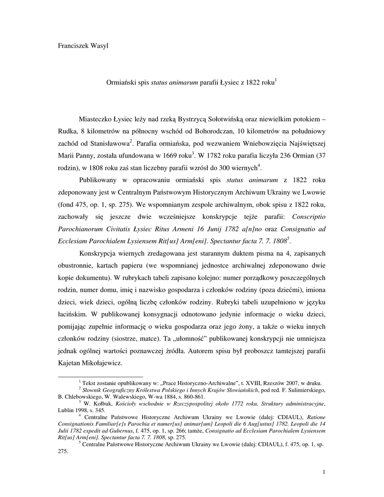 Franciszek Wasyl Ormiański spis status animarum parafii Łysiec z 1822 roku1 Miasteczko Łysiec leży nad rzeką Bystrzycą Sołotwińską oraz niewielkim potokiem – Rudka, 8 kilometrów na północny wschód od Bohorodczan, 10 kilometrów na południowy zachód od Stanisławowa2. Parafia ormiańska, pod wezwaniem Wniebowzięcia Najświętszej Marii Panny, została ufundowana w 1669 roku3. W 1782 roku parafia liczyła 236 Ormian (37 rodzin), w 1808 roku zaś stan liczebny parafii wzrósł do 300 wiernych4. Publikowany w opracowaniu ormiański spis status animarum z 1822 roku zdeponowany jest w Centralnym Państwowym Historycznym Archiwum Ukrainy we Lwowie (fond 475, op. 1, sp. 275). We wspomnianym zespole archiwalnym, obok spisu z 1822 roku, zachowały się jeszcze dwie wcześniejsze konskrypcje tejże parafii: Conscriptio Parochianorum Civitatis Łysiec Ritus Armeni 16 Junij 1782 a[n]no oraz Consignatio ad Ecclesiam Parochialem Lysiensem Rit[us] Arm[eni]. Spectantur facta 7. 7. 18085. Konskrypcja wiernych zredagowana jest starannym duktem pisma na 4, zapisanych obustronnie, kartach papieru (we wspomnianej jednostce archiwalnej zdeponowano dwie kopie dokumentu). W rubrykach tabeli zapisano kolejno: numer porządkowy poszczególnych rodzin, numer domu, imię i nazwisko gospodarza i członków rodziny (poza dziećmi), imiona dzieci, wiek dzieci, ogólną liczbę członków rodziny. Rubryki tabeli uzupełniono w języku łacińskim. W publikowanej konsygnacji odnotowano jedynie informacje o wieku dzieci, pomijając zupełnie informację o wieku gospodarza oraz jego żony, a także o wieku innych członków rodziny (siostrze, matce). Ta „ułomność” publikowanej konskrypcji nie umniejsza jednak ogólnej wartości poznawczej źródła. Autorem spisu był proboszcz tamtejszej parafii Kajetan Mikołajewicz. 1 Tekst zostanie opublikowany w: „Prace Historyczno-Archiwalne”, t. XVIII, Rzeszów 2007, w druku. Słownik Geograficzny Królestwa Polskiego i Innych Krajów Słowiańskich, pod red. F. Sulimierskiego, B. Chlebowskiego, W. Walewskiego, W-wa 1884, s. 860-861. 3 W. Kołbuk, Kościoły wschodnie w Rzeczypospolitej około 1772 roku. Struktury administracyjne, Lublin 1998, s. 345. 4 Centralne Państwowe Historyczne Archiwum Ukrainy we Lwowie (dalej: CDIAUL), Ratione Consignationis Familiar[e]s Parochia et numer[us] animar[um] Leopoli die 6 Aug[ustus] 1782. Leopoli die 14 Julii 1782 expedit ad Gubernus, f. 475, op. 1, sp. 266; tamże, Consignatio ad Ecclesiam Parochialem Lysiensem Rit[us] Arm[eni]. Spectantur facta 7. 7. 1808, sp. 275. 5 Centralne Państwowe Historyczne Archiwum Ukrainy we Lwowie (dalej: CDIAUL), f. 475, op. 1, sp. 275. 2 1 W publikowanej wersji konskrypcji dokonano drobnej zmiany redakcyjnej. Pominięto pierwszy wiersz – nagłówek tabeli (nazwy poszczególnych kolumn przytoczono wyżej). Status Animarum Ecclesiae Parochialis Lyscensis Armeni ritus Die 25 Februa[rius] [1]822 Anno Consignatus 1 2 2 3 3 4 6 5 6 7 8 Simeon a Samuel Moszoro Ripsima uxor 12 13 13 12 6 2 Dominicus Marczynski Cajetanna uxor Cajetanna soror 6 3 Nicolaus Kozinzki Joanna uxor Jzaacus Marianna 5 1 4 Domin. Huybab Ripsima uxor Anna Catharina Samuel 8 5 1 5 Nicolaus Rozalia Valerianus (...) 30 28 15 4 Anna Gregorius Gasparus 22 20 7 5 Samuel Ripsima Anna Cajetanus 13 10 8 3 6 Thomas Marianna 31 30 3 2 Anna Huybabowa Vidua 7 Ripsima Nicolaus Anna Samuel Christoph[orus] Mikołajewicz Ripsima uxor Valer[ianus] Moszoro Gertruda uxor Cajetanna Tomaszowa 9 33 Rosal[ia] Maramoroszowa Giertruda 3 10 50 Deodat Marczynski Ripsima uxor Dominicus Anna 22 20 2 Ripsima soror 11 12 54 55 Valerianus Nicolaus Jozepha Giertruda Cajetanna Antonina 15 11 18 14 9 6 4 Marianna Joanna Rozalia Simeon 19 14 4 1 6 Melch(...) Stefanowicz Cajetanna uxor Rozalia 3 Nicolaus Moszoro Cajetanna uxor 7 3 13 56 Ripsima Pawełecka Marianna 1 2 14 57 Ripsi[ma] Janiewiczowa Cajetanus Antonius gemini 36 36 3 Christoph[orus] Awakowicz Marianna uxor Dominicus Ripsima 4 1 4 Jzaacus Kozimzki Marianna uxor Jozephus Rozalia Jzaacus 1 5 Rozal. Mikołaiewiczowa Zoph. Muniekiewiczowa Brigida 9 Samuel Awakowicz Rozalia Christophorus Adamus Marianna Tecla Jozephus Cajetanus Stephanus 25 23 35 21 9 7 5 9 Valerianus Samuel Cajetanus Gregorius Anna Dominicus Marianna 16 15 14 10 5 3 1 9 Rozalia Michael 30 15 3 Ripsima 1 15 16 17 18 19 20 21 59 60 61 62 64 67 Deodatus Zukowski Marianna uxor Ripsima Lewandowzka Christop[horus] Birar 3 3 22 23 24 25 26 27 28 29 30 70 72 74 76 79 81 82 84 31 32 33 85 87 Marianna uxor 3 Gregorius Birar Marianna uxor 2 Michael Moszoro Cajetanna uxor Gregorius Rozalia Jozephus 13 12 5 5 Marcus Jozephus Christophorus Marianna Cajetanus Nicolaus Gregorius Giertruda 28 26 24 20 19 15 14 9 10 Gregorius Anna Rozalia 5 7 2 5 Deodatus Kozinski Marianna uxor Christophorus frater Jozephus Cajetanus 26 24 Antonius Marczynski Ripsima uxor Anna Anna Moszorowa Gregorius Nicolaus Cajetanus 35 31 15 4 Cajetanus Vincentius Ripsima 33 23 21 5 Stephanus Anna Antonius Deodatus 11 12 6 3 6 Catharina Awakowiczowa Stephanus 27 2 Samuel a Valeriano Kozinzki Cajetanna uxor Valerianus 2 Cajetanus Lewandozki Anna Deodat Krzysztofowicz Rozalia uxor Valer[ianus] Lewandozki Ripsima uxor Antonius Moszoro Jzabella uxor Samuel Kozinzki Cajetanna uxor 5 8 3 3 9 4 Rozalia uxor 34 35 36 38 39 40 41 89 90 91 94 95 97 99 Marian. Birarowa Gregorius Moszoro Helena uxor Anna Moszorowa mater Cajetanus Moszoro Anna uxor Stephan[us] Agopszowicz Giertruda Rozal[ia] Agopszowiczowa Catharina Marianna Rozalia 7 5 2 6 Veronica Jzaacus Valerianus Anna Rozalia 25 17 15 13 10 6 Anna Ripsima Antonina Nicolaus Joannes 12 10 8 7 5 8 Antonius Franciscus Andreas 26 15 12 5 Deodatus Rozalia Ripsima Christophorus Albina 8 6 4 3 1 8 Augusti Czuczawa Anna uxor 2 Christop[orus] Czuczawa Rozalia uxor Adamus Anna 13 2 4 Joannes Bogdanowicz Jozephus 8 2 42 Jzaacus Salamonowicz 1 44 26 (suburbius) Nicolae Marczynzki Cajetanna uxor Catharina Hordes 3 45 46 29 30 Jozep[anus] Bogdanowic