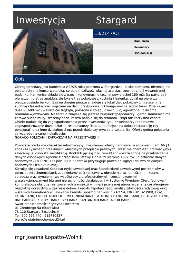Inwestycja Stargard 13/2147/OI Kamienica Secondary 350 000 PLN Opis Ofertą sprzedaży jest kamienica z 1928 roku położona w Stargardzie (blisko centrum), niemniej nie objęta ochroną konserwatorską, co daje możliwość własnej aranżacji zewnętrznej i wewnętrznej budynku. Kamienica składa się z trzech kondygnacji o łącznej powierzchni 180 m2. Na parterze i pierwszym piętrze znajdują się lokale trzy pokojowe z kuchnią i łazienką. Lokal na pierwszym piętrze posiada balkon. Zaś na drugim piętrze znajduje się lokal dwu pokojowy z miejscem na kuchnię i łazienkę oraz wyjściem na dach przybudówki z którego można zrobić taras. Działka jest duża – 1600 m2 i w kształcie trójkąta, położona u zbiegu dwóch ulic, ogrodzona i z dwoma bramami wjazdowymi. Na terenie znajduje się jeszcze budynek gospodarczy i garaż. Kamienica ma zdrowe suche mury, szczelny dach, reszta nadaje się do remontu - stąd tak korzystna cena!!! Obiekt nadaje się do zagospodarowania przez inwestorów typu deweloperzy (dodatkowe zagospodarowanie dużej działki), restauratorzy (kapitalne miejsce na dobrą restaurację czy pensjonat) oraz inne działalności np. przedszkole czy prywatna szkoła, itp. Oferta godna polecenia ze względu na cenę i lokalizację. GORĄCO POLECAM I ZAPRASZAM NA PREZENTACJĘ!!! Powyższa oferta ma charakter informacyjny i nie stanowi oferty handlowej w rozumieniu art. 66 §1 kodeksu cywilnego oraz innych właściwych przepisów prawnych. Treść ma charakter informacyjny i zalecamy jej osobistą weryfikację. Kontaktując się z biurem Klient wyraża zgodę na przetwarzanie danych osobowych zgodnie z przepisami ustawy z dnia 29 sierpnia 1997 roku o ochronie danych osobowych / Dz.U.Nr. 133 poz. 883/. Klientowi przysługuje prawo do wglądu do swoich danych osobowych i ich aktualizacji. Kierując się zasadami Kodeksu etyki zawodowej oraz Standardami zawodowymi pośredników w obrocie nieruchomościami, zapewniamy pośrednictwo w obrocie nieruchomościami - kupno, sprzedaż oraz wynajem - we współpracy z profesjonalnymi, licencjonowanymi i wyselekcjonowanymi biurami nieruchomości działającymi w Systemie Wymiany Ofert, fachową i kompleksową obsługę realizowanych transakcji w miłej i przyjaznej atmosferze, a także oferujemy bezpłatne doradztwo w zakresie doboru kredytu hipotecznego, analizy zdolności kredytowej oraz wszelkich formalności w uzyskaniu kredytu spośród banków PEKAO SA, PKO BP, BZ WBK, BGŻ, GETIN BANK, CREDIT AGRICOLE, MILLENIUM BANK, GE MONEY BANK, ING BANK, DEUTSCHE BANK, BNP PARIBAS, KREDYT BANK, BPH BANK, SANTANDER BANK, ALIOR BANK. Świat Nieruchomości Krystyna Skworcow ul. Chrobrego 5a (Starówka) 73-110 Stargard Szczeciński Tel: 500 296 440 , 915780827 [email protected] mgr Joanna Łopatto-Wolnik Świat Nieruchomości Krystyna Skworcow sp-ka z o.o. tel. 500 840 233 tel. 91 578 0827 email: [email protected] Świat Nieruchomości Krystyna Skworcow sp-ka z o.o. Powered by TCPDF (www.tcpdf.org)