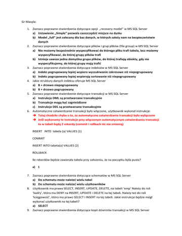 1. Zaznacz poprawne stwierdzenia dotyczące opcji „recovery model” w MS SQL Server