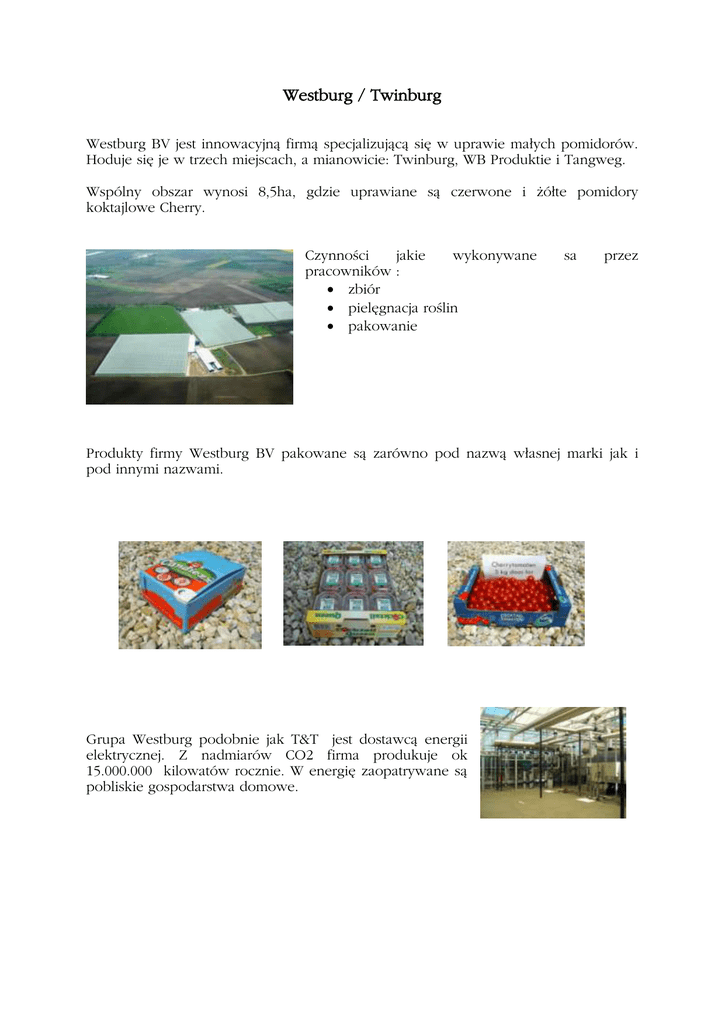 Westburg / Twinburg Westburg BV jest innowacyjną firmą specjalizującą się w uprawie małych pomidorów. Hoduje się je w trzech miejscach, a mianowicie: Twinburg, WB Produktie i Tangweg. Wspólny obszar wynosi 8,5ha, gdzie uprawiane są czerwone i żółte pomidory koktajlowe Cherry. Czynności jakie wykonywane pracowników : zbiór pielęgnacja roślin pakowanie sa przez Produkty firmy Westburg BV pakowane są zarówno pod nazwą własnej marki jak i pod innymi nazwami. Grupa Westburg podobnie jak T&T jest dostawcą energii elektrycznej. Z nadmiarów CO2 firma produkuje ok 15.000.000 kilowatów rocznie. W energię zaopatrywane są pobliskie gospodarstwa domowe. Program stażu: Tydzień 1: Zapoznanie się z zakładem i pracownikami Poznanie zasad bezpieczeństwa. Poznanie stanowiska pracy. Zapoznanie się z gatunkami pomidorów uprawianych w firmie T&T. Poznanie sposobu określania koloru pomidora oraz klasyfikacji. Tydzień 2: Uzyskanie informacji na temat chorób pomidora koktailowego i sposobów zwalczania szkodników. Zapoznanie się z metodami regulowania warunków mikroklimatu w szklarni. Zapoznanie się z komputerowym systemem do identyfikacji pracowników. Przyuczenie do zbioru. Tydzień 3: Ręczny zbiór pomidorów: zbierane są tylko pomidory o odpowiednim zabarwieniu. Zbiór powinien być wykonywany w sposób staranny, tak aby nie uszkodzić skórki. Tydzień 4: Podwiązywanie roślin pomidora: w tym celu używa się sznurka sizalowego lub polipropylenowego o grubości 3-4 mm. Zawiązuje się go luźno w odległości ok. 10 cm od szyjki korzeniowej, a następnie metalowym zaczepem przytwierdza do drutu przeciągniętego poziomo nad rzędem roślin na wysokości 190-210 cm. Sznurek z pędem łączą specjalne plastikowe klipsy. W miarę wzrostu sznurek okręca się wokół roślin Redukcja pędów bocznych mająca na celu przyśpieszenie dojrzewania warzyw oraz poprawe zdrowotności roślin( lepsze wietrzenie i osuszanie rośliny, poprawa warunków świetlnych w dolnych partiach roślin). Pędy boczne powinny być usuwane zanim przekroczą długość 5 cm. Redukcja liści z każdego grona (jednorazowo usuwa się 3-4 liście). Ręczny zbiór pomidora. Tydzień 5: Poznanie optymalnych warunków do uprawy pomidora (zapoznanie się z systemem grzewczym, systemem oswietleniowym). Zapoznanie się ze sposobem nawadniania, z wymaganiami pokarmowymi i potrzebami nawozowymi. Zapoznanie sie z metodami prowadzenia roślin. Poznanie szkodników występujących w szkarni oraz sposobów ich zwalczania. Ręczny zbiór pomidora. Tydzień 6: Redukcja liści z każdego grona pomidora. Ręczny zbiór pomidora. Zapoznanie się z metodami przechowywania i magazynowania pomidorów. Zapoznanie się z sortownią oraz poznanie metod sortowania owoców pomidora. Tydzień 7: Zapoznanie się z metodami pakowania pomidorów (w jednym opakowaniu powinny znajdować się owoce o zbliżonych cechach odmianowych, równomiernie wybarwione). Poznanie sieci odbiorców produktów firmy T&T. Poznanie warunków transportu pomidorów. Ręczny zbiór pomidora. Tydzień 8: Zapoznanie się ze sposobami szczepienia roślin. Zabiegi pielęgnacyjne (redukcja liści i pędów bocznych). Podwiązywanie roślin pomidora. Ręczny zbiór pomidora. Tydzień 9: Zapoznanie się z metodami produkcji rozsady. Ręczny zbiór pomidora. Tydzień 10: Ręczny zbiór pomidora. Zapoznanie się z metodami sterowania nawozami. Podwiązywanie roślin pomidora. Tydzień 11: Ręczny zbiór pomidora. Zabiegi pielęgnacyjne (redukcja liści i pędów bocznych). Zapoznanie się z systemem do produkcji energii elektrycznej. Tydzień 12: Ręczny zbiór pomidora. Ogławianie: usuwanie wierzchołka pędu głównego, wykonuje się je na około 2 miesiące przed przewidywanym terminem zakończenia uprawy. W zakładzie zwraca się dużą uwagę na bezpieczeństwo. Dlatego zainwestowano w tak zwane wózki do zbiorów. Zbiór pomidorów obejmuje większą część programu stażowego. Daje to możliwość opanowania dobrej techniki zrywania. Każdy pracownik ma przydzielony numer, który służy do identyfikacji i rejestracji wielkości zbioru. W firmie stosuje się pełną kontrolę wielkości zbiorów. Zbiory są rejestrowane komputerowo i podsumowywane tygodniowo. Firma stosuje metodę motywacyjną, polegającą na dodatkowym wynagrodzeniu dla osób, które uzyskują wysokie zbiory. Ponadto w zakładzie istnieje system rejestrujący ścieżki, co pozwala na podjęcie stosownych decyzji w trakcie trwania zbioru. Rejestrowane jest także nawadnianie i dozowanie substancji odżywczych, niezbędnych do szybkiego wzrostu pomidora. Ten nowoczesny zakład, posiadający profesjonalne zaplecze techniczne daje świetne możliwości zdobycia doświadczenia przy uprawie pomidorów, poznania metod sortowania, przechowywania i transportowania pomidorów. Jednym słowem komputer rejestruje wszystko to, co dzieję się w szklarni. Cyfry i dane, które wynikają z rejestracji komputerowej przyczyniają się do perfekcyjnej analizy w odniesieniu do: klimatu, chorób, zbiorów, produkcji, temperatury w szklarni i zmniejszenia emisji CO2 . Zakład jest wyposażony w agregaty kogeneracyjne wytwarzające ciepło i energię elektryczna.