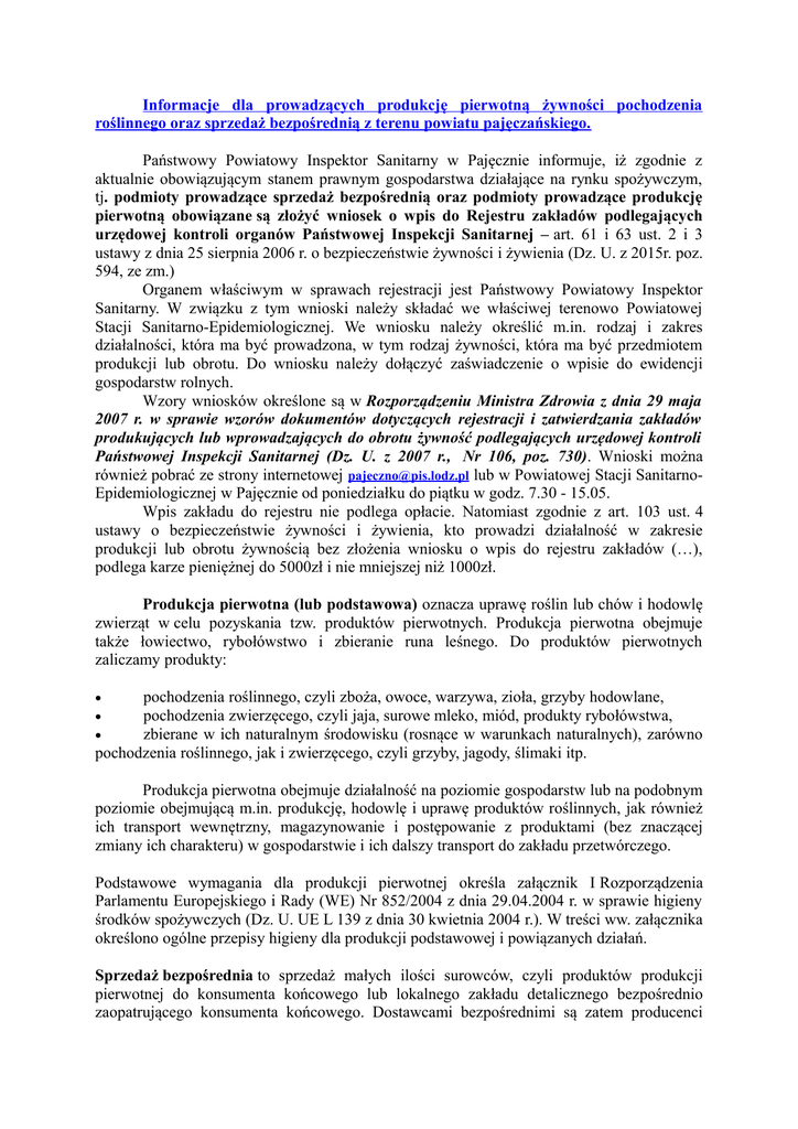 Informacje dla prowadzących produkcję pierwotną żywności pochodzenia roślinnego oraz sprzedaż bezpośrednią z terenu powiatu pajęczańskiego. Państwowy Powiatowy Inspektor Sanitarny w Pajęcznie informuje, iż zgodnie z aktualnie obowiązującym stanem prawnym gospodarstwa działające na rynku spożywczym, tj. podmioty prowadzące sprzedaż bezpośrednią oraz podmioty prowadzące produkcję pierwotną obowiązane są złożyć wniosek o wpis do Rejestru zakładów podlegających urzędowej kontroli organów Państwowej Inspekcji Sanitarnej – art. 61 i 63 ust. 2 i 3 ustawy z dnia 25 sierpnia 2006 r. o bezpieczeństwie żywności i żywienia (Dz. U. z 2015r. poz. 594, ze zm.) Organem właściwym w sprawach rejestracji jest Państwowy Powiatowy Inspektor Sanitarny. W związku z tym wnioski należy składać we właściwej terenowo Powiatowej Stacji Sanitarno-Epidemiologicznej. We wniosku należy określić m.in. rodzaj i zakres działalności, która ma być prowadzona, w tym rodzaj żywności, która ma być przedmiotem produkcji lub obrotu. Do wniosku należy dołączyć zaświadczenie o wpisie do ewidencji gospodarstw rolnych. Wzory wniosków określone są w Rozporządzeniu Ministra Zdrowia z dnia 29 maja 2007 r. w sprawie wzorów dokumentów dotyczących rejestracji i zatwierdzania zakładów produkujących lub wprowadzających do obrotu żywność podlegających urzędowej kontroli Państwowej Inspekcji Sanitarnej (Dz. U. z 2007 r., Nr 106, poz. 730). Wnioski można również pobrać ze strony internetowej [email protected] lub w Powiatowej Stacji SanitarnoEpidemiologicznej w Pajęcznie od poniedziałku do piątku w godz. 7.30 - 15.05. Wpis zakładu do rejestru nie podlega opłacie. Natomiast zgodnie z art. 103 ust. 4 ustawy o bezpieczeństwie żywności i żywienia, kto prowadzi działalność w zakresie produkcji lub obrotu żywnością bez złożenia wniosku o wpis do rejestru zakładów (…), podlega karze pieniężnej do 5000zł i nie mniejszej niż 1000zł. Produkcja pierwotna (lub podstawowa) oznacza uprawę roślin lub chów i hodowlę zwierząt w celu pozyskania tzw. produktów pierwotnych. Produkcja pierwotna obejmuje także łowiectwo, rybołówstwo i zbieranie runa leśnego. Do produktów pierwotnych zaliczamy produkty: pochodzenia roślinnego, czyli zboża, owoce, warzywa, zioła, grzyby hodowlane, pochodzenia zwierzęcego, czyli jaja, surowe mleko, miód, produkty rybołówstwa, zbierane w ich naturalnym środowisku (rosnące w warunkach naturalnych), zarówno pochodzenia roślinnego, jak i zwierzęcego, czyli grzyby, jagody, ślimaki itp. Produkcja pierwotna obejmuje działalność na poziomie gospodarstw lub na podobnym poziomie obejmującą m.in. produkcję, hodowlę i uprawę produktów roślinnych, jak również ich transport wewnętrzny, magazynowanie i postępowanie z produktami (bez znaczącej zmiany ich charakteru) w gospodarstwie i ich dalszy transport do zakładu przetwórczego. Podstawowe wymagania dla produkcji pierwotnej określa załącznik I Rozporządzenia Parlamentu Europejskiego i Rady (WE) Nr 852/2004 z dnia 29.04.2004 r. w sprawie higieny środków spożywczych (Dz. U. UE L 139 z dnia 30 kwietnia 2004 r.). W treści ww. załącznika określono ogólne przepisy higieny dla produkcji podstawowej i powiązanych działań. Sprzedaż bezpośrednia to sprzedaż małych ilości surowców, czyli produktów produkcji pierwotnej do konsumenta końcowego lub lokalnego zakładu detalicznego bezpośrednio zaopatrującego konsumenta końcowego. Dostawcami bezpośrednimi są zatem producenci małych ilości żywności nieprzetworzonej pochodzenia roślinnego, sprzedawanej konsumentowi finalnemu, tj. osobom indywidualnym, np. na targowiskach, placach targowych, w bramach własnych gospodarstw rolnych, handlu obwoźnym, jak również lokalnym sklepom i zakładom gastronomicznym (restauracje, bary, stołówki szkolne i inne). Dostawy bezpośrednie nie dotyczą produktów pierwotnych wprowadzanych do obrotu przez zakład podmiotu działającego na rynku w ramach prowadzonej działalności gospodarczej. Na podstawie art. 68 ust. 2 ustawy o bezpieczeństwie żywności i żywienia zostało wydane rozporządzenie Ministra Zdrowia z dnia 6 czerwca 2007 r. w sprawie dostaw bezpośrednich środków spożywczych (Dz. U. z 2007 r. Nr 112, poz. 774). Rozporządzenie to określa zakres działalności prowadzonej w ramach dostaw bezpośrednich środków spożywczych, w tym wielkość i obszar dostaw bezpośrednich oraz szczegółowe wymagania higieniczne dla działalności prowadzonej w ramach dostaw bezpośrednich żywności. W celu uzyskania szczegółowych informacji należy się zgłosić do Powiatowej Stacji Sanitarno-Epidemiologicznej w Pajęcznie.