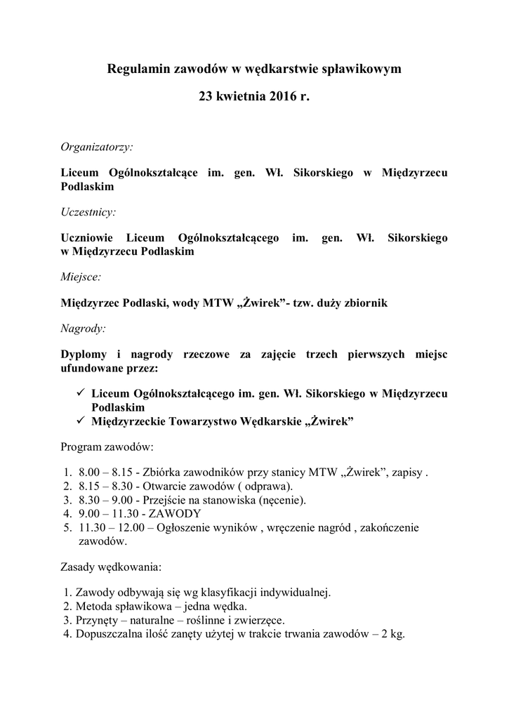 Regulamin zawodów w wędkarstwie spławikowym 23 kwietnia 2016 r. Organizatorzy: Liceum Ogólnokształcące im. gen. Wł. Sikorskiego w Międzyrzecu Podlaskim Uczestnicy: Uczniowie Liceum Ogólnokształcącego w Międzyrzecu Podlaskim im. gen. Wł. Sikorskiego Miejsce: Międzyrzec Podlaski, wody MTW „Żwirek”- tzw. duży zbiornik Nagrody: Dyplomy i nagrody rzeczowe za zajęcie trzech pierwszych miejsc ufundowane przez: Liceum Ogólnokształcącego im. gen. Wł. Sikorskiego w Międzyrzecu Podlaskim Międzyrzeckie Towarzystwo Wędkarskie „Żwirek” Program zawodów: 1. 2. 3. 4. 5. 8.00 – 8.15 - Zbiórka zawodników przy stanicy MTW „Żwirek”, zapisy . 8.15 – 8.30 - Otwarcie zawodów ( odprawa). 8.30 – 9.00 - Przejście na stanowiska (nęcenie). 9.00 – 11.30 - ZAWODY 11.30 – 12.00 – Ogłoszenie wyników , wręczenie nagród , zakończenie zawodów. Zasady wędkowania: 1. Zawody odbywają się wg klasyfikacji indywidualnej. 2. Metoda spławikowa – jedna wędka. 3. Przynęty – naturalne – roślinne i zwierzęce. 4. Dopuszczalna ilość zanęty użytej w trakcie trwania zawodów – 2 kg. 5. Punktacja – łączna waga złowionych ryb (w przypadku równej wagi ryb decyduje liczba złowionych ryb). 6. Zawodnicy zobowiązani są do posiadania regulaminowej siatki do przechowywania ryb. 7. Zawody rozgrywane są „na żywej rybie”. Uwagi organizacyjne: 1. Szczegółowe informacje dotyczące przebiegu zawodów – na odprawie przed rozpoczęciem zawodów. 2. Kwestie sporne w trakcie trwania zawodów rozstrzyga sędzia główny zawodów. 3. Organizator zabezpiecza teren zawodów. 4. Organizator nie ponosi odpowiedzialności za straty materialne poniesione w trakcie trwania zawodów. Zasady uczestnictwa: 1. W zawodach mogą uczestniczyć tylko uczniowie Liceum Ogólnokształcącego im. gen. Wł. Sikorskiego w Międzyrzecu Podlaskim. 2. Uczestnik powinien posiadać własny sprzęt wędkarski umożliwiający wędkowanie zgodnie z przyjętymi zasadami. 3. W trakcie zawodów obowiązują zasady bezpiecznego zachowania nad wodą. Wszelkie zagrożenia należy niezwłocznie zgłaszać organizatorowi. 4. Każdy uczestnik zawodów wypełnia kartę zgłoszenia (załącznik nr 1) wraz ze zgodą rodziców (opiekunów) na udział w zawodach. 5. Karty należy pobrać i złożyć w gabinecie wicedyrektora. 6. Brak karty zgłoszenia uniemożliwia uczestnictwo w zawodach. 7. Termin zgłaszania uczestnictwa w zawodach upływa 20 kwietnia 2016 r. 8. Organizator zastrzega sobie możliwość odwołania zawodów z przyczyn niezależnych. Załącznik nr 1 KARTA ZGŁOSZENIA Zgłaszam swój udział w otwartych zawodach w wędkarstwie spławikowym organizowanych przez Liceum Ogólnokształcące im. gen. Wł. Sikorskiego w Międzyrzecu Podlaskim w dniu 23 kwietnia 2016 r. na wodach MTW „Żwirek” w Międzyrzecu Podlaskim: Imię i nazwisko: ………………………………………….............................………..………… Klasa: ………………………………………………….......................………………………… Adres: ……………………………………...........................…………………………………… Tel.: ………………………………………........................……………….……………………. 1. Oświadczam, że zapoznałem/am się z regulaminem zawodów i akceptuję warunki uczestnictwa. 2. Wyrażam zgodę na przetwarzanie moich danych osobowych na potrzeby przeprowadzenia zawodów na warunkach określonych w ustawie z dnia 29 sierpnia 1997 r. o ochronie danych osobowych (t.j. Dz. U. z 2002 r., Nr 101, poz. 926, z późn. zm.). 3. Wyrażam zgodę na wykorzystanie mojego wizerunku na warunkach określonych w ustawie o prawach autorskich i prawach pokrewnych ( Dz.U. z 2015 poz. 932,994,1639,1923 z póź. zm.). ................................................................... miejscowość, data .................................................................... podpis uczestnika Oświadczenie rodziców ( opiekunów ) Wyrażam zgodę na udział mojego syna/córki* ........................................................................... ucznia/uczennicy* klasy ....................... na udział w zawodach w wędkarstwie spławikowym w dniu 23 kwietnia 2016 r. .................................................................................... miejscowość, data *- niepotrzebne skreślić ......................................................................................................... podpis rodzica (opiekuna)