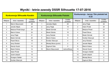 Wyniki - letnie zawody DSSR Silhouette 17-07-2016 Konkurencja Silhouette Karabin Miejsce Imie i nazwisko Konkurencja Silhouette Pistolet Liczba punktów Miejsce Imie i nazwisko Konkurencja - tarcza 15m pistolet kal 0.22 Liczba punktów Miejsce Imie i nazwisko Liczba punktów 1 Marcin Mazurowski 28 1 Jarosław Majda 25 1 Jerzy Pająk 32 2 Jarosłw Majda 25 2 Jerzy Pająk 19 2 Adam Pindel 24 3 Martyna Pindel (dogr) 24 3 Marek Górniak 17 3 Martyna Pindel 23 4 Marcin Kotara 24 4 Marek Sobota 16 4 Paweł Sikora 23 5 Jerzy Pająk 21 5 Jerzy Świstak 15 5 Marek Górniak 22 6 Marek Górniak 20 6 Marcin Kotara 9 6 Kordian Sitarczyk 16 7 Paweł Sikora 19 7 Kordian Sitarczyk 4 7 Jerzy Świstak 14 8 Jerzy Świstak 17 8 Mikołaj Sikora (junior) 2 8 Jarosłw Majda 13 9 Henryk Kozioł 15 9 Zygmunt Sota 0 9 Marcin Kotara 10 10 Marek Sobota 14 10 Marcin Mazurowski dyskwalifikacja 10 Henryk Kozioł 7 11 Adam Pindel 14 11 Grzegorz Sakłak 5 12 Jacek Łabęcki 14 12 Jacek Łabęcki 4 13 Grzegorz Sakłak 13 13 Mikołaj Sikora 0 14 Kordian Sitarczyk 10 14 Zygmunt Słota 0