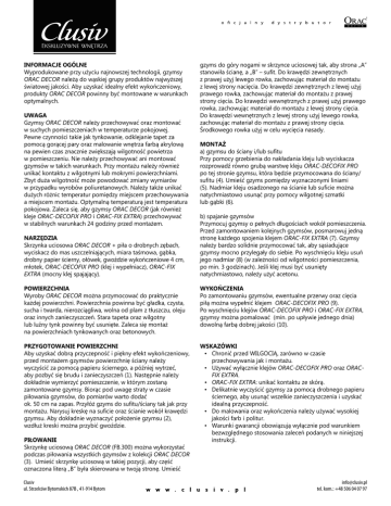 INFORMACJE OGÓLNE Wyprodukowane przy użyciu najnowszej technologii, gzymsy ORAC DECOR należą do wąskiej grupy produktów najwyższej światowej jakości. Aby uzyskać idealny efekt wykończeniowy, produkty ORAC DECOR powinny być montowane w warunkach optymalnych. UWAGA Gzymsy ORAC DECOR należy przechowywać oraz montować w suchych pomieszczeniach w temperaturze pokojowej. Pewne czynności takie jak tynkowanie, odklejanie tapet za pomocą gorącej pary oraz malowanie wnętrza farbą akrylową na pewien czas znacznie zwiększają wilgotność powietrza w pomieszczeniu. Nie należy przechowywać ani montować gzymsów w takich warunkach. Przy montażu należy również unikać kontaktu z wilgotnymi lub mokrymi powierzchniami. Zbyt duża wilgotność może powodować zmiany wymiarów w przypadku wyrobów poliuretanowych. Należy także unikać dużych różnic temperatur pomiędzy miejscem przechowywania a miejscem montażu. Optymalną temperaturą jest temperatura pokojowa. Zaleca się, aby gzymsy ORAC DECOR (jak również kleje ORAC-DECOFIX PRO i ORAC-FIX EXTRA) przechowywać w stabilnych warunkach 24 godziny przed montażem. NARZĘDZIA Skrzynka uciosowa ORAC DECOR + piła o drobnych zębach, wyciskacz do mas uszczelniających, miara taśmowa, gąbka, drobny papier ścierny, ołówek, gwoździe wykończeniowe 4 cm, młotek, ORAC-DECOFIX PRO (klej i wypełniacz), ORAC-FIX EXTRA (mocny klej spajający). gzyms do góry nogami w skrzynce uciosowej tak, aby strona „A” stanowiła ścianę, a „B” – sufit. Do krawędzi zewnętrznych z prawej użyj lewego rowka, zachowując materiał do montażu z lewej strony nacięcia. Do krawędzi zewnętrznych z lewej użyj prawego rowka, zachowując materiał do montażu z prawej strony cięcia. Do krawędzi wewnętrznych z prawej użyj prawego rowka, zachowując materiał do montażu z lewej strony cięcia. Do krawędzi wewnętrznych z lewej strony użyj lewego rowka, zachowując materiał do montażu z prawej strony cięcia. Środkowego rowka użyj w celu wycięcia nasady. MONTAŻ a) gzymsu do ściany i/lub sufitu Przy pomocy grzebienia do nakładania kleju lub wyciskacza rozprowadź równo grubą warstwę kleju ORAC-DECOFIX PRO po tej stronie gzymsu, która będzie przymocowana do ściany/ sufitu (4). Umieść gzyms pomiędzy wyznaczonymi liniami (5). Nadmiar kleju osadzonego na ścianie lub suficie można natychmiastowo usunąć przy pomocy wilgotnej szmatki lub gąbki (6). b) spajanie gzymsów Przymocuj gzymsy o pełnych długościach wokół pomieszczenia. Przed zamontowaniem kolejnych gzymsów, posmarowuj jedną stronę każdego spojenia klejem ORAC-FIX EXTRA (7). Gzymsy należy bardzo solidnie przymocować tak, aby sąsiadujące gzymsy mocno przylegały do siebie. Po wyschnięciu kleju usuń jego nadmiar (8) (w zależności od wilgotności pomieszczenia, po min. 3 godzinach). Jeśli klej musi być usunięty natychmiastowo, należy użyć acetonu. POWIERZCHNIA Wyroby ORAC DECOR można przymocować do praktycznie każdej powierzchni. Powierzchnia powinna być gładka, czysta, sucha i twarda, nierozciągliwa, wolna od plam z tłuszczu, oleju oraz innych zanieczyszczeń. Stara tapeta oraz wilgotny lub luźny tynk powinny być usunięte. Zaleca się montaż na powierzchniach tynkowanych oraz betonowych. WYKOŃCZENIA Po zamontowaniu gzymsów, ewentualne przerwy oraz cięcia piłą można wypełnić klejem ORAC-DECOFIX PRO (9). Po wyschnięciu klejów ORAC-DECOFIX PRO i ORAC-FIX EXTRA, gzymsy można pomalować (min. po upływie jednego dnia) dowolną farbą dobrej jakości (10). PRZYGOTOWANIE POWIERZCHNI Aby uzyskać dobrą przyczepność i piękny efekt wykończeniowy, przed montażem gzymsów powierzchnię ściany należy wyczyścić za pomocą papieru ściernego, a później wytrzeć, aby pozbyć się brudu i zanieczyszczeń (1). Następnie należy dokładnie wymierzyć pomieszczenie, w którym zostaną zamontowane gzymsy. Biorąc pod uwagę straty w czasie piłowania gzymsów, do pomiarów warto dodać ok. 50 cm na zapas. Przyłóż gzyms do sufitu/ściany tak jak przy montażu. Narysuj kreskę na suficie oraz ścianie wokół krawędzi gzymsu. Aby dokładnie wyznaczyć położenie gzymsu (2), wzdłuż kreski można przybić gwoździe. WSKAZÓWKI • Chronić przed WILGOCIĄ, zarówno w czasie przechowywania jak i montażu. • Używać wyłącznie klejów ORAC-DECOFIX PRO oraz ORACFIX EXTRA. • ORAC-FIX EXTRA: unikać kontaktu ze skórą. • Delikatnie wyczyścić gzymsy za pomocą drobnego papieru ściernego, aby usunąć wszelkie zanieczyszczenia i uzyskać idealną przyczepność. • Do malowania oraz wykończenia należy używać wysokiej jakości farb i politur. • Warunki gwarancji obowiązują wyłącznie pod warunkiem bezwzględnego stosowania zaleceń podanych w niniejszej instrukcji. PIŁOWANIE Skrzynkę uciosową ORAC DECOR (FB.300) można wykorzystać podczas piłowania wszystkich gzymsów z kolekcji ORAC DECOR (3). Umieść skrzynkę uciosową w takiej pozycji, aby część oznaczona literą „B” była skierowana w twoją stronę. Umieść Clusiv ul. Strzelców Bytomskich 87B , 41-914 Bytom [email protected] tel. kom.: +48 506 04 07 97