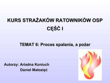 KURS STRAŻAKÓW RATOWNIKÓW OSP CĘŚĆ I TEMAT 6: Proces spalania, a pożar Autorzy: Ariadna Koniuch Daniel Małozięć Spalanie jest to złożony fizykochemiczny proces wzajemnego oddziaływania materiału palnego (paliwa) i tlenu (utleniacza). Procesowi spalania towarzyszy wydzielanie się: ciepła, światła (płomienie), produktów spalania (rozkładu termicznego). Łączenie się materiału palnego z tlenem jest poprzedzone termicznym rozpadem cząsteczek na atomy, które łatwiej wchodzą w reakcje. Powolne utlenianie korodowanie metali, gnicie roślin, butwienie drewna. Powolne utlenianie nie odgrywa znaczącej roli z punktu widzenia powstawania zagrożeń pożarowych. Szybkie utlenianie normalny proces spalania, towarzyszy mu wydzielanie się dużej ilości ciepła, światła oraz dymu. Gwałtowne utlenianie inaczej zwane wybuchem, błyskawiczne spalanie ciała palnego w swojej całej masie, zachodzące w bardzo krótkim czasie (ułamki sekundy). Spalanie płomieniowe proces spalania palnej fazy lotnej. Dlatego też ma miejsce podczas spalania gazów, cieczy i materiałów stałych, które podczas ogrzewania przechodzą w stan lotny. Spalanie bezpłomieniowe (heterogeniczne): tlenie, żarzenie typ spalania niektórych paliw stałych, charakteryzujący się tym, że w czasie spalania nie występuje płomień, tzn. że nie tworzy się, lub tworzy w minimalnej ilości, palna faza lotna. Spalanie bezpłomieniowe : tlenie, żarzenie Powolnego utleniania się, podczas którego materiał palny znajduje się w stałym stanie skupienia występujące pod postaciami: tlenia (materiały organiczne np. drewno), żarzenia (materiały nie organiczne np. metal). Spalanie płomieniowe a bezpłomieniowe spalanie bezpłomieniowe przebiega na ogół w niższych temperaturach, z mniejszą prędkością, z przewagą ilościową produktów częściowego utleniania węgla niż spalanie płomieniowe. Trójkąt spalania Utleniacz najczęściej w przypadku pożarów jest nim tlen zawarty w powietrzu atmosferycznym Materiał palny materiały, które mają obecności utleniacza zdolność do utleniania w Energia cieplna (bodziec energetyczny) dowolny impuls cieplny mający niezbędny zapas energii cieplnej do zapoczątkowania reakcji spalania materiału Dwa rodzaje inicjowania spalania płomieniowego ZAPALENIE – równomierne ogrzanie materiału palnego do takiej temperatury, w której zapali się on samorzutnie bez udziału tzw. punktowego bodźca energetycznego Dwa rodzaje inicjowania spalania płomieniowego cd ZAPŁON – zapalenie cieczy palnej punktowym bodźcem energetycznym – DOTYCZY TYLKO CIECZY PALNYCH Temperatura zapalenia jest to najniższa temperatura materiału, który ogrzewany strumieniem ciepła dostarczonym z zewnątrz w wyniku rozkładu termicznego wydziela palną fazę lotną o stężeniu umożliwiającym jego zapalenie się tzn. samorzutne pojawienie się płomienia. Temperatura zapłonu jest to najniższa temperatura cieczy ogrzewanej w ściśle określony sposób, której pary tworzą z powietrzem mieszaninę zapalającą się przy zbliżeniu płomienia. Samozapalenie proces zapoczątkowania reakcji spalania zachodzący w wyniku zmian biologicznych lub fizycznych i chemicznych materiałów, przy czym samonagrzewanie się materiałów i w konsekwencji ich samozapalenie, następuje samorzutnie bez udziału zewnętrznych strumieni ciepeł oraz bez udziału punktowych źródeł ciepła. Grupy substancji podatne na samozapalenie oleje i tłuszcze, siarczki żelaza, węgiel kamienny, brunatny i torf, produkty roślinne, chemiczne substancje i mieszaniny. Zjawiska towarzyszące procesowi spalania • wydzielanie się ciepła i światła (płomienie), wydzielanie termicznego). się produktów spalania (rozkładu Płomień widzialna objętość gazowa, w której przebiegają procesy rozkładu termicznego, utleniania i spalania, powstaje w części przestrzeni, chemiczna reakcja spalania. w której zachodzi Dwa rodzaje płomieni PŁOMIEŃ DYFUZYJNY – płomień powstały w wyniku zapalenia tej części objętości, w której następuje mieszanie się paliwa z powietrzem (utleniaczem); szybkość spalania w płomieniu dyfuzyjnym jest określona szybkością dyfuzji (przenikania) powietrza do strefy spalania płomienia np. płomień świecy Dwa rodzaje płomienicd PŁOMIEŃ KINETYCZNY – płomień powstały w warunkach, gdy substancja palna była już wstępnie, przed zapaleniem zmieszana z powietrzem, oznacza to, że szybkość spalania określana jest przede wszystkim szybkością przebiegu reakcji spalania. Spalanie dyfuzyjne Strefa pirolizy Tworzenie się sadzy Produkty spalania Świecąca strefa płomienia Powierzchni a pirolizy Topnienie Dyfuzja tlenu z powietrza W środowisku pożaru zachodzi spalanie dyfuzyjne. Promieniowanie – widoczny kolor gorących obiektów 550°C ciemna czerwień (ledwo widzialny) 700°C jaśniejsza czerwień 900°C czerwono-pomarańczowy 1100°C pomarańczowy 1400°C biały Produkty spalania Produkty spalania są to substancje otrzymywane w wyniku procesu spalania materiałów palnych. Ze względu na stan skupienia dzielą się na: gazowe, ciekłe, stałe. Produkty spalaniacd W warunkach pożarowych produkty spalania o różnych stanach skupienia współistnieją ze sobą w kolumnie konwekcyjnej ognia tzw. KKO. Kolumna Konwekcyjna Ognia Kolumna Konwekcyjna Ognia tzw. KKO spalający się materiał palny pomieszczenie Kolumna Konwekcyjna Ognia Wydzielanie się produktów spalania podczas pożaru stanowi niebezpieczeństwo ze względu na: ograniczenie widoczności, utrudnianie oddychania spowodowane ich działaniem toksycznym oraz występującym niedoborem tlenu, działanie termiczne (wysoka temperatura mogąca m.in. uszkodzić układ oddechowy), Produkty spalania są to substancje otrzymywane w wyniku procesu spalania materiałów palnych. Ze względu na stan skupienia dzielą się na: gazowe, ciekłe, stałe. Produkty spalania dzielą się na: Produkty całko