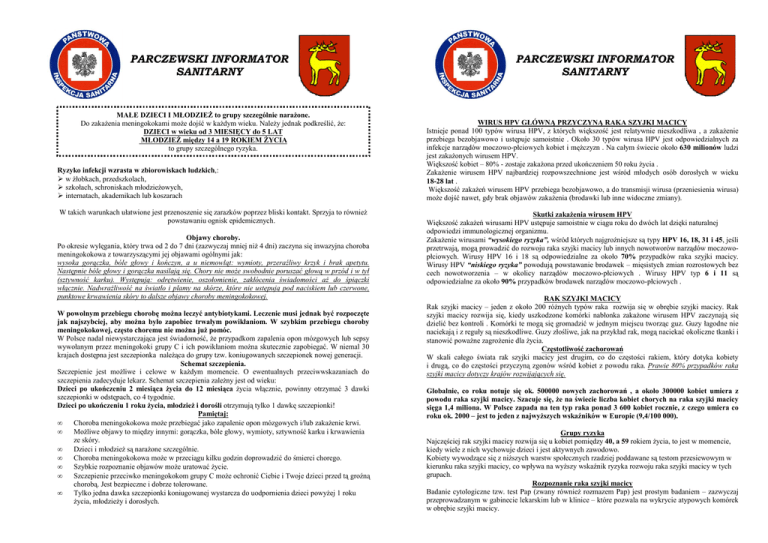 PARCZEWSKI INFORMATOR SANITARNY MAŁE DZIECI I MŁODZIEś to grupy szczególnie naraŜone. Do zakaŜenia meningokokami moŜe dojść w kaŜdym wieku. NaleŜy jednak podkreślić, Ŝe: DZIECI w wieku od 3 MIESIĘCY do 5 LAT MŁODZIEś między 14 a 19 ROKIEM śYCIA to grupy szczególnego ryzyka. Ryzyko infekcji wzrasta w zbiorowiskach ludzkich,: w Ŝłobkach, przedszkolach, szkołach, schroniskach młodzieŜowych, internatach, akademikach lub koszarach W takich warunkach ułatwione jest przenoszenie się zarazków poprzez bliski kontakt. Sprzyja to równieŜ powstawaniu ognisk epidemicznych. Objawy choroby. Po okresie wylęgania, który trwa od 2 do 7 dni (zazwyczaj mniej niŜ 4 dni) zaczyna się inwazyjna choroba meningokokowa z towarzyszącymi jej objawami ogólnymi jak: wysoka gorączka, bóle głowy i kończyn, a u niemowląt: wymioty, przeraźliwy krzyk i brak apetytu. Następnie bóle głowy i gorączka nasilają się. Chory nie moŜe swobodnie poruszać głową w przód i w tył (sztywność karku). Występują: odrętwienie, oszołomienie, zakłócenia świadomości aŜ do śpiączki włącznie. NadwraŜliwość na światło i plamy na skórze, które nie ustępują pod naciskiem lub czerwone, punktowe krwawienia skóry to dalsze objawy choroby meningokokowej. W powolnym przebiegu chorobę moŜna leczyć antybiotykami. Leczenie musi jednak być rozpoczęte jak najszybciej, aby moŜna było zapobiec trwałym powikłaniom. W szybkim przebiegu choroby meningokokowej, często choremu nie moŜna juŜ pomóc. W Polsce nadal niewystarczająca jest świadomość, Ŝe przypadkom zapalenia opon mózgowych lub sepsy wywołanym przez meningokoki grupy C i ich powikłaniom moŜna skutecznie zapobiegać. W niemal 30 krajach dostępna jest szczepionka naleŜąca do grupy tzw. koniugowanych szczepionek nowej generacji. Schemat szczepienia. Szczepienie jest moŜliwe i celowe w kaŜdym momencie. O ewentualnych przeciwwskazaniach do szczepienia zadecyduje lekarz. Schemat szczepienia zaleŜny jest od wieku: Dzieci po ukończeniu 2 miesiąca Ŝycia do 12 miesiąca Ŝycia włącznie, powinny otrzymać 3 dawki szczepionki w odstępach, co 4 tygodnie. Dzieci po ukończeniu 1 roku Ŝycia, młodzieŜ i dorośli otrzymują tylko 1 dawkę szczepionki! Pamiętaj: • Choroba meningokokowa moŜe przebiegać jako zapalenie opon mózgowych i/lub zakaŜenie krwi. • MoŜliwe objawy to między innymi: gorączka, bóle głowy, wymioty, sztywność karku i krwawienia ze skóry. • Dzieci i młodzieŜ są naraŜone szczególnie. • Choroba meningokokowa moŜe w przeciągu kilku godzin doprowadzić do śmierci chorego. • Szybkie rozpoznanie objawów moŜe uratować Ŝycie. • Szczepienie przeciwko meningokokom grupy C moŜe ochronić Ciebie i Twoje dzieci przed tą groźną chorobą. Jest bezpieczne i dobrze tolerowane. • Tylko jedna dawka szczepionki koniugowanej wystarcza do uodpornienia dzieci powyŜej 1 roku Ŝycia, młodzieŜy i dorosłych. PARCZEWSKI INFORMATOR SANITARNY WIRUS HPV GŁÓWNĄ PRZYCZYNĄ RAKA SZYJKI MACICY Istnieje ponad 100 typów wirusa HPV, z których większość jest relatywnie nieszkodliwa , a zakaŜenie przebiega bezobjawowo i ustępuje samoistnie . Około 30 typów wirusa HPV jest odpowiedzialnych za infekcje narządów moczowo-płciowych kobiet i męŜczyzn . Na całym świecie około 630 milionów ludzi jest zakaŜonych wirusem HPV. Większość kobiet – 80% - zostaje zakaŜona przed ukończeniem 50 roku Ŝycia . ZakaŜenie wirusem HPV najbardziej rozpowszechnione jest wśród młodych osób dorosłych w wieku 18-28 lat . Większość zakaŜeń wirusem HPV przebiega bezobjawowo, a do transmisji wirusa (przeniesienia wirusa) moŜe dojść nawet, gdy brak objawów zakaŜenia (brodawki lub inne widoczne zmiany). Skutki zakaŜenia wirusem HPV Większość zakaŜeń wirusami HPV ustępuje samoistnie w ciągu roku do dwóch lat dzięki naturalnej odpowiedzi immunologicznej organizmu. ZakaŜenie wirusami “wysokiego ryzyka”, wśród których najgroźniejsze są typy HPV 16, 18, 31 i 45, jeśli przetrwają, mogą prowadzić do rozwoju raka szyjki macicy lub innych nowotworów narządów moczowopłciowych. Wirusy HPV 16 i 18 są odpowiedzialne za około 70% przypadków raka szyjki macicy. Wirusy HPV “niskiego ryzyka” powodują powstawanie brodawek – mięsistych zmian rozrostowych bez cech nowotworzenia – w okolicy narządów moczowo-płciowych . Wirusy HPV typ 6 i 11 są odpowiedzialne za około 90% przypadków brodawek narządów moczowo-płciowych . RAK SZYJKI MACICY Rak szyjki macicy – jeden z około 200 róŜnych typów raka rozwija się w obrębie szyjki macicy. Rak szyjki macicy rozwija się, kiedy uszkodzone komórki nabłonka zakaŜone wirusem HPV zaczynają się dzielić bez kontroli . Komórki te mogą się gromadzić w jednym miejscu tworząc guz. Guzy łagodne nie naciekają i z reguły są nieszkodliwe. Guzy złośliwe, jak na przykład rak, mogą naciekać okoliczne tkanki i stanowić powaŜne zagroŜenie dla Ŝycia. Częstotliwość zachorowań W skali całego świata rak szyjki macicy jest drugim, co do częstości rakiem, który dotyka kobiety i drugą, co do częstości przyczyną zgonów wśród kobiet z powodu raka. Prawie 80% przypadków raka szyjki macicy dotyczy krajów rozwijających się. Globalnie, co roku notuje się ok. 500000 nowych zachorowań , a około 300000 kobiet umiera z powodu raka szyjki macicy. Szacuje się, Ŝe na świecie liczba kobiet chorych na raka szyjki macicy sięga 1,4 miliona. W Polsce zapada na ten typ raka ponad 3 600 kobiet rocznie, z czego umiera co roku ok. 2000 – jest to jeden z najwyŜszych wskaźników w Europie (9,4/100 000). Grupy ryzyka Najczęściej rak szyjki macicy rozwija się u kobiet pomiędzy 40, a 59 rokiem Ŝycia, to jest w momencie, kiedy wiele z nich wychowuje dzieci i jest aktywnych zawodowo. Kobiety wywodzące się z niŜszych warstw społecznych rzadziej poddawane są testom przesiewowym w kierunku ra