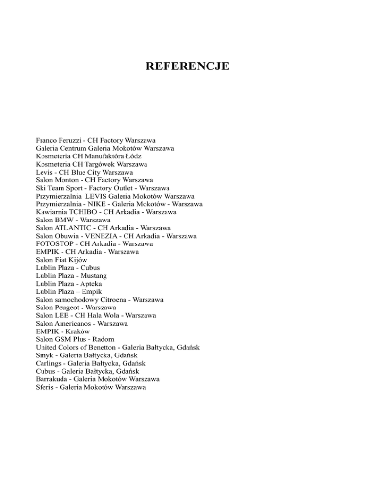 REFERENCJE Franco Feruzzi - CH Factory Warszawa Galeria Centrum Galeria Mokotów Warszawa Kosmeteria CH Manufaktóra Łódz Kosmeteria CH Targówek Warszawa Levis - CH Blue City Warszawa Salon Monton - CH Factory Warszawa Ski Team Sport - Factory Outlet - Warszawa Przymierzalnia LEVIS Galeria Mokotów Warszawa Przymierzalnia - NIKE - Galeria Mokotów - Warszawa Kawiarnia TCHIBO - CH Arkadia - Warszawa Salon BMW - Warszawa Salon ATLANTIC - CH Arkadia - Warszawa Salon Obuwia - VENEZIA - CH Arkadia - Warszawa FOTOSTOP - CH Arkadia - Warszawa EMPIK - CH Arkadia - Warszawa Salon Fiat Kijów Lublin Plaza - Cubus Lublin Plaza - Mustang Lublin Plaza - Apteka Lublin Plaza – Empik Salon samochodowy Citroena - Warszawa Salon Peugeot - Warszawa Salon LEE - CH Hala Wola - Warszawa Salon Americanos - Warszawa EMPIK - Kraków Salon GSM Plus - Radom United Colors of Benetton - Galeria Bałtycka, Gdańsk Smyk - Galeria Bałtycka, Gdańsk Carlings - Galeria Bałtycka, Gdańsk Cubus - Galeria Bałtycka, Gdańsk Barrakuda - Galeria Mokotów Warszawa Sferis - Galeria Mokotów Warszawa