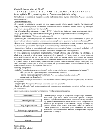 Wykład 7. (nazwa pliku wd_7b.pdf) Z A R Z Ą D Z A N I E S I E C I A M I T E L E K O M U N I K A C Y J N Y M I. Temat wykładu: Utrzymanie systemu. Zarządzanie jakością usług. Zarządzanie to działania mające na celu maksymalizację zysku operatora /*poprzez chociaż by pobudzenie rynku*/ . Utrzymanie systemu. Utrzymanie to działanie mające na celu zapewnienie odpowiedniej jakości świadczonych usług /*w Polsce swego czasu nie kładziono prawie wcale nacisku na jakość , obecnie zaczyna się dostrzegać ten problem i czynić działania w tym kierunku*/ . Nad jakością usług ustawowo czuwa URTiP, /*aktualnie jest budowany system monitorowania jakości usług*/, ponadto każdy operator ma obowiązek publikować podstawowe wskaźniki jakości. Strategie utrzymania /*historycznie wykreowane*/: - prewencyjna /*metoda polegają ca na niedopuszczaniu do uszkodzeń , czyli zapobieganiu im przez np. konserwację , czy okresowe wymiany elementów; stosowana głównie w epoce central elektromechanicznych*/ ; - korekcyjna /*metoda polegają ca tylko na usuwaniu uszkodzeń , nie kładzie się tutaj nacisku na zapobieganie im, stosowana w epoce central krzyż owych, nadmiar konserwacji takż e moż e szkodzić */; - jakościowa /*polega na zapewnieniu zadowalają cego poziomu jakości mimo wystę powania uszkodzeń , czyli tolerowaniu pewnej ilości uszkodzeń , ale tylko takiej, która nie wpływa na założ oną jakość */. W współczesnych systemach telekomunikacyjnych stosuje się wszystkie te strategie, a właściwie pewną ich mieszaninę tworzącą jedną strategię . /*Prawie zawsze w centrali wystę puje pewna ilość uszkodzeń , ale tak, ż e nie wpływa ona zwykle na poziom jakości, czyli stosuje się strategię jakościową . Jeśli uszkodzi się jeden z kluczowych elementów, który oczywiście ma swojego dublera i nie wpłynie to na jakość obsługi, to mimo to należ y go niezwłocznie wymienić , co jest przykładem strategii korekcyjnej. Jeśli chodzi o strategię prewencyjną , to wykorzystuje ją się tam, gdzie istnieją jakieś elementy mechaniczne, np. przy obsłudze dysków twardych, czy napę dów taśmowych.*/ Poziomy utrzymania - nadzór /*wszystkie elementy centrali są stale nadzorowane, choć by przez wymienione poniż ej metody*/: - bit parzystości /*głownie łą czność w obrę bie jednej centrali*/; - reszta z dzielenia przez wielomian /*np. w sygnalizacji mię dzycentralowej*/; - czas wykonania zadania; /*dokonuje się detekcji przekłamań oraz czasu wykonania zadania i na tej podstawie diagnozuje się uszkodzenia podzespołów*/ - diagnostyka /*polega na okresowym testowaniu zespołów systemu*/; - kontrola jakości /*stale wykonywana kontrola polegają ca na sprawdzaniu, czy jakość obsługi w systemie jest zachowana*/ . Sekwencja działań systemu w momencie wystąpienia uszkodzenia. /*Rekonfiguracja polega na wyłączeniu niesprawnego elementu i przekazaniu jego zadań innym elementom systemu. Nastę pnie dokonuje się testowania uszkodzonych elementów, tak by stwierdzić , czy było to uszkodzenie trwałe, czy tylko zakłócenie. Przy ponownym włączeniu go do systemu trzeba dokonać kolejnej rekonfiguracji systemu. Jednak mimo testów uszkodzenia mogą się powtarzać . Dlatego prowadzone są statystyki, gdzie odnotowuje się wszelkie uszkodzenia. Jeśli szkodzenie się powtarza, to na podstawie statystyk generowane są alarmy*/. Jakość usług. Kilka określeń jakości: Historyczne. Platon 427-347 r. p.n.e. „Jakość jest pewien stopień doskonałości”. Arystoteles 384-322 r. p.n.e. „Jakość jest jedną z dziesię ciu kategorii, które umożliwiają podział wszystkich poję ć na logiczne”. Współczesne. „Jakość to stopień w jakim użytkownik wierzy, że produkt lub usługa spełnia jego potrzeby i oczekiwania” „Jakość to zgodność z wymaganiami; jakość to zero braków” Według normy ISO 8402 (9000) jakość jest to: „ogół cech i właściwości produktu decydujących o jego zdolności do zaspokojenia stwierdzonych lub przewidywanych potrzeb”. Według W.E. Deminga jakość to wzajemne powiązania pomię dzy usługą, dostawcą i odbiorcą /*Deminga uważ a się za ojca japoń skiej jakości*/. Wg Garczarczyka „Najogólniej przez jakość usług rozumie się zdolność do zaspokajania potrzeb klienta, do świadczenia usług spełniających lub przekraczających oczekiwania klienta. „Jakość wyrobu jest stopniem (prawdopodobieństwem) spełnienia przezeń wymagań odbiorcy”. Jakość to: stopień zaspokojenia przez konkretny wyrób żądań specyficznego odbiorcy, stopień w jaki dany produkt może potencjalnie zadowolić finalnego użytkownika, stopień w jakim wyrób jest zgodny z modelem wzorca lub odpowiednio uję tymi wymogami, itp. Zarządzanie jakością usług. Praktyczne podejście do spraw jakości rozpoczę ło się za sprawą Waltera Shewharta, co ciekawe właśnie od zagadnienia racjonalizacji produkcji aparatów telefonicznych w zakładach Hawthorne koncernu Western Electric /*matematycznie ują ł problem jakości, udowodnił, ż e jeśli ilość błę dów w procesie utrzymuje się na pewnym poziomie statystycznym, to nie ma sensu nic zmieniać . Jeśli chcemy podnieść jakość wyrobów, należ y zmienić proces (np. produkcyjny*/ . Zarządzanie jakością usług telekomunikacyjnych ma na celu: /*Każde uszkodzenie powoduje straty u operatora. Uszkodzone elementy systemu nie pozwalają choć by na zestawianie połączeń, z których operator czerpie zyski. Aczkolwiek, jeśli uszkodzenie nie powoduje odłączenia abonenta, nie uzyska połączenia za pierwszym razem, lub połączenie zostanie przerwane, to zwykle wykona je ponownie. Generuje to wię kszy ruch, ale również zyski.*/ - wytworzenie korzystnego wizerunku operatora (dostawcy usług), - wzrost prestiżu operatora na rynku, - wzrost elastyczności operatora we wprowadzaniu zmian oraz spełnianiu zdeklarowanych i oczekiwa