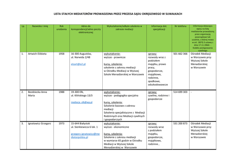 LISTA STAŁYCH MEDIATORÓW PROWADZONA PRZEZ PREZESA SĄDU OKRĘGOWEGO W SUWAŁKACH Lp. 1. 2. 3. Nazwisko i imię Artwich Elżbieta Bezdziecka Anna Maria Ignatowicz Grzegorz Rok urodzenia 1958 1988 1973 Adres do korespondencji/adres poczty elektronicznej Wykształcenie/odbyte szkolenia w zakresie mediacji 16-300 Augustów, ul. Norwida 2/48 wykształcenie: wyższe - prawnicze [email protected] kursy, szkolenia: szkolenie z zakresu mediacji w Ośrodku Mediacji w Wyższej Szkole Menadżerskiej w Warszawie 19-300 Ełk, ul. Kilińskiego 13/3 wykształcenie: wyższe - pedagogika specjalna [email protected] kursy, szkolenia: Szkolenie bazowe z zakresu mediacji Szkolenia specjalistyczne z Mediacji Rodzinnych oraz Mediacji cywilnych i gospodarczych wykształcenie: wyższe - ekonomiczne 15-644 Białystok ul. Sienkiewicza 6 lok. 1 grzegorz.ignatowicz@me diatorpolska.pl kursy, szkolenia: Szkolenie z zakresu mediacji w wymiarze 65 godzin w Ośrodku Mediacji w Wyższej Szkole Menadżerskiej w Warszawie Informacja dot. specjalizacji Nr telefonu Informacja dotycząca wpisu na listę mediatorów prowadzoną przez organizację pozarządowe lub uczelnie, o której mowa w art. 1832§ 3 ustawy z dnia 17.11.1964r. Kodeks postępowania cywilnego sprawy: rozwody wraz z podziałem majątku, prawo pracy, gospodarcze, majątkowe, rodzinne, spadkowe, odszkodowawcze 501 662 366 Ośrodek Mediacji w Warszawie przy Wyższej Szkole Menadżerskiej w Warszawie sprawy: cywilne, rodzinne i gospodarcze 514 699 303 - sprawy: rozwody wraz z podziałem majątku, gospodarcze, majątkowe, rodzinne , 531 200 873 Ośrodek Mediacji w Warszawie przy Wyższej Szkole Menadżerskiej w Warszawie 4. 5. Kleszczewska Ewa Milewska Diana 1972 1990 16-411 Szypliszki, zam. Rybalnia 1 wykształcenie: wyższe - administracyjne [email protected] kursy, szkolenia: Specjalistyczne Szkolenie z mediacji karnych i z nieletnim sprawcą czynu karalnego w Polskim Centrum Mediacji w Warszawie; Szkoła Mediacji w Centrum Dialogu i Mediacji „Bliżej” w Opolu; Warsztat dot. konstruowania dokumentów mediacyjnych; seminarium szkoleniowe „Dostępność i wprowadzanie sprawiedliwości naprawczej; konferencja organizowana przez Sąd Arbitrażowy Lewiatan w Warszawie - Diagnoza Arbitrażu Funkcjonowanie prawa o arbitrażu i kierunki postulowanych zmian; szkolenie dla przedstawicieli środowisk prawniczych zajmujących się rozwiązywaniem konfliktów „Prawnik w Mediacji”; Podlaskie Seminarium pt. Mediacja w sprawach cywilnych i gospodarczych w Europie wyzwania i perspektywy”. 16-500 Sejny ul. 1-go Maja 5 Wykształcenie: wyższe - pedagogiczne [email protected] kursy, szkolenia: „Sposób na trudnych ludzi” „Certyfikowany Kurs Trenerski Treningu Zastępowania Agresji (ART.)” spadkowe, odszkodowawcze sprawy: cywilne, gospodarcze i pracownicze sprawy: cywilne, gospodarcze 510 162 925 Podlaskie Centrum Arbitrażu i Mediacji w Białymstoku Stowarzyszenie Centrum Dialogu i Mediacji „Bliżej” w Opolu Podlaski Ośrodek Mediacyjny WEPKA w Łomży 512 846 531 - „Praktyk Treningu Zastępowania Agresji (ART.)” „Sztuka Motywacji” 6. Olszewska Barbara Iwona 1959 16-400 Suwałki ul. Chabrowa 10B [email protected] 7. 8. Przełomski Paweł Sadowski Marek 1978 1970 Wykształcenie: wyższe - pedagogiczne studia podyplomowe - socjoterapia sprawy: karne, nieletnich 666 610 959 - sprawy: cywilne, gospodarcze, umowy cywilne, prawo spółek, prawo karnegospodarcze, prawo sportowe, prawo handlowe, umowy handlowe, prawo budowlane sprawy: rozwody wraz z podziałem majątku, prawo pracy, gospodarcze, majątkowe, rodzinne, spadkowe, odszkodowawcze, naruszenie dóbr osobistych oraz własności 660 778 877 - 504 035 885 Ośrodek Mediacji w Warszawie przy Wyższej Szkole Menadżerskiej w Warszawie kursy, szkolenia: kurs „Mediator sądowy” konferencja „Mediacja jako alternatywna forma rozwiązywania konfliktów” 16-400 Suwałki ul. Waryńskiego 41B/2 wykształcenie: wyższe-prawnicze pawel.przelomski@gmail. com kursy, szkolenia: III Szkolenie Zawodowe Mediatorów 15-092 Białystok Ul. Sienkiewicza 6 lok 1 wykształcenie: wyższe - prawnicze marek.sadowski@mediat orpolska.pl kursy, szkolenia: Szkolenie z zakresu mediacji w wymiarze 65 godzin w Ośrodku Mediacji w Wyższej Szkole Menadżerskiej w Warszawie 9. 10. Sadowski Miłosz Szargiej Marcin Gerard 1975 1977 16-400 Suwałki ul. Sejneńska 51 wykształcenie: wyższe-prawnicze [email protected] kursy, szkolenia: studia podyplomowa w zakresie mediacji sądowej 15-054 Białystok Ul. Mieszka I 11/199 wykształcenie: wyższe kursy, szkolenia: Certyfikat Szkoły Mediacji; Warsztaty nt. konstruowania ugód w sprawach karnych, nieletnich, cywilnych i rodzinnych; Specjalistyczne szkolenie w zakresie alternatywnych sposobów rozwiązywania sporów w sprawach gospodarczych; Specjalistyczne warsztaty trenerskie nt. mediacji w oświacie i mediacji rówieśniczych; 16-400 Suwałki Ul. Sejneńska 51 wykształcenie: wyższe-prawnicze [email protected] kursy, szkolenia: Szkolenie Zawodowe Mediatorów prowadzone przez Centrum Mediacyjne przy Naczelnej Radzie Adwokackiej wykształcenie: wyższe - pedagogiczne [email protected] 11. 12. Szleszyńska Anna Wycik Piotr 1982 1965 18-400 Łomża ul. Woziwodzka 30 [email protected] [email protected] kursy, szkolenia: Specjalistyczne Szkolenie z mediacji karnych i z nieletnim sprawcą czynu intelektualnej, karne sprawy: karne, karnoskarbowe, rodzinne, gospodarcze, cywilne 503 960 800 - sprawy: cywilne, rodzinne, gospodarcze, karne, nieletnich, spory zbiorowe 792 518 315 Stowarzyszenie Mediatorów Polskich; Polskie Centrum Arbitrażu i Mediacji przy Izbie PrzemysłowoHandlowej w Białymstoku sprawy: cywilne, gospodarcze, rodzinne, karne, karne-gospodarcze 606 965 754 - sprawy: cywilne, gospodarcze, pracownicze, rodzinne 505 755 248 600 648 054 Podlaskie Centrum Arbitrażu i Mediacji w Białymstoku Stowarzyszenie Centrum Dialogu 13. Ząbkiewicz Janina 1952 16-400 Suwałki ul. Patli 19 [e