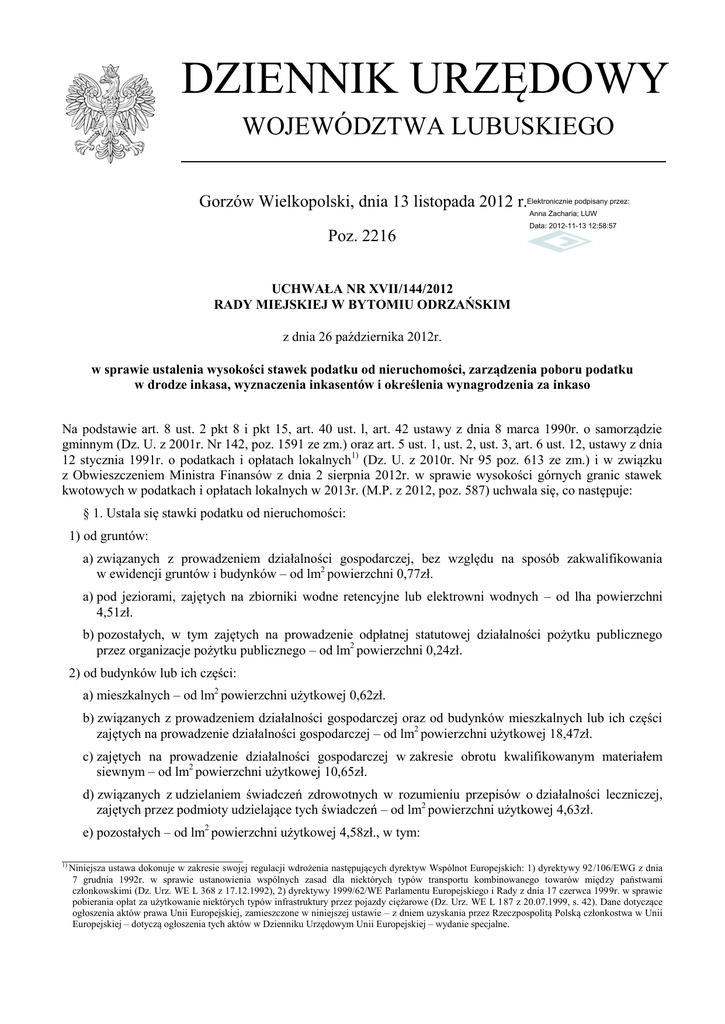 DZIENNIK URZĘDOWY WOJEWÓDZTWA LUBUSKIEGO Gorzów Wielkopolski, dnia 13 listopada 2012 r.Elektronicznie podpisany przez: Anna Zacharia; LUW Poz. 2216 Data: 2012-11-13 12:58:57 UCHWAŁA NR XVII/144/2012 RADY MIEJSKIEJ W BYTOMIU ODRZAŃSKIM z dnia 26 października 2012r. w sprawie ustalenia wysokości stawek podatku od nieruchomości, zarządzenia poboru podatku w drodze inkasa, wyznaczenia inkasentów i określenia wynagrodzenia za inkaso Na podstawie art. 8 ust. 2 pkt 8 i pkt 15, art. 40 ust. l, art. 42 ustawy z dnia 8 marca 1990r. o samorządzie gminnym (Dz. U. z 2001r. Nr 142, poz. 1591 ze zm.) oraz art. 5 ust. 1, ust. 2, ust. 3, art. 6 ust. 12, ustawy z dnia 12 stycznia 1991r. o podatkach i opłatach lokalnych1) (Dz. U. z 2010r. Nr 95 poz. 613 ze zm.) i w związku z Obwieszczeniem Ministra Finansów z dnia 2 sierpnia 2012r. w sprawie wysokości górnych granic stawek kwotowych w podatkach i opłatach lokalnych w 2013r. (M.P. z 2012, poz. 587) uchwala się, co następuje: § 1. Ustala się stawki podatku od nieruchomości: 1) od gruntów: a) związanych z prowadzeniem działalności gospodarczej, bez względu na sposób zakwalifikowania w ewidencji gruntów i budynków – od lm2 powierzchni 0,77zł. a) pod jeziorami, zajętych na zbiorniki wodne retencyjne lub elektrowni wodnych – od lha powierzchni 4,51zł. b) pozostałych, w tym zajętych na prowadzenie odpłatnej statutowej działalności pożytku publicznego przez organizacje pożytku publicznego – od lm2 powierzchni 0,24zł. 2) od budynków lub ich części: a) mieszkalnych – od lm2 powierzchni użytkowej 0,62zł. b) związanych z prowadzeniem działalności gospodarczej oraz od budynków mieszkalnych lub ich części zajętych na prowadzenie działalności gospodarczej – od lm2 powierzchni użytkowej 18,47zł. c) zajętych na prowadzenie działalności gospodarczej w zakresie obrotu kwalifikowanym materiałem siewnym – od lm2 powierzchni użytkowej 10,65zł. d) związanych z udzielaniem świadczeń zdrowotnych w rozumieniu przepisów o działalności leczniczej, zajętych przez podmioty udzielające tych świadczeń – od lm2 powierzchni użytkowej 4,63zł. e) pozostałych – od lm2 powierzchni użytkowej 4,58zł., w tym: ___________________________ 1) Niniejsza ustawa dokonuje w zakresie swojej regulacji wdrożenia następujących dyrektyw Wspólnot Europejskich: 1) dyrektywy 92/106/EWG z dnia 7 grudnia 1992r. w sprawie ustanowienia wspólnych zasad dla niektórych typów transportu kombinowanego towarów między państwami członkowskimi (Dz. Urz. WE L 368 z 17.12.1992), 2) dyrektywy 1999/62/WE Parlamentu Europejskiego i Rady z dnia 17 czerwca 1999r. w sprawie pobierania opłat za użytkowanie niektórych typów infrastruktury przez pojazdy ciężarowe (Dz. Urz. WE L 187 z 20.07.1999, s. 42). Dane dotyczące ogłoszenia aktów prawa Unii Europejskiej, zamieszczone w niniejszej ustawie – z dniem uzyskania przez Rzeczpospolitą Polską członkostwa w Unii Europejskiej – dotyczą ogłoszenia tych aktów w Dzienniku Urzędowym Unii Europejskiej – wydanie specjalne. Dziennik Urzędowy Województwa Lubuskiego –2– Poz. 2216 - garaży, z wyjątkiem zajętych na prowadzenie działalności gospodarczej – od lm2 powierzchni użytkowej 7,28zł. - budynków i ich części na terenie wsi – od lm2 powierzchni użytkowej 4,26zł. - zajętych na prowadzenie odpłatnej statutowej działalności pożytku publicznego przez organizacje pożytku publicznego – od lm2 powierzchni użytkowej 4,26zł. 3) od budowli 2% ich wartości określonej na podstawie art. 4 ust. l pkt 3 i ust. 3 – 7 ustawy o podatkach i opłatach lokalnych. § 2. 1. Zarządza się pobór podatku od nieruchomości w drodze inkasa od osób fizycznych zamieszkałych na terenie wsi. 2. Pobór inkasa realizowany będzie przez sołtysów wsi: 1) Bodzów – Grażynę Stępień 2) Bonów – Kazimierza Rakowskiego 3) Bycz – Władysławę Guzik 4) Drogomil – Grzegorza Lecha 5) Królikowice – Elżbietę Wiśniowską – Szczerbak 6) Małaszowice – Józefa Guziora 7) Popowo – Andrzeja Nowaczyka 8) Tarnów Bycki – Zygmunta Gizę 9) Wierzbnica – Dariusza Rogowicza 3. Ustala się wynagrodzenie w wysokości 8% od pobranych należności. § 3. Traci moc uchwała Nr IX/74/2011 Rady Miejskiej w Bytomiu Odrzańskim z dnia18 listopada 2011 roku w sprawie ustalenia wysokości stawek podatku od nieruchomości, zarządzenia poboru podatku w drodze inkasa, wyznaczenia inkasentów i określenia wynagrodzenia za inkaso. § 4. Wykonanie uchwały powierza się Burmistrzowi Bytomia Odrzańskiego. § 5. Uchwała wchodzi w życie po upływie 14 dni od dnia ogłoszenia w Dzienniku Urzędowym Województwa Lubuskiego i ma zastosowanie od 1 stycznia 2013 roku. Przewodniczący Rady Andrzej Chmielewski