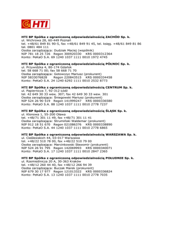 HTI BP Spółka z ograniczoną odpowiedzialnością ZACHÓD Sp. k. ul. Wichrowa 28, 60-449 Poznań tel. +48/61 849 81 90-5, fax +48/61 849 91 45, tel. księg. +48/61 849 81 86 tel. 0801 484 111 Osoba zarządzająca: Dudziak Maciej (wspólnik) NIP 781 18 25 726 Regon 300920330 KRS 0000312364 Konto: PeKaO S.A. 69 1240 1037 1111 0010 1972 4745 HTI BP Spółka z ograniczoną odpowiedzialnością PÓŁNOC Sp. k. ul. Przywidzka 4, 80-174 Gdańsk tel. 58 668 71 00; fax 58 668 71 70 Osoba zarządzająca: Gotowczyc Mariusz (prokurent) NIP 5833076828 Regon 220843515 KRS 0000334458 Konto: PeKaO S.A. 24 1240 6292 1111 0010 2532 8773 HTI BP Spółka z ograniczoną odpowiedzialnością CENTRUM Sp. k. ul. Papiernicza 7, 92-312 Łódź tel. 42 649 30 33 wew. 307; fax 42 649 30 33 wew. 301 Osoba zarządzająca: Śniegowski Mariusz (prokurent) NIP 524 26 90 519 Regon 141999247 KRS 0000336580 Konto: PeKaO S.A. 88 1240 1037 1111 0010 2778 7237 HTI BP Spółka z ograniczoną odpowiedzialnością ŚLĄSK Sp. k. ul. Klonowa 1, 55-200 Oława tel. +48/71 301 11 49, fax +48/71 301 11 41 Osoba zarządzająca: Strumiński Waldemar (prokurent) NIP 912 18 51 670 Regon 021086376 KRS 0000338890 Konto: PeKaO S.A. 44 1240 1037 1111 0010 2778 6865 HTI BP Spółka z ograniczoną odpowiedzialnością WARSZAWA Sp. k. ul. Cieślewskich 44, 03-017 Warszawa tel. +48/22 510 78 00, fax +48/22 510 79 00 Osoba zarządzająca: Marcinkowski Sławomir (prokurent) NIP 524 26 91 795 Regon 142069993 KRS 0000340071 Konto: PeKaO S.A. 17 1240 1037 1111 0010 2847 2365 HTI BP Spółka z ograniczoną odpowiedzialnością POŁUDNIE Sp. k. ul. Rzemieślnicza 20 A, 30-363 Kraków tel. +48/12 260 44 40, fax +48/12 266 94 39 Osoba zarządzająca: Buczak Marek (prokurent) NIP 679 30 17 977 Regon 121013322 KRS 0000336824 Konto: PeKaO S.A. 13 1240 1037 1111 0010 2778 7035