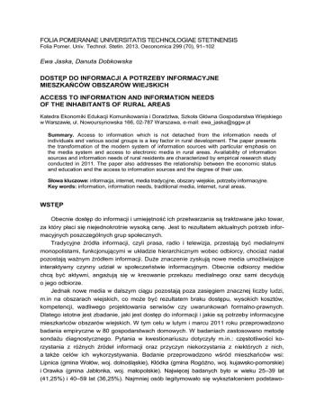 FOLIA POMERANAE UNIVERSITATIS TECHNOLOGIAE STETINENSIS Folia Pomer. Univ. Technol. Stetin. 2013, Oeconomica 299 (70), 91–102 Ewa Jaska, Danuta Dobkowska DOSTĘP DO INFORMACJI A POTRZEBY INFORMACYJNE MIESZKAŃCÓW OBSZARÓW WIEJSKICH ACCESS TO INFORMATION AND INFORMATION NEEDS OF THE INHABITANTS OF RURAL AREAS Katedra Ekonomiki Edukacji Komunikowania i Doradztwa, Szkoła Główna Gospodarstwa Wiejskiego w Warszawie, ul. Nowoursynowska 166, 02-787 Warszawa, e-mail: [email protected] Summary. Access to information which is not detached from the information needs of individuals and various social groups is a key factor in rural development. The paper presents the transformation of the modern system of information sources with particular emphasis on the media system and access to electronic media in rural areas. Availability of information sources and information needs of rural residents are characterized by empirical research study conducted in 2011. The paper also addresses the relationship between the economic status and education and the access to information sources and the degree of their use. Słowa kluczowe: informacja, internet, media tradycyjne, obszary wiejskie, potrzeby informacyjne. Key words: information, information needs, traditional media, internet, rural areas. WSTĘP Obecnie dostęp do informacji i umiejętność ich przetwarzania są traktowane jako towar, za który płaci się niejednokrotnie wysoką cenę. Jest to rezultatem aktualnych potrzeb informacyjnych poszczególnych grup społecznych. Tradycyjne źródła informacji, czyli prasa, radio i telewizja, przestają być medialnymi monopolistami, funkcjonującymi w układzie hierarchicznym wobec odbiorcy, chociaż nadal pozostają ważnym źródłem informacji. Duże znaczenie zyskują nowe media umożliwiające interaktywny czynny udział w społeczeństwie informacyjnym. Obecnie odbiorcy mediów chcą być aktywni, angażują się w kreowanie przekazu medialnego oraz sami decydują o jego odbiorze. Jednak nowe media w dalszym ciągu pozostają poza zasięgiem znacznej liczby ludzi, m.in na obszarach wiejskich, co może być rezultatem braku dostępu, wysokich kosztów, kompetencji, wadliwego projektowania serwisów czy uwarunkowań formalno-prawnych. Dlatego istotne jest zbadanie, jaki jest dostęp do informacji i jakie są potrzeby informacyjne mieszkańców obszarów wiejskich. W tym celu w lutym i marcu 2011 roku przeprowadzono badania empiryczne w 80 gospodarstwach domowych. W badaniach zastosowano metodę sondażu diagnostycznego. Pytania w kwestionariuszu dotyczyły m.in.: częstotliwości korzystania z różnych źródeł informacji oraz przyczyn niekorzystania z niektórych z nich, a także celów ich wykorzystywania. Badanie przeprowadzono wśród mieszkańców wsi: Lipnica (gmina Wołów, woj. dolnośląskie), Kłódka (gmina Rogóźno, woj. kujawsko-pomorskie) i Orawka (gmina Jabłonka, woj. małopolskie). Najwięcej badanych było w wieku 25–39 lat (41,25%) i 40–59 lat (36,25%). Najmniej osób legitymowało się wykształceniem podstawo- 92 E. Jaska i D. Dobkowska wym (12,5%), a najwięcej – wykształceniem średnim (36,25%). Ponad połowa (51,25%) badanych zadeklarowała dochód netto na osobę wynoszącej do 1 100 zł. Natomiast dochód netto na osobę w rodzinie wynoszący powyżej 2 500 zł zadeklarowało 8,75% badanych. Najwięcej badanych wskazało na zatrudnienie poza gospodarstwem (69,62%). Gospodarstwo rolne jako źródło utrzymania zostało wskazane przez 40,5% badanych. MEDIA JAKO WAŻNE ŹRÓDŁO INFORMACJI DLA MIESZKAŃCÓW OBSZARÓW WIEJSKICH Rolnictwo nie jest już głównym źródłem utrzymania mieszkańców wsi – większość z nich utrzymuje się z pracy najemnej, emerytur i rent, a także ze sprzedaży ziemi. Wzrasta odsetek ziemi uprawianej przez przedstawicieli innych zawodów niż rolnicze, przy stałym zmniejszaniu się liczby samych rolników. Rolnicy silnie identyfikują się z miejscem zamieszkania i chętniej współpracują z sąsiadami w mniej istotnych sprawach. Większą aktywność przejawia młode i średnie pokolenie na wsi oraz ludność napływowa. Istotną rolę w tych przeobrażeniach społeczno-ekonomicznych odgrywają media masowe, uważane przez większość za czynnik społecznej integracji. Jednak niektórzy autorzy zwracają uwagę także na potencjał dezintegracyjny – coraz większa liczba kanałów telewizyjnych i radiowych, tytułów prasowych, funkcjonowanie interaktywnego komunikowania online przyczynia się do “[...] fragmentaryzowania publiczności medialnej, która jest rozproszonym konglomeratem” (Michalczyk 2008, s. 330). Na dezintegrację społeczną wpływ mają między innymi: oderwanie treści medialnych od autentycznych potrzeb jednostki i społeczeństwa, nastawienie nadawców przede wszystkim na osiąganie zysków, zastępowanie informacji treściami rozrywkowymi, a także indywidualizacja odbioru informacji. Media stają się elementem społecznej rzeczywistości w trzech wymiarach (Goban-Klas 2002): – makro – media sterują społeczeństwem; chodzi tu o nowe możliwości sterowania uwagą społeczną, nowe formy konstruowania rzeczywistości oraz nowe uwarunkowania kształtowania opinii i decyzji; – mezo – „medializacja” dotyczy procesu dostosowywania się organizacji społecznych i politycznych do potrzeb mediów, które same kształtują także relacje między organizacjami; – mikro – jednostki uczestniczą w procesach medialnych i stają się elementem systemu medialnego. To właśnie media zmodyfikowały w znacznym stopniu komunikację interpersonalną. Została przełamana jednostronność komunikacji medialnej poprzez nowe środki komunikacji charakteryzujące się interaktywnością. Dlatego tak istotny jest dostęp do mediów także na obszarach wiejskich. Media na obszarach wiejskich, poprzez pełnienie funkcji informacyjnej i integrującej społeczności lokalne, aktywizują gospodarczo-społecznie o