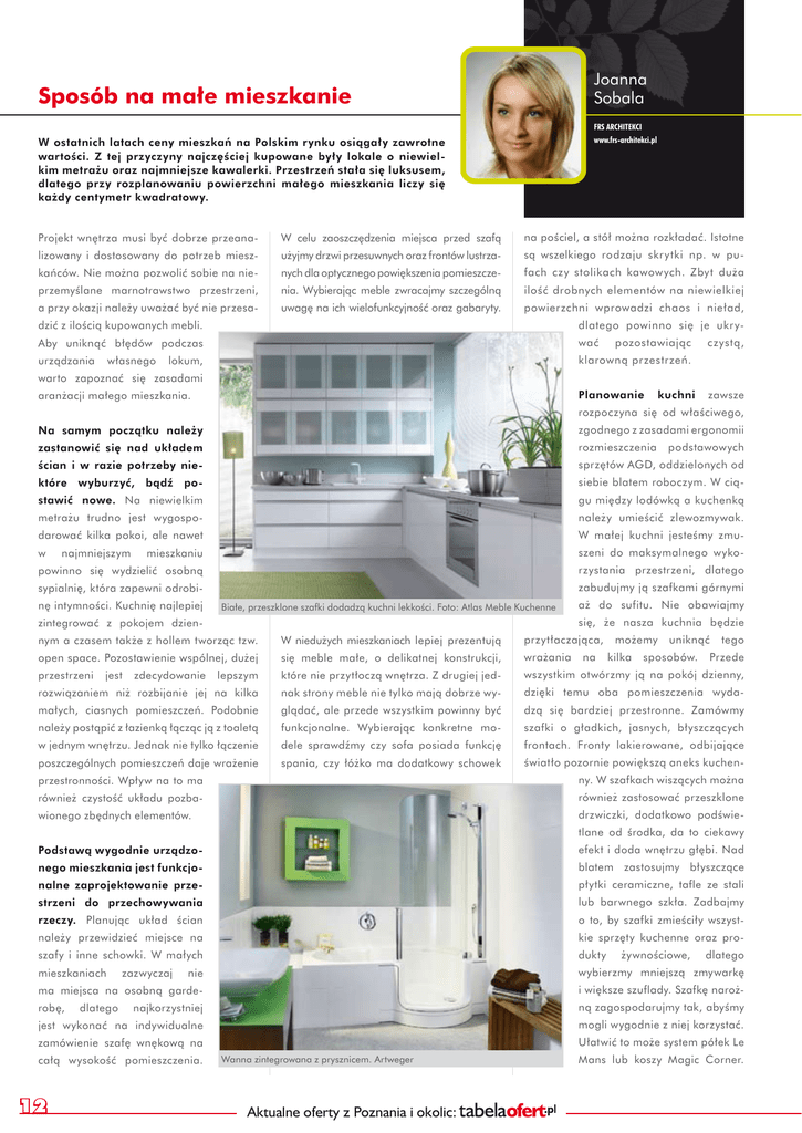 Joanna Sobala Sposób na małe mieszkanie FRS ARCHITEKCI www.frs-architekci.pl W ostatnich latach ceny mieszkań na Polskim rynku osiągały zawrotne wartości. Z tej przyczyny najczęściej kupowane były lokale o niewielkim metrażu oraz najmniejsze kawalerki. Przestrzeń stała się luksusem, dlatego przy rozplanowaniu powierzchni małego mieszkania liczy się każdy centymetr kwadratowy. na pościel, a stół można rozkładać. Istotne Projekt wnętrza musi być dobrze przeana- W celu zaoszczędzenia miejsca przed szafą lizowany i dostosowany do potrzeb miesz- użyjmy drzwi przesuwnych oraz frontów lustrza- są wszelkiego rodzaju skr y tki np. w pu- kańców. Nie można pozwolić sobie na nie- nych dla optycznego powiększenia pomieszcze- fach czy stolikach kawow ych. Zby t duża przemyślane marnotrawstwo przestrzeni, nia. Wybierając meble zwracajmy szczególną ilość drobnych elementów na niewielkiej a przy okazji należy uważać być nie przesa- uwagę na ich wielofunkcyjność oraz gabaryty. powierzchni wprowadzi chaos i nieład, dzić z ilością kupowanych mebli. dlatego powinno się je ukr y- Aby uniknąć błędów podczas wać urządzania klarowną przestrzeń. własnego lokum, pozostawiając czystą, warto zapoznać się zasadami Planowanie aranżacji małego mieszkania. kuchni zawsze rozpoczyna się od właściwego, Na samym początku należy zgodnego z zasadami ergonomii zastanowić się nad układem rozmieszczenia ścian i w razie potrzeby nie- sprzętów AGD, oddzielonych od które po- siebie blatem roboczym. W cią- stawić nowe. Na niewielkim gu między lodówką a kuchenką metrażu trudno jest wygospo- należy umieścić zlewozmywak. darować kilka pokoi, ale nawet W małej kuchni jesteśmy zmu- w mieszkaniu szeni do maksymalnego wyko- powinno się wydzielić osobną rzystania przestrzeni, dlatego sypialnię, która zapewni odrobi- zabudujmy ją szafkami górnymi wyburzyć, najmniejszym bądź nę intymności. Kuchnię najlepiej Białe, przeszklone szafki dodadzą kuchni lekkości. Foto: Atlas Meble Kuchenne podstawowych aż do sufitu. Nie obawiajmy się, że nasza kuchnia będzie zintegrować z pokojem dziennym a czasem także z hollem tworząc tzw. W niedużych mieszkaniach lepiej prezentują przytłaczająca, open space. Pozostawienie wspólnej, dużej się meble małe, o delikatnej konstrukcji, wrażania przestrzeni na możemy kilka uniknąć sposobów. tego Przede lepszym które nie przytłoczą wnętrza. Z drugiej jed- wszystkim otwórzmy ją na pokój dzienny, rozwiązaniem niż rozbijanie jej na kilka nak strony meble nie tylko mają dobrze wy- dzięki temu oba pomieszczenia wyda- małych, ciasnych pomieszczeń. Podobnie glądać, ale przede wszystkim powinny być dzą się bardziej przestronne. Zamówmy należy postąpić z łazienką łącząc ją z toaletą funkcjonalne. Wybierając konkretne mo- szafki o gładkich, jasnych, błyszczących w jednym wnętrzu. Jednak nie tylko łączenie dele sprawdźmy czy sofa posiada funkcję frontach. Fronty lakierowane, odbijające poszczególnych pomieszczeń daje wrażenie spania, czy łóżko ma dodatkowy schowek światło pozornie powiększą aneks kuchen- jest zdecydowanie przestronności. Wpływ na to ma ny. W szafkach wiszących można również czystość układu pozba- również zastosować przeszklone wionego zbędnych elementów. drzwiczki, dodatkowo podświetlane od środka, da to ciekawy Podstawą wygodnie urządzo- efekt i doda wnętrzu głębi. Nad nego mieszkania jest funkcjo- blatem zastosujmy błyszczące nalne zaprojektowanie prze- płytki ceramiczne, tafle ze stali strzeni do przechowywania lub barwnego szkła. Zadbajmy rzeczy. Planując układ ścian o to, by szafki zmieściły wszyst- należy przewidzieć miejsce na kie sprzęty kuchenne oraz pro- szafy i inne schowki. W małych dukty mieszkaniach nie wybierzmy mniejszą zmywarkę ma miejsca na osobną garde- i większe szuflady. Szafkę naroż- robę, najkorzystniej ną zagospodarujmy tak, abyśmy jest wykonać na indywidualne mogli wygodnie z niej korzystać. dlatego zazwyczaj 12 dlatego Ułatwić to może system półek Le zamówienie szafę wnękową na całą wysokość pomieszczenia. żywnościowe, Wanna zintegrowana z prysznicem. Artweger Aktualne oferty z Poznania i okolic: Mans lub koszy Magic Corner. Jeśli w kuchni brakuje miejsca do przygo- Kolor odgrywa znaczącą rolę podczas mocny akcent kolorystyczny. Mieszkanie, towywania posiłków, dobrym pomysłem aranżacji wnętrza, a w szczególno- w którym jest ujednolicona kolorystyka jest wysuwany blat roboczy lub wyjeż- ści tego o małej powierzchni. Barwą wydaje się bardziej spójne i mniej cha- dżająca cała szafka dolna, zwiększające i podziałami ścian możemy korygować otyczne, co na niewielkim metrażu nie jest w danej chwili powierzchnię do pracy. wizualnie proporcje wnętrz. Pionowe pasy łatwe do osiągnięcia. podwyższają pomieszczenia, ale również Mała łazienka zawsze stanowi wy- je zmniejszają, poziome natomiast powięk- Odpowiednie oświetlenie jest sztuką, zwanie niewielkiej szają i wydłużają. Powszechnie wiadomo, która buduje klimat wnętrza, pozwala powierzchni musimy zmieścić urządzenia że jasne, pastelowe kolory powiększają na wydobycie jego atutów i ukrycie sanitarne, pralkę, kosz na bieliznę i sza- optycznie pomieszczenie, a ciemne i inten- niedoskonałości. feczki na kosmetyki, a przy tym nie chce- sywne zmniejszają je. Pamiętajmy jednak, w mieszkaniu pamiętajmy, że dzieli się ono projektowe. Na Planując oświetlenie na trzy kategorie – oświetlenie my rezygnować z wygody. Zacznijmy od dokonania wyboru ogólne, miejscowe i dekoracyj- pomiędzy wanną a prysznicem. ne. Pierwsze z nich rozświetla Prysznic z przeszkloną kabiną cały pokój i stanowi bazę pod bardziej pasuje do małej łazien- oświetlenie ki. Czasem rezygnując z wanny powinno znaleźć się wszędzie zyskamy miejsce pod bidet czy gdzie drugą umy