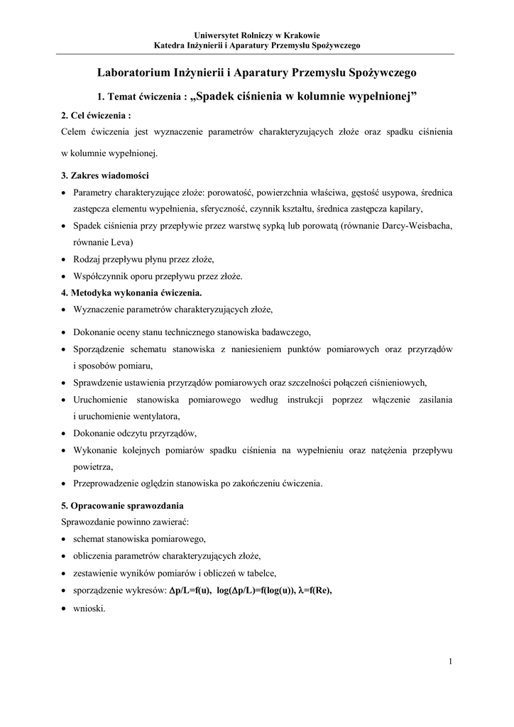 Uniwersytet Rolniczy w Krakowie Katedra Inżynierii i Aparatury Przemysłu Spożywczego Laboratorium Inżynierii i Aparatury Przemysłu Spożywczego 1. Temat ćwiczenia : „Spadek ciśnienia w kolumnie wypełnionej” 2. Cel ćwiczenia : Celem ćwiczenia jest wyznaczenie parametrów charakteryzujących złoże oraz spadku ciśnienia w kolumnie wypełnionej. 3. Zakres wiadomości Parametry charakteryzujące złoże: porowatość, powierzchnia właściwa, gęstość usypowa, średnica zastępcza elementu wypełnienia, sferyczność, czynnik kształtu, średnica zastępcza kapilary, Spadek ciśnienia przy przepływie przez warstwę sypką lub porowatą (równanie Darcy-Weisbacha, równanie Leva) Rodzaj przepływu płynu przez złoże, Współczynnik oporu przepływu przez złoże. 4. Metodyka wykonania ćwiczenia. Wyznaczenie parametrów charakteryzujących złoże, Dokonanie oceny stanu technicznego stanowiska badawczego, Sporządzenie schematu stanowiska z naniesieniem punktów pomiarowych oraz przyrządów i sposobów pomiaru, Sprawdzenie ustawienia przyrządów pomiarowych oraz szczelności połączeń ciśnieniowych, Uruchomienie stanowiska pomiarowego według instrukcji poprzez włączenie zasilania i uruchomienie wentylatora, Dokonanie odczytu przyrządów, Wykonanie kolejnych pomiarów spadku ciśnienia na wypełnieniu oraz natężenia przepływu powietrza, Przeprowadzenie oględzin stanowiska po zakończeniu ćwiczenia. 5. Opracowanie sprawozdania Sprawozdanie powinno zawierać: schemat stanowiska pomiarowego, obliczenia parametrów charakteryzujących złoże, zestawienie wyników pomiarów i obliczeń w tabelce, sporządzenie wykresów: p/L=f(u), log(p/L)=f(log(u)), =f(Re), wnioski. 1 Uniwersytet Rolniczy w Krakowie Katedra Inżynierii i Aparatury Przemysłu Spożywczego Charakterystyka złoża Wykonanie pomiarów Średnicę kulki (d) wyznaczyć na podstawie pomiaru wykonanego suwmiarką (10 razy). Masę 10 kulek (m10) wyznaczyć na wadze analitycznej. Objętość cylindra (VC) należy dobrać w zależności od wielkości kulki: 25 ml dla d=3 mm 50 ml dla d=5 mm 100 ml dla d=8 mm. Cylinder napełnić kulkami do żądanej objętości, a następnie wyznaczyć ilość kulek znajdujących się w cylindrze (NCL) – wysypać na tacę i policzyć. Pusty cylinder umieścić na wadze technicznej i zważyć (mC). Do cylindra wsypać policzone kulki i zważyć (mCK), następnie zalać je wodą destylowaną i ponownie zważyć (mCKW). Średnica 10 kulek [mm] pomiar suwmiarką dla 10 kulek m10 masa 10 kulek [g] NCL ilość kulek w cylindrze (liczona) wyznaczona masę 10 kulek na wadze analitycznej wysypać kulki i policzyć VC objętość cylindra [ml] w zależności od wielkości kulek: 25, 50, 100 ml mC masa cylindra [g] wyznaczyć na wadze technicznej mCK masa cylinder + kulki [g] do cylindra wsypać kulki i wyznaczyć masę na wadze technicznej mCKW masa cylinder + kulki + woda [g] do cylindra z kulkami nalać wodę destylowaną i wyznaczyć masę na wadze technicznej termometr tw temperatura wody [oC] Wytyczne do obliczeń 1. Średnica kulki [mm] 2. Masa kulek w cylindrze [g] 3. Masa wody w cylindrze [g] 4. Objętość wody w cylindrze [m3] 5. Objętość kulek w cylindrze [m3] 6. Masa jednej kulki (średnia) [g] 7. Powierzchnia kulki [m2] 8. Objętość kulki [m3] d - wyznaczyć średnią arytmetyczną z 10 pomiarów mK=mCK-mC mW=mCKW-mCK m VWC W w V KC VC VW m - wyznaczyć średnią arytmetyczną z 10 pomiarów AK d 2 VK d 3 6 2 Uniwersytet Rolniczy w Krakowie Katedra Inżynierii i Aparatury Przemysłu Spożywczego 9. Gęstość szkła [kg/m3] (masa kulki/objętość kulki) 10. Gęstość usypowa [kg/m3] 11. Liczba kulek w cylindrze (wyznaczyć na podstawie znajomości masy kulek w cylindrze) 12. Liczba kulek w 1m3 złoża 13. Porowatość złoża 14. Powierzchnia właściwa warstwy wypełnienia [m2/m3] m VK m U K VC m NC K m N N C VC V 0 W VC N A a C K VC SZ 3 Uniwersytet Rolniczy w Krakowie Katedra Inżynierii i Aparatury Przemysłu Spożywczego Spadek ciśnienia na wypełnieniu suchym Liczba Reynoldsa dla przepływu przez złoże: Re ud (1) ruch uwarstwiony Re < 10 u [m/s] d [m] ρ, μ ruch przejściowy 10 < Re < 100 ruch burzliwy Re > 100 prędkość pozorna, liczona na pusty (nie wypełniony), poprzeczny przekrój aparatu; średnica elementu wypełnienia; gęstość i lepkość powietrza w temperaturze pomiaru. Równanie Leva: L u 2 1 0 3 n 3 n p d 2 03 Δp L ε0 φ n λ (2) spadek ciśnienia przy przepływie przez wypełnienie; wysokość złoża; porowatość złoża; czynnik kształtu, różny od 1 dla cząstek niekulistych; współczynnik zależny od wartości liczby Reynoldsa; współczynnik oporu, uzależniony od rodzaju przepływu: - ruch uwarstwiony - ruch burzliwy 400 Re B Re 2n B - zależy od chropowatości złoża, dla szkła B=7 10 20 40 80 100 200 Re 1,0 1,15 1,3 1,45 1,55 1,7 n 400 1,8 1000 1,85 2000 1,9 4000 1,93 10000 1,96 Obliczenia: 1. Re z równania (1) 2. λ z równania (2) Wykonać wykresy zależności (na jednym wykresie dla wszystkich kolumn, w których znajdują się kulki o takiej samej średnicy): 1. p/L=f(u) 2. log(p/L)=f(log(u)) 3. =f(Re) 4