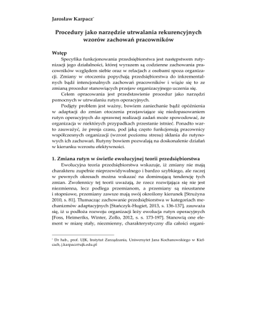 Jarosław Karpacz* Procedury jako narzędzie utrwalania rekurencyjnych wzorów zachowań pracowników Wstęp Specyfika funkcjonowania przedsiębiorstwa jest następstwem rutynizacji jego działalności, której wyrazem są codzienne zachowania pracowników względem siebie oraz w relacjach z osobami spoza organizacji. Zmiany w otoczeniu popychają przedsiębiorstwa do inkrementalnych bądź intencjonalnych zachowań pracowników i wiąże się to ze zmianą procedur stanowiących przejaw organizacyjnego uczenia się. Celem opracowania jest przedstawienie procedur jako narzędzi pomocnych w utrwalaniu rutyn operacyjnych. Podjęty problem jest ważny, bowiem zaniechanie bądź opóźnienia w adaptacji do zmian otoczenia przejawiające się niedopasowaniem rutyn operacyjnych do sprawnej realizacji zadań może spowodować, że organizacja w niektórych przypadkach przestanie istnieć. Ponadto warto zauważyć, że presja czasu, pod jaką często funkcjonują pracownicy współczesnych organizacji (wzrost poziomu stresu) skłania do rutynowych ich zachowań. Rutyny bowiem pozwalają na doskonalenie działań w kierunku wzrostu efektywności. 1. Zmiana rutyn w świetle ewolucyjnej teorii przedsiębiorstwa Ewolucyjna teoria przedsiębiorstwa wskazuje, iż zmiany nie mają charakteru zupełnie nieprzewidywalnego i bardzo szybkiego, ale raczej w pewnych okresach można wskazać na dominującą tendencję tych zmian. Zwolennicy tej teorii uważają, że rzecz rozwijająca się nie jest niezmienna, lecz podlega przemianom, a przemiany są nieustanne i stopniowe, przemiany zawsze mają swój określony kierunek [Strużyna 2010, s. 81]. Tłumacząc zachowanie przedsiębiorstwa w kategoriach mechanizmów adaptacyjnych [Stańczyk-Hugiet, 2013, s. 136-137], zauważa się, iż u podłoża rozwoju organizacji leży ewolucja rutyn operacyjnych [Foss, Heimeriks, Winter, Zollo, 2012, s. s. 173-197]. Stanowią one element w miarę stały, niezmienny, charakterystyczny dla całości organi- Dr hab., prof. UJK, Instytut Zarządzania, Uniwersytet Jana Kochanowskiego w Kielcach, [email protected] * 184 Jarosław Karpacz zacji. Bowiem rutyny uwalniając zachowania i kognitywne regularności, wnoszą stabilność między uczestników organizacji. I choć rutyny stanowią przejaw dążenia organizacji do stabilności, nie oznacza to jednak zaniechania poszukiwania nowych wzorców zachowań. A wzrost dynamizmu otoczenia częściej aniżeli jego spowolnienie, popycha przedsiębiorstwo do zmiany zachowań, a co za tym idzie zmiany rutyn operacyjnych odpowiednio do zmian w otoczeniu organizacji. Różna jest trafność udzielanych odpowiedzi przez przedsiębiorstwa na zmiany otoczenia. W rezultacie organizacje różnią się między sobą pod względem samych rutyn, a tym samym i alokacji zasobów do rutyn oraz zdolności uczenia się zmierzającej do doskonalenia rutyn. Rutyny stanowią zatem wyzwanie dla menedżerów, którzy dążąc do uzyskania dodatnich efektów rutynizacji działalności, powinni mieć na względzie także możliwość wystąpienia jej negatywnego wpływu na wyniki przedsiębiorstwa. Rutyny są dobrze rozpoznawalne w sytuacji zmiany. Zatem menedżerowie powinni inicjować zmiany, bowiem w stabilnych warunkach pracownicy nie zastanawiają się nad tym co robią rutynowo, a w trakcie zmian wręcz przeciwnie – odczuwają potrzebę identyfikacji tego co było w zestawieniu z nowymi rutynowymi wzorcami zachowań. Rysunek 1. Model ewoluującej organizacji Organizacyjne zarządzanie Trwała konfiguracja dyspozycji wyznaczających praktyki zarządzania Oddziaływanie relacji imagepraktyka udostępnione elementy wzoru Źródło: Opracowanie własne na podstawie: [Strużyna, 2012, s. 43]. Zgodnie z przedstawionym na rysunku 1 schematem przestrzeń wyznaczona linia przerywaną ilustruje abstrakcyjną całość zarządzania Nowy wzór organizacji Procedury, rutyny Przestrzeń kontaktu Nacisk otoczenia i członków organizacji na zmiany deklaracje − społeczny kontakt (atrakcyjność, wzór społecznych relacji) − techniczny/biologiczny kontakt (fizyczne cechy, instynkty, dojrzałość) Sposób spełniania i artefakty zarządzania Procedury jako narzędzie utrwalania rekurencyjnych wzorów… 185 przedsiębiorstwem. Wewnątrz tego obiektu znajdują się utrwalone dyspozycje, które generują praktyki zarządzania. Ta dyspozycja zostaje utrwalona poprzez powtórzenia praktyk (rutyny). Na tej podstawie wyłania się trwały element (wzór) charakterystyczny zarządzania – zbiór oryginalnych dla organizacji dyspozycji działania. Takie skonfigurowanie obiektu ma moc dysponowania działaniami i decyzjami. Odpowiednio do tego skonfigurowania tworzone są artefakty zarządzania (np. dokumenty), realizowane procedury, budowane zbiory informacji i spełniane codzienne zachowania. One transmitują, transferują nieuświadomione lub znane wzorce na zachowania [Strużyna 2012b, s. 4344]. Taka całość podlega wpływowi zmian otoczenia. Stąd rozwój organizacji uzależniony jest od presji środowiska. Stwierdzenie, że organizacje dążą do rozwoju (przeżycia), nie jest specjalnie odkrywcze, ale oryginalne jest to, że w formach zorganizowanych pewne typy zachowań pozwalają na przetrwanie. Zatem ontologia organizacji zaczyna się i kończy w zbiorze rutyn. 2. Pojęcie i istota rutyn organizacyjnych Rutyna organizacyjna stanowi zbiorową reakcję na określony, typowy bodziec [Czakon, 2012, s. 144]. Określa ona interakcje pomiędzy członkami organizacji, ich wzajemne relacje, kolejność działania oraz sposób wzajemnych zachowań [Czakon, 2012, s. 144]. Oparta jest przede wszystkim na powtarzalności zachowań, które odnoszone są do rekurencyjnego wzoru interakcji pomiędzy uczestnikami organizacji, a nie ich efektu [Strużyna 2012, s. 81]. Rutynom przypisuje się pozytywny wpływ na sprawność organizacji, bowiem zapewniają one [Becker, 2004, s. 643-677; Czakon 2010, s. 145]: − koordynację dzia