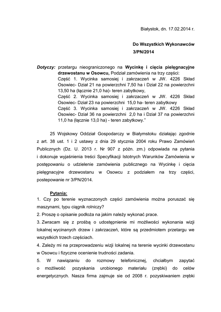Białystok, dn. 17.02.2014 r. Do Wszystkich Wykonawców 3/PN/2014 Dotyczy: przetargu nieograniczonego na Wycinkę i cięcia pielęgnacyjne drzewostanu w Osowcu, Podział zamówienia na trzy części: Część 1. Wycinka samosiej i zakrzaczeń w JW. 4226 Skład Osowiec- Dział 21 na powierzchni 7,50 ha i Dział 22 na powierzchni 13,50 ha (łącznie 21,0 ha)- teren zabytkowy, Część 2. Wycinka samosiej i zakrzaczeń w JW. 4226 Skład Osowiec- Dział 23 na powierzchni 15,0 ha- teren zabytkowy Część 3. Wycinka samosiej i zakrzaczeń w JW. 4226 Skład Osowiec- Dział 36 na powierzchni 2,0 ha i Dział 37 na powierzchni 11,0 ha (łącznie 13,0 ha) - teren zabytkowy.” 25 Wojskowy Oddział Gospodarczy w Białymstoku działając zgodnie z art. 38 ust. 1 i 2 ustawy z dnia 29 stycznia 2004 roku Prawo Zamówień Publicznych (Dz. U. 2013 r. Nr 907 z późn. zm.) odpowiada na pytania i dokonuje wyjaśnienia treści Specyfikacji Istotnych Warunków Zamówienia w postępowaniu o udzielenie zamówienia publicznego na Wycinkę i cięcia pielęgnacyjne drzewostanu w Osowcu z podziałem na trzy części, postepowanie nr 3/PN/2014. Pytania: 1. Czy po terenie wyznaczonych części zamówienia można poruszać się maszynami, typu ciągnik rolniczy? 2. Proszę o opisanie podłoża na jakim należy wykonać prace. 3. Zwracam się z prośbą o udostępnienie mi możliwości wykonania wizji lokalnej wycinanych drzew i zakrzaczeń, które są przedmiotem przetargu we wszystkich trzech częściach. 4. Zależy mi na przeprowadzeniu wizji lokalnej na terenie wycinki drzewostanu w Osowcu i fizyczne ocenienie trudności zadania. 5. o W nawiązaniu możliwość do pozyskania rozmowy telefonicznej, urobionego materiału chciałbym (zrębki) do zapytać celów energetycznych. Nasza firma zajmuje sie od 2008 r. pozyskiwaniem zrębki i dostawą biopaliw dla Elektrociepłowni Białystok do celów energetycznych. Wykonywaliśmy też zadania dla Agencji Mienia Wojskowego jako podwykonawcy, wykonawcy np. Twierdza Modlin-Cytadela jak i na innych 4 obiektach AMW. Dysponujemy wszelakim sprzętem i wykwalifikowaną kadrą pracowniczą. Możliwość pozyskania urobionego materiału zachęciłaby naszą firmę do udziału w postępowaniu przetargowym. Odpowiedzi: 1. Istnieje możliwość dojazdu sprzętem typu ciągnik rolniczy. 2. Teren objęty planowana wycinką w kompleksie twierdza Osowiec, jest obszarem częściowo podmokłym ( w pobliżu fosy), na którym występują stromizmy. Jest to teren leśny. Nie jest o teren bagienny. 3. Zamawiający dopuszcza możliwość wizji lokalnej w dniu 18.02.2014 roku (wtorek) godzina 12:00. Lokalizacja: Biuro Przepustek Jednostki Wojskowej 4226 Osowiec Twierdza, budynek nr 54. Jednostka położona jest obok siedziby Biebrzańskiego Parku Narodowego. 4. Odpowiedź tak jak w pkt. 3. 5. Zamawiający nie dopuszcza możliwości wywozu zrębek lub materiału drzewnego poza obszar realizowanej usługi. Materiał należy zagospodarować zgodnie z Opisem Przedmiotu Zamówienia. Zamawiający przedłuża termin składania ofert w postepowaniu do dnia 21.02.2014 roku do godziny 9:00. Komisyjne, jawne otwarcie ofert nastąpi dnia 21.02.2014 roku o godzinie 10:00. KOMENDANT /-/ w/z ppłk mgr inż. Krzysztof LENKIEWICZ