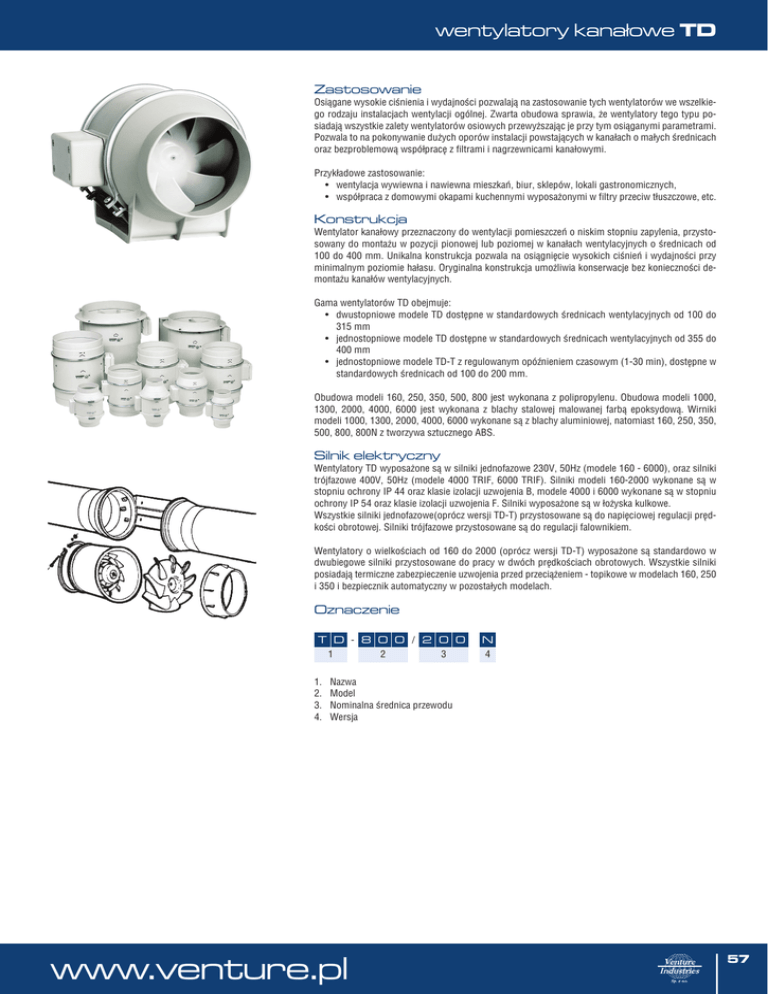 wentylatory kanałowe TD Zastosowanie Osiągane wysokie ciśnienia i wydajności pozwalają na zastosowanie tych wentylatorów we wszelkiego rodzaju instalacjach wentylacji ogólnej. Zwarta obudowa sprawia, że wentylatory tego typu posiadają wszystkie zalety wentylatorów osiowych przewyższając je przy tym osiąganymi parametrami. Pozwala to na pokonywanie dużych oporów instalacji powstających w kanałach o małych średnicach oraz bezproblemową współpracę z filtrami i nagrzewnicami kanałowymi. Przykładowe zastosowanie: ∙∙ wentylacja wywiewna i nawiewna mieszkań, biur, sklepów, lokali gastronomicznych, ∙∙ współpraca z domowymi okapami kuchennymi wyposażonymi w filtry przeciw tłuszczowe, etc. Konstrukcja Wentylator kanałowy przeznaczony do wentylacji pomieszczeń o niskim stopniu zapylenia, przystosowany do montażu w pozycji pionowej lub poziomej w kanałach wentylacyjnych o średnicach od 100 do 400 mm. Unikalna konstrukcja pozwala na osiągnięcie wysokich ciśnień i wydajności przy minimalnym poziomie hałasu. Oryginalna konstrukcja umożliwia konserwacje bez konieczności demontażu kanałów wentylacyjnych. Gama wentylatorów TD obejmuje: ∙∙ dwustopniowe modele TD dostępne w standardowych średnicach wentylacyjnych od 100 do 315 mm ∙∙ jednostopniowe modele TD dostępne w standardowych średnicach wentylacyjnych od 355 do 400 mm ∙∙ jednostopniowe modele TD-T z regulowanym opóźnieniem czasowym (1-30 min), dostępne w standardowych średnicach od 100 do 200 mm. Obudowa modeli 160, 250, 350, 500, 800 jest wykonana z polipropylenu. Obudowa modeli 1000, 1300, 2000, 4000, 6000 jest wykonana z blachy stalowej malowanej farbą epoksydową. Wirniki modeli 1000, 1300, 2000, 4000, 6000 wykonane są z blachy aluminiowej, natomiast 160, 250, 350, 500, 800, 800N z tworzywa sztucznego ABS. Silnik elektryczny Wentylatory TD wyposażone są w silniki jednofazowe 230V, 50Hz (modele 160 - 6000), oraz silniki trójfazowe 400V, 50Hz (modele 4000 TRIF, 6000 TRIF). Silniki modeli 160-2000 wykonane są w stopniu ochrony IP 44 oraz klasie izolacji uzwojenia B, modele 4000 i 6000 wykonane są w stopniu ochrony IP 54 oraz klasie izolacji uzwojenia F. Silniki wyposażone są w łożyska kulkowe. Wszystkie silniki jednofazowe(oprócz wersji TD-T) przystosowane są do napięciowej regulacji prędkości obrotowej. Silniki trójfazowe przystosowane są do regulacji falownikiem. Wentylatory o wielkościach od 160 do 2000 (oprócz wersji TD-T) wyposażone są standardowo w dwubiegowe silniki przystosowane do pracy w dwóch prędkościach obrotowych. Wszystkie silniki posiadają termiczne zabezpieczenie uzwojenia przed przeciążeniem - topikowe w modelach 160, 250 i 350 i bezpiecznik automatyczny w pozostałych modelach. Oznaczenie T D - 8 0 0 / 2 0 0 1 1. 2. 3. 4. 2 3 N 4 Nazwa Model Nominalna średnica przewodu Wersja www.venture.pl 57 wentylatory kanałowe TD Dane techniczne Typ [A] wydajność max [m3/h] ciśnienie stat. [Pa] temp. pracy [0C] 0,16 180 105 -20 +40 24 1,4 REB-1 230 0,1 140 85 -20 +40 21 1,4 RMB-1,5 24 230 0,11 240 150 -20 +40 31 2 REB-1 18 230 0,1 180 107 -20 +40 26 2 RMB-1,5 2250 (HS) 30 230 0,13 360 160 -20 +40 33 2 REB-1 1900 (LS) 22 230 0,1 280 120 -20 +40 28 2 RMB-1,5 2500 (HS) 50 230 0,22 580 295 -20 +60 33 2,7 REB-1 1950 (LS) 44 230 0,19 430 240 -20 +60 29 2,7 RMB-1,5 2500 (HS) 50 230 0,22 580 295 -20 +60 37 2,7 REB-1 1950 (LS) 44 230 0,19 430 240 -20 +60 33 2,7 RMB-1,5 2780 (HS) 95 230 0,45 880 275 -20 +60 39 4,9 REB-1 2480 (LS) 90 230 0,43 700 235 -20 +60 33 4,9 RMB-1,5 2500 (HS) 120 230 0,5 1100 350 -20 +60 40 4,9 REB-1 2000 (LS) 100 230 0,45 800 280 -20 +60 38 4,9 RMB-1,5 2800 (HS) 125 230 0,5 1010 585 -40 +60 43 9,4 REB-1 2610 (LS) 85 230 0,35 900 450 -40 +60 39 9,4 RMB-1,5 2520 (HS) 180 230 0,8 1300 550 -40 +60 47 9,4 REB-1 2000 (LS) 140 230 0,6 1100 450 -40 +60 42 9,4 RMB-1,5 2700 (HS) 255 230 1,2 2000 800 -40 +60 44 14 REB-2,5 2000 (LS) 160 230 0,8 1550 550 -40 +60 44 14 RMB-1,5 TD-4000/355 1400 345 230 1,53 3800 270 -40 +40 44 19 TD-6000/400 1400 665 230 2,97 5500 315 -40 +40 44 26 TD-4000/355 TRIF 1375 345 400 0,75 3800 270 -40 +40 44 19 RMT-1,5 40020793 TD-6000/400 TRIF 1375 650 400 2,1 5500 315 -40 +40 44 26 RMT-2,5 40020795 TD-160/100 NT SILENT 2500 20 230 0,16 180 105 -20 +40 24 1,4 - 40020713 TD-250/100 T 2200 24 230 0,11 240 150 -20 +40 31 2 - 40020723 TD-350/125 T 2250 30 230 0,13 360 160 -20 +40 33 2 - 40020733 TD-500/150 T 2500 50 230 0,22 580 295 -20 +60 33 2,7 - 40020748 TD-500/160 T 2500 50 230 0,22 580 295 -20 +60 33 2,7 - 40020743 TD-800/200 T 2500 120 230 0,5 1100 355 -20 +60 39 4,9 - 40020753 TD-160/100 N SILENT TD-250/100 TD-350/125 TD-500/150 TD-500/160 TD-800/200 N TD-800/200 TD-1000/250 TD-1300/250 TD-2000/315 prędkość obrotowa [obr./min] moc silnika [W] napięcie [V] 2500 (HS) 20 230 2200 (LS) 12 2200 (HS) 1850 (LS) natężenie poziom* masa ciśn. akust. [dB(A)] [kg] regulator nr artykułu 40020710 40020720 40020730 40020745 40020740 40020760 40020750 40020770 40020780 40020790 REB-2,5 40020792 RMB-3,5 REB-5 40020794 RMB-8 * mierzony z odległości 3m od wentylatora Charakterystyka konstrukcji polipropylen Obudowa 160 250 350 500 800 800N ∙ ∙ ∙ ∙ ∙ ∙ ∙ ∙ ∙ ∙ ∙ ∙ II II II II II II ∙ ∙ ∙ ∙ ∙ ∙ stal ABS Wirnik aluminium Stopień ochrony Zabezp. termiczne topikowe bezpiecznik automatyczny Łożyska kulkowe Regulacja obrotów*** 1000 1300 2000 4000 6000 ∙ ∙ ∙ ∙ ∙ ∙ ∙ ∙ ∙ ∙ I I I I I ∙ ∙ ∙ ∙ ∙ ∙ ∙ ∙ ∙ ∙ ∙ ∙ ∙ ∙ ∙ ∙ ∙ ∙ silnik 1-biegowy silnik 2-biegowy ∙ ∙ ∙ ∙ ∙ ∙ ∙ ∙ ∙ *** nie dotyczy modeli TD-T - występują one jedynie w wersji jednobiegowej, bez możliwości regulacji obrotów 58 Venture Industries Sp. z o. o. ul. Mokra 27, 05-092 Łomianki - Kiełpin tel. +48 22 751 95 50, 751 20 31 fax +48 22 751 22 59, 751 12 02 e-mail: [email protected] wentylatory kanałowe TD Charakterystyki pracy HS - wyższa prędko