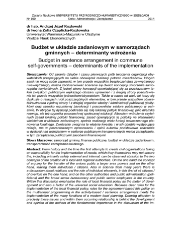Zeszyty Naukowe UNIWERSYTETU PRZYRODNICZO-HUMANISTYCZNEGO w SIEDLCACH Nr 100 Seria: Administracja i Zarządzanie 2014 dr hab. Andrzej Józef Kozłowski dr Iwona Zofia Czaplicka-Kozłowska Uniwersytet Warmińsko-Mazurski w Olsztynie Wydział Nauk Ekonomicznych Budżet w układzie zadaniowym w samorządach gminnych – determinanty wdrożenia Budget in sentence arrangement in commune self-governments – determinants of the implementation Streszczenie: Od zarania dziejów i czasu pierwszych prób tworzenia organizacji obywatelskich przejmujących na siebie obowiązek realizacji potrzeb mieszkańców, których sami nie mogą sobie zapewnić, w tym przede wszystkim bezpieczeństwa zewnętrznego i wewnętrznego, można zaobserwować ścieranie się dwóch koncepcji utworzenia samorządów terytorialnych. Z jednej strony koncepcji opowiadającej się za przekazaniem takim związkom publicznym większego obszaru uprawnień i z drugiej strony pozostawienie ich przede wszystkim jednostkom/obywatelom. Także w nauce od wielu lat toczy się dyskusja o relacjach i roli poszczególnych elementów, w tym przede wszystkim obywateli/suwerena z jednej strony i z drugiej organów władzy i administracji publicznej (polityków) oraz szeroko rozumianej biurokracji i pracowników sektora publicznego w państwie. W obrębie tej dyskusji podkreśla się rolę lokalnej polityki finansowej, jako miernika rozwoju, ale też czynnika powszechnej społecznej edukacji. Albowiem wdrożenie czytelnych zasad lokalnej polityki finansowej, zasad opierających tę politykę na planowaniu wieloletnim w układzie zadaniowym, spełnia realizację wielu funkcji nowoczesnego planowania lokalnego. Zwrócenie uwagi na te właśnie kwestie, i w ich obrębie występujące relacje, ma w prezentowanym opracowaniu i opinii autorów podstawowe znaczenie w dyskusji nad wdrożeniem w sektorze publicznym transparentnych metod zarządzania, w tym zarządzania publicznymi zasobami finansowymi. Słowa kluczowe: samorząd gminny, finanse publiczne, budżet w układzie zadaniowym, transparentność zarządzania lokalnego. Abstract: From history and the time the first attempts to create civil organisations taking on responsibility for the implementation of needs, which they themselves may not ensure the, including primarily safety external and internal, can be observed abrasion to the two concepts of the creation of a local and regional authorities. On the one hand the concept of arguing for the transfer of the unions public a larger area powers and on the other hand, leaving them individuals / citizens. Also in science from many years there is a discussion about relations and the role of individual elements, in this first of all citizens / of overlord on the one hand, and on the other authorities and public administration (politicians) and the broad sense bureaucracy and public sector employees in the country. Within this discussion emphasise the role of local financial policy as the meter of development and also a factor of the universal social education. Because clear rules for the implementation of the local financial policy, rules for the agreement-based this policy on the multiannual programming in the activity-based / sentence arrangement meets the implementation of the many functions of a modern local planning. Drawing attention to precisely these issues and within them occurring relationship is behind the development and opinion of the authors of the fundamental importance in the discussion of the im- 86 Andrzej Józef Kozłowski, Iwona Zofia Czaplicka-Kozłowska plementation in the public sector transparent management methods, including the management of public financial resources. Keywords: Municipal self-government, public finance, budget, the task-oriented, transparency of local governance. Wstęp W nauce od wielu lat toczy się dyskusja o relacjach i roli poszczególnych podmiotów będących uczestnikami życia publicznego na rozwój państw. Jak słusznie zauważają Milton i Rose Friedmanowie mamy do czynienia z „żela1 znym trójkątem” , utrudniającym wprowadzanie zmian zmierzających do ograniczenia roli państwa, niejednokrotnie poprzez wymianę elit i wdrożenie nowych mechanizmów usprawniających rządzenie i zarządzanie w sektorze publicznym. Można przyjąć, że trójkąt ten tworzą beneficjenci istnienia demokratycznego państwa prawa, ustawodawcy i ich personel, zatem politycy wszystkich szczebli oraz biurokracja – urzędnicy zarządzający programami rządowymi i samorządowymi. Ci, którzy korzystają z dobrodziejstw systemu, szczególnie tworzącego demokratyczny ustrój polityczny, starają się go bronić bez względu na społeczne koszty – dążąc do utrzymania korzystnego dla nic status quo. Podobnie jest w samorządach terytorialnych, a w nich w najbardziej rozpoznanych, bowiem najdłużej w polskich warunkach funkcjonujących, samorządach gminnych. W samorządach gminnych jak w lustrze odbija się stworzony przez polityków „friedmanowski żelazny trójkąt”, w którym są beneficjenci tego systemu politycznego/lokalnego, zatem wójtowie (burmistrzowie i prezydenci miast), radni/politycy oraz urzędnicy. Ale też mieści się w tym lokalnym systemie cały aparat sektora publicznego, beneficjenci systemu zatrudnieni w przedsiębiorstwach komunalnych, placówkach kultury czy oświaty, których istnienie niejednokrotnie znajduje swoje uzasadnienie w lokalnych zjawiskach protekcjonizmu, etatyzmu czy nepotyzmu. Istota budżetu w układzie zadaniowym Zarządzanie w samorządzie gminnym jest procesem złożonym, bowiem podobnie jak w państwie trzeba wziąć pod uwagę wiele różnych czynników mających wpływ na osiągnięcie pożądanych efektów. Natomiast zarządzanie finansami jednostki samorządu terytorialnego, jest złożonym procesem polegającym na podejmowaniu przez ich organy stanowiące i wykonawcze wielu różnych wzajemnie powiązanych ze sobą decyzji i działań służących mak