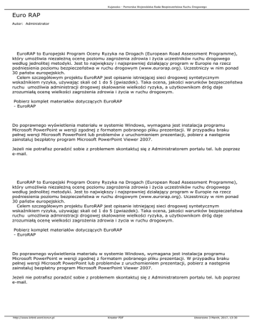 Kujawsko - Pomorska Wojewódzka Rada Bezpieczeństwa Ruchu Drogowego Euro RAP Autor: Administrator EuroRAP to Europejski Program Oceny Ryzyka na Drogach (European Road Assessment Programme), który umożliwia niezależną ocenę poziomu zagrożenia zdrowia i życia uczestników ruchu drogowego według jednolitej metodyki. Jest to największy i najsprawniej działający program w Europie na rzecz podniesienia poziomu bezpieczeństwa w ruchu drogowym (www.eurorap.org). Uczestniczy w nim ponad 30 państw europejskich. Celem szczegółowym projektu EuroRAP jest opisanie istniejącej sieci drogowej syntetycznym wskaźnikiem ryzyka, używając skali od 1 do 5 (gwiazdek). Taka ocena, jakości warunków bezpieczeństwa ruchu umożliwia administracji drogowej skalowanie wielkości ryzyka, a użytkownikom dróg daje zrozumiałą ocenę wielkości zagrożenia zdrowia i życia w ruchu drogowym. Pobierz komplet materiałów dotyczących EuroRAP - EuroRAP Do poprawnego wyświetlenia materiału w systemie Windows, wymagana jest instalacja programu Microsoft PowerPoint w wersji zgodnej z formatem pobranego pliku prezentacji. W przypadku braku pełnej wersji Microsoft PowerPoint lub problemów z uruchomieniem prezentacji, pobierz a następnie zainstaluj bezpłatny program Microsoft PowerPoint Viewer 2007. Jeżeli nie potrafisz poradzić sobie z problemem skontaktuj się z Administratorem portalu tel. lub poprzez e-mail. EuroRAP to Europejski Program Oceny Ryzyka na Drogach (European Road Assessment Programme), który umożliwia niezależną ocenę poziomu zagrożenia zdrowia i życia uczestników ruchu drogowego według jednolitej metodyki. Jest to największy i najsprawniej działający program w Europie na rzecz podniesienia poziomu bezpieczeństwa w ruchu drogowym (www.eurorap.org). Uczestniczy w nim ponad 30 państw europejskich. Celem szczegółowym projektu EuroRAP jest opisanie istniejącej sieci drogowej syntetycznym wskaźnikiem ryzyka, używając skali od 1 do 5 (gwiazdek). Taka ocena, jakości warunków bezpieczeństwa ruchu umożliwia administracji drogowej skalowanie wielkości ryzyka, a użytkownikom dróg daje zrozumiałą ocenę wielkości zagrożenia zdrowia i życia w ruchu drogowym. Pobierz komplet materiałów dotyczących EuroRAP - EuroRAP Do poprawnego wyświetlenia materiału w systemie Windows, wymagana jest instalacja programu Microsoft PowerPoint w wersji zgodnej z formatem pobranego pliku prezentacji. W przypadku braku pełnej wersji Microsoft PowerPoint lub problemów z uruchomieniem prezentacji, pobierz a następnie zainstaluj bezpłatny program Microsoft PowerPoint Viewer 2007. Jeżeli nie potrafisz poradzić sobie z problemem skontaktuj się z Administratorem portalu tel. lub poprzez e-mail. http://www.krbrd.word.torun.pl Kreator PDF Utworzono 3 March, 2017, 13:30
