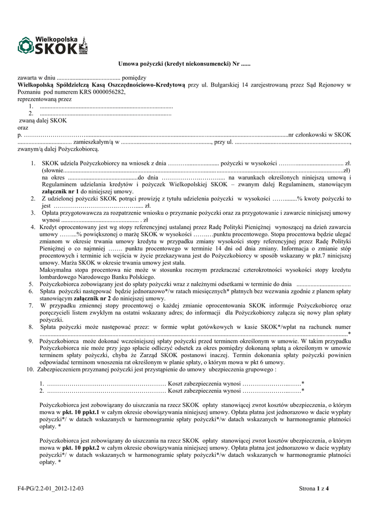 Umowa pożyczki (kredyt niekonsumencki) Nr ...... zawarta w dniu ......................................... pomiędzy Wielkopolską Spółdzielczą Kasą Oszczędnościowo-Kredytową przy ul. Bułgarskiej 14 zarejestrowaną przez Sąd Rejonowy w Poznaniu pod numerem KRS 0000056282, reprezentowaną przez 1. ...................................................................................... 2. ..................................................................................... zwaną dalej SKOK oraz p. …………………………...................................................................................................................................nr członkowski w SKOK ................................... zamieszkałym/ą w .........................................................., przy ul. .........................................................................., zwanym/ą dalej Pożyczkobiorcą. SKOK udziela Pożyczkobiorcy na wniosek z dnia ………..................... pożyczki w wysokości ……….............................. zł. (słownie.....................................................................................................................................................................................zł) na okres .............................................do dnia ……………….……….... na warunkach określonych niniejszą umową i Regulaminem udzielania kredytów i pożyczek Wielkopolskiej SKOK – zwanym dalej Regulaminem, stanowiącym załącznik nr 1 do niniejszej umowy. 2. Z udzielonej pożyczki SKOK potrąci prowizję z tytułu udzielenia pożyczki w wysokości ……........% kwoty pożyczki to jest ………………………….………..... zł. 3. Opłata przygotowawcza za rozpatrzenie wniosku o przyznanie pożyczki oraz za przygotowanie i zawarcie niniejszej umowy wynosi .................................................. . zł 4. Kredyt oprocentowany jest wg stopy referencyjnej ustalanej przez Radę Polityki Pieniężnej wynoszącej na dzień zawarcia umowy ……...% powiększonej o marżę SKOK w wysokości …….…punktu procentowego. Stopa procentowa będzie ulegać zmianom w okresie trwania umowy kredytu w przypadku zmiany wysokości stopy referencyjnej przez Radę Polityki Pieniężnej o co najmniej ……. punktu procentowego w terminie 14 dni od dnia zmiany. Informacja o zmianie stóp procentowych i terminie ich wejścia w życie przekazywana jest do Pożyczkobiorcy w sposób wskazany w pkt.7 niniejszej umowy. Marża SKOK w okresie trwania umowy jest stała. Maksymalna stopa procentowa nie może w stosunku rocznym przekraczać czterokrotności wysokości stopy kredytu lombardowego Narodowego Banku Polskiego. 5. Pożyczkobiorca zobowiązany jest do spłaty pożyczki wraz z należnymi odsetkami w terminie do dnia ................................... 6. Spłata pożyczki następować będzie jednorazowo*/w ratach miesięcznych* płatnych bez wezwania zgodnie z planem spłaty stanowiącym załącznik nr 2 do niniejszej umowy. 7. W przypadku zmiennej stopy procentowej o każdej zmianie oprocentowania SKOK informuje Pożyczkobiorcę oraz poręczycieli listem zwykłym na ostatni wskazany adres; do informacji dla Pożyczkobiorcy załącza się nowy plan spłaty pożyczki. 8. Spłata pożyczki może następować przez: w formie wpłat gotówkowych w kasie SKOK*/wpłat na rachunek numer ......................................................................................................................................................................................... ..............* 9. Pożyczkobiorca może dokonać wcześniejszej spłaty pożyczki przed terminem określonym w umowie. W takim przypadku Pożyczkobiorca nie może przy jego spłacie odliczyć odsetek za okres pomiędzy dokonaną spłatą a określonym w umowie terminem spłaty pożyczki, chyba że Zarząd SKOK postanowi inaczej. Termin dokonania spłaty pożyczki powinien odpowiadać terminom wnoszenia rat określonym w planie spłaty, o którym mowa w pkt 6 umowy. 10. Zabezpieczeniem przyznanej pożyczki jest przystąpienie do umowy ubezpieczenia grupowego : 1. 1. .………………………………………………… Koszt zabezpieczenia wynosi …………………..……* 2. .………………………………………………… Koszt zabezpieczenia wynosi …………………..……* Pożyczkobiorca jest zobowiązany do uiszczania na rzecz SKOK opłaty stanowiącej zwrot kosztów ubezpieczenia, o którym mowa w pkt. 10 ppkt.1 w całym okresie obowiązywania niniejszej umowy. Opłata płatna jest jednorazowo w dacie wypłaty pożyczki*/ w datach wskazanych w harmonogramie spłaty pożyczki*/w datach wskazanych w harmonogramie płatności opłaty. * Pożyczkobiorca jest zobowiązany do uiszczania na rzecz SKOK opłaty stanowiącej zwrot kosztów ubezpieczenia, o którym mowa w pkt. 10 ppkt.2 w całym okresie obowiązywania niniejszej umowy. Opłata płatna jest jednorazowo w dacie wypłaty pożyczki*/ w datach wskazanych w harmonogramie spłaty pożyczki*/w datach wskazanych w harmonogramie płatności opłaty. * F4-PG/2.2-01_2012-12-03 Strona 1 z 4 11 . Pozostałe zabezpieczenia: weksel in blanco. Koszt zabezpieczenia wynosi ………* ………………………………………………… Koszt zabezpieczenia wynosi …………………..……* ………………………..……………………….. Koszt zabezpieczenia wynosi …………………..……* W przypadku nieopłacania przez Pożyczkobiorcę składek z tytułu umowy ubezpieczenia, o jakiej mowa w pkt. 10 i wygaśnięcia umowy ubezpieczenia lub braku zawarcia przez Pożyczkobiorcę kolejnej umowy ubezpieczenia wraz z cesją na rzecz SKOK/wskazaniem SKOK jako uposażonego* SKOK, po bezskutecznym wezwaniu Pożyczkobiorcy do wykonania swoich zobowiązań w zakresie przedłożenia opłaconej i opatrzonej oświadczeniem o cesji/wskazaniem SKOK jako uposażonego polisy ubezpi