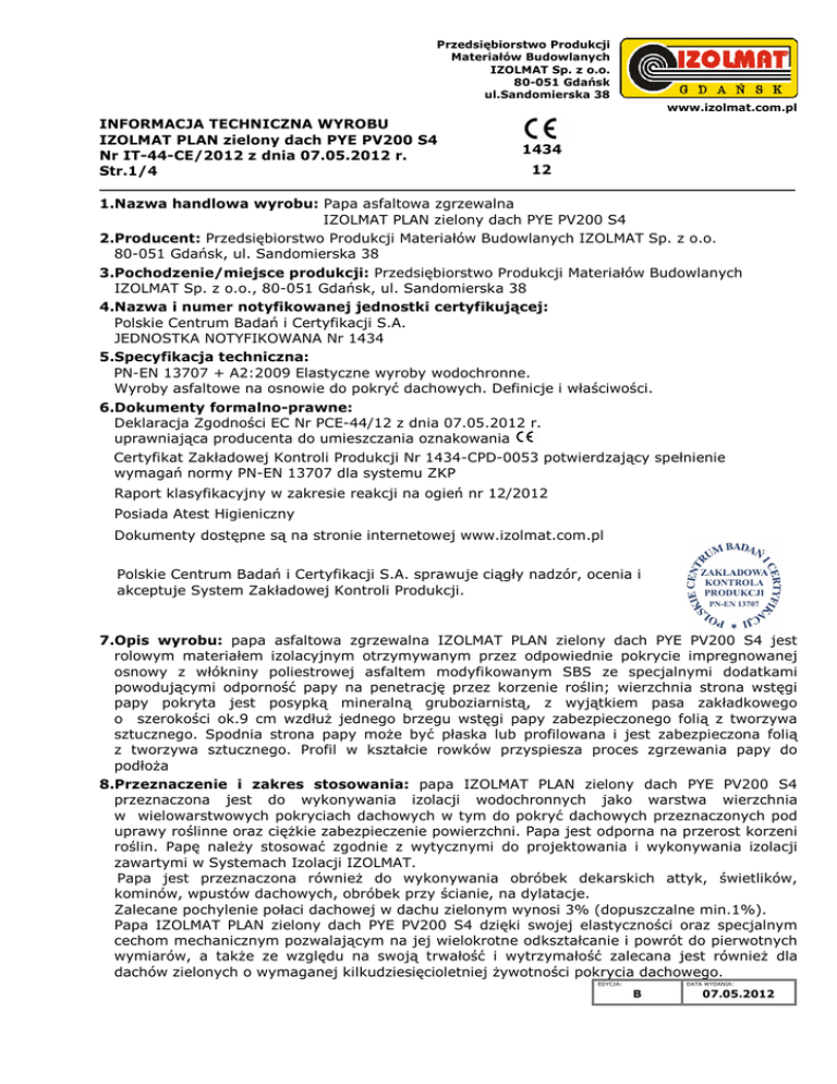 INFORMACJA TECHNICZNA WYROBU IZOLMAT PLAN zielony