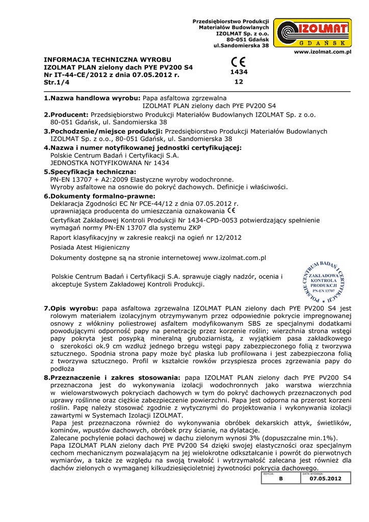 Przedsiębiorstwo Produkcji Materiałów Budowlanych IZOLMAT Sp. z o.o. 80-051 Gdańsk ul.Sandomierska 38 www.izolmat.com.pl INFORMACJA TECHNICZNA WYROBU IZOLMAT PLAN zielony dach PYE PV200 S4 Nr IT-44-CE/2012 z dnia 07.05.2012 r. Str.1/4 1434 12 _______________________________________________________________________________________ 1.Nazwa handlowa wyrobu: Papa asfaltowa zgrzewalna IZOLMAT PLAN zielony dach PYE PV200 S4 2.Producent: Przedsiębiorstwo Produkcji Materiałów Budowlanych IZOLMAT Sp. z o.o. 80-051 Gdańsk, ul. Sandomierska 38 3.Pochodzenie/miejsce produkcji: Przedsiębiorstwo Produkcji Materiałów Budowlanych IZOLMAT Sp. z o.o., 80-051 Gdańsk, ul. Sandomierska 38 4.Nazwa i numer notyfikowanej jednostki certyfikującej: Polskie Centrum Badań i Certyfikacji S.A. JEDNOSTKA NOTYFIKOWANA Nr 1434 5.Specyfikacja techniczna: PN-EN 13707 + A2:2009 Elastyczne wyroby wodochronne. Wyroby asfaltowe na osnowie do pokryć dachowych. Definicje i właściwości. 6.Dokumenty formalno-prawne: Deklaracja Zgodności EC Nr PCE-44/12 z dnia 07.05.2012 r. uprawniająca producenta do umieszczania oznakowania Certyfikat Zakładowej Kontroli Produkcji Nr 1434-CPD-0053 potwierdzający spełnienie wymagań normy PN-EN 13707 dla systemu ZKP Raport klasyfikacyjny w zakresie reakcji na ogień nr 12/2012 Posiada Atest Higieniczny Dokumenty dostępne są na stronie internetowej www.izolmat.com.pl Polskie Centrum Badań i Certyfikacji S.A. sprawuje ciągły nadzór, ocenia i akceptuje System Zakładowej Kontroli Produkcji. 7.Opis wyrobu: papa asfaltowa zgrzewalna IZOLMAT PLAN zielony dach PYE PV200 S4 jest rolowym materiałem izolacyjnym otrzymywanym przez odpowiednie pokrycie impregnowanej osnowy z włókniny poliestrowej asfaltem modyfikowanym SBS ze specjalnymi dodatkami powodującymi odporność papy na penetrację przez korzenie roślin; wierzchnia strona wstęgi papy pokryta jest posypką mineralną gruboziarnistą, z wyjątkiem pasa zakładkowego o szerokości ok.9 cm wzdłuż jednego brzegu wstęgi papy zabezpieczonego folią z tworzywa sztucznego. Spodnia strona papy może być płaska lub profilowana i jest zabezpieczona folią z tworzywa sztucznego. Profil w kształcie rowków przyspiesza proces zgrzewania papy do podłoża 8.Przeznaczenie i zakres stosowania: papa IZOLMAT PLAN zielony dach PYE PV200 S4 przeznaczona jest do wykonywania izolacji wodochronnych jako warstwa wierzchnia w wielowarstwowych pokryciach dachowych w tym do pokryć dachowych przeznaczonych pod uprawy roślinne oraz ciężkie zabezpieczenie powierzchni. Papa jest odporna na przerost korzeni roślin. Papę należy stosować zgodnie z wytycznymi do projektowania i wykonywania izolacji zawartymi w Systemach Izolacji IZOLMAT. Papa jest przeznaczona również do wykonywania obróbek dekarskich attyk, świetlików, kominów, wpustów dachowych, obróbek przy ścianie, na dylatacje. Zalecane pochylenie połaci dachowej w dachu zielonym wynosi 3% (dopuszczalne min.1%). Papa IZOLMAT PLAN zielony dach PYE PV200 S4 dzięki swojej elastyczności oraz specjalnym cechom mechanicznym pozwalającym na jej wielokrotne odkształcanie i powrót do pierwotnych wymiarów, a także ze względu na swoją trwałość i wytrzymałość zalecana jest również dla dachów zielonych o wymaganej kilkudziesięcioletniej żywotności pokrycia dachowego. EDYCJA: DATA WYDANIA: B 07.05.2012 Przedsiębiorstwo Produkcji Materiałów Budowlanych IZOLMAT Sp. z o.o. 80-051 Gdańsk ul.Sandomierska 38 www.izolmat.com.pl INFORMACJA TECHNICZNA WYROBU IZOLMAT PLAN zielony dach PYE PV200 S4 Nr IT-44-CE/2012 z dnia 07.05.2012 r. Str.2/4 1434 12 ____________________________________________________________________________________________________________________ 9.Sposób układania: papę należy mocować metodą zgrzewania. 10.Informacja o badaniach i właściwości wyrobu: Papa asfaltowa zgrzewalna IZOLMAT PLAN zielony dach PYE PV200 S4 Właściwości Metoda Badania Klasyfikacja 1 2 Wady widoczne PN-EN 1850-1 Jednostk a miary Przedstawianie Wymagania wyników 3 4 ---- Spełnienie 5 Brak wad widocznych wymagań Długość* PN-EN 1848-1 m MLV Szerokość* PN-EN 1848-1 m MLV Nie mniej niż 5,5 Nie mniej niż 0,99 (1,00 ± 0,01) Prostoliniowość PN-EN 1848-1 ---- MLV Odchyłka: niewiększa niż 10mm na 5,5m długości papy Grubość PN-EN 1849-1 Wodoszczelność przy ciśnieniu PN-EN 1928 mm MDV ---- Spełnienie 4,2 ± 0,2 Papa wodoszczelna 10kPa Metoda A Odporność na spływanie w PN-EN 1110 o MLV +100 PN-EN 1109 o C MLV -20 N/50mm MDV podwyższonej wymagań C – temperaturze temperatura, dla której średnia wartość przemieszczenia górnej i dolnej powierzchni próbki umieszczonej pionowo jest mniejsza niż 2mm Giętkość w niskiej temperaturze – temperatura, przy której nie obserwuje się rys lub pęknięć przy przeginaniu na półobwodzie wałka o średnicy 30mm Maksymalna siła rozciągająca - kierunek wzdłuż - kierunek w poprzek Wydłużenie przy maksymalnej sile PN-EN 12311-1 900 ± 100 600 ± 100 PN-EN 12311-1 % MDV rozciągającej - kierunek wzdłuż - kierunek w poprzek Wytrzymałość złączy na ścinanie - zakład podłużny - zakład poprzeczny Odporność na obciążenia statyczne 50 ± 15 50 ± 15 PN-EN 12317-1 N/50mm MDV 900 ± 200 700 ± 200 PN-EN 12730 kg MLV 15 mm MLV 900 ---- Spełnienie Metoda A Odporność na uderzenia PN-EN 12691 Metoda A Odporność na przerastanie korzeni PN-EN 13948 Papa odporna wymagań EDYCJA: DATA WYDANIA: B 07.05.2012 Przedsiębiorstwo Produkcji Materiałów Budowlanych IZOLMAT Sp. z o.o. 80-051 Gdańsk ul.Sandomierska 38 www.izolmat.com.pl INFORMACJA TECHNICZNA WYROBU IZOLMAT PLAN zielony dach PYE PV200 S4 Nr IT-44-CE/2012 z dnia 07.05.2012 r. Str.3/4 1434 12 _______________________________________________________________________________________ 10.Informacja o badaniach i właściwości wyrobu cd.: Papa asfaltowa zgrzewalna IZOLMAT PLAN zielony dach PYE PV200 S4 1 2 3 4 Stabilność wymiarów PN-EN 1107-1 % M
