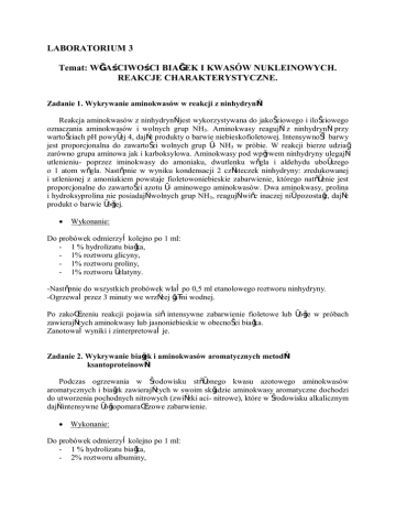 LABORATORIUM 3 Temat: WŁAŚCIWOŚCI BIAŁEK I KWASÓW NUKLEINOWYCH. REAKCJE CHARAKTERYSTYCZNE. Zadanie 1. Wykrywanie aminokwasów w reakcji z ninhydryną. Reakcja aminokwasów z ninhydryną jest wykorzystywana do jakościowego i ilościowego oznaczania aminokwasów i wolnych grup NH3. Aminokwasy reagują z ninhydryną przy wartościach pH powyżej 4, dając produkty o barwie niebieskofioletowej. Intensywność barwy jest proporcjonalna do zawartości wolnych grup α- NH3 w próbie. W reakcji bierze udział zarówno grupa aminowa jak i karboksylowa. Aminokwasy pod wpływem ninhydryny ulegają utlenieniu- poprzez iminokwasy do amoniaku, dwutlenku węgla i aldehydu uboższego o 1 atom węgla. Następnie w wyniku kondensacji 2 cząsteczek ninhydryny: zredukowanej i utlenionej z amoniakiem powstaje fioletowoniebieskie zabarwienie, którego natężenie jest proporcjonalne do zawartości azotu α- aminowego aminokwasów. Dwa aminokwasy, prolina i hydroksyprolina nie posiadają wolnych grup NH3, reagują więc inaczej niż pozostałe, dając produkt o barwie żółtej. · Wykonanie: Do probówek odmierzyć kolejno po 1 ml: - 1 % hydrolizatu białka, - 1% roztworu glicyny, - 1% roztworu proliny, - 1% roztworu żelatyny. -Następnie do wszystkich probówek wlać po 0,5 ml etanolowego roztworu ninhydryny. -Ogrzewać przez 3 minuty we wrzącej łaźni wodnej. Po zakończeniu reakcji pojawia się intensywne zabarwienie fioletowe lub żółte w próbach zawierających aminokwasy lub jasnoniebieskie w obecności białka. Zanotować wyniki i zinterpretować je. Zadanie 2. Wykrywanie białek i aminokwasów aromatycznych metodą ksantoproteinową. Podczas ogrzewania w środowisku stężonego kwasu azotowego aminokwasów aromatycznych i białek zawierających w swoim składzie aminokwasy aromatyczne dochodzi do utworzenia pochodnych nitrowych (związki aci- nitrowe), które w środowisku alkalicznym dają intensywne żółtopomarańczowe zabarwienie. · Wykonanie: Do probówek odmierzyć kolejno po 1 ml: - 1 % hydrolizatu białka, - 2% roztworu albuminy, - 1% roztworu tryptofanu 1% roztworu glicyny. -Do każdej próby dodać po 1ml stężonego kwasu azotowego. -Ogrzewać przez 5 minut we wrzącej łaźni wodnej. -Po ochłodzeniu probówek należy bardzo ostrożnie (reakcja silnie egzotermiczna!!!), małymi porcjami, stale mieszając, dodawać 3,5 ml 20% roztworu NaOH. Po zalkalizowaniu próby pojawia się barwa żółtopomarańczowa. Zanotować wyniki i zinterpretować je. Zadanie 3. Wytrącanie białek jonami metali ciężkich. Jeżeli wartość pH jest większa od pI, cząsteczki białka stają się anionami i mogą reagować z kationami. Kationy metali ciężkich (Fe3+, Cu2+, Hg2+, Pb2+) dają z białkami nierozpuszczalne kompleksy, powodując duże zmiany strukturalne w obrębie cząsteczki białka. Wytrącają się osady denaturowanego białka nierozpuszczalne w wodzie ani w nadmiarze soli. · Wykonanie: -Do dwóch probówek odmierzyć po 1ml 0,2% roztworu albuminy. -Do 1 probówki - dodać parę kropel octanu ołowiu - (CH2COO)2Pb (trucizna). -Do 2 probówki - parę kropel chlorku rtęciowego- HgCl2 (trucizna). Zanotować wynik i wyjaśnić przyczyny obserwowanego zjawiska. Zadanie 4. Wytrącanie białek etanolem. Rozpuszczalniki organiczne, w tym etanol czy aceton, powodują dehydratację otoczki wodnej wokół cząsteczki białka zmniejszając tym samym jej rozpuszczalność (wypadanie białka z roztworu) oraz wywołując zmiany denaturacyjne w jej obrębie. Jeżeli rozpuszczalniki te działają krótko i w niskiej temperaturze (poniżej 0 0C), białko nie ulega denaturacji i można je rozpuścić. Wytrącanie w temperaturze pokojowej przy długotrwałym działaniu rozpuszczalników organicznych, prowadzi do denaturacji białka i staje się ono nierozpuszczalne. Wykonanie: -Odmierzyć do dwóch probówek po: - 2 ml etanolu - i dodać po 0,5 ml roztworu białka jaja kurzego. -Natychmiast po wytrąceniu osadu: - do jednej probówki dodać 10 ml wody, - a drugą probówkę pozostawić na 30 minut. Po tym czasie dodać do niej również 10 ml wody. Zanotować wynik, porównać efekt w obu probówkach i wyjaśnić przyczyny obserwowanego zjawiska. Zadanie 5. Wysalanie białek Białka rozpuszczalne w wodzie można wytrącić z roztworu dużym stężeniem soli. Proces ten nazywamy wysalaniem. Sole wiążące wodę pozbawiają cząsteczki białka płaszcza wodnego, co zmniejsza ich rozpuszczalność i prowadzi do wytrącania z roztworu. Najczęściej do wysalania stosuje się (NH4)2SO4, Na2SO4 lub MgSO4. Wysalanie jest procesem odwracalnym. Po zmniejszeniu stężenia soli, można ponownie rozpuścić wytrącone białko. Wykazuje ono swoje rodzime właściwości, ponieważ wysalanie nie powoduje denaturacji. Albuminy można oddzielić od globulin wykorzystując ich różną rozpuszczalność w stężonych roztworach soli. Globuliny tracą wodę hydratacyjną już przy 50% nasyceniu (NH4)2SO4, albuminy wysalają się dopiero po całkowitym nasyceniu roztworu (NH4)2SO4. · Wykonanie 1) Do probówki odmierzyć 2 ml roztworu białka jaja kurzego i dodać 2 ml nasyconego roztworu siarczanu amonowego. Wytrąca się kłaczkowaty osad globulin. Zaobserwować wynik. Następnie dodać około 10 ml wody. Osad ulega rozpuszczeniu. 2) Do 50 ml erlenmajerki odmierzyć 10 ml roztworu białka jaja kurzego i dodać taką samą ilość nasyconego roztworu siarczanu amonowego (10 ml), wymieszać. Wytrąceniu ulegają globuliny. Próbę przesączyć przez sączek bibułowy do suchej probówki. Pobrać 2 ml przesączu i dodawać małymi porcjami siarczan amonowy w substancji do uzyskania nasyconego roztworu aż na dnie probówki pozostanie kilka nierozpuszczonych kryształów siarczanu amonu. W tych warunkach wypadają wysolone albuminy. 3) Wytrącony osad albumin zebrać na sączku bibułowym (przesączyć próbę), a otrzymany przesącz zbadać w celu stwierdzenia obecności białek. W tym celu do przesaczu należy dodać kr