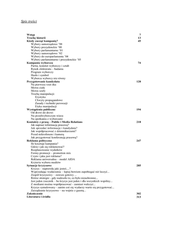 Spis treści Wstęp Trochę historii Kiedy zacząć kampanię? Wybory samorządowe ’98 Wybory prezydenckie ’00 Wybory parlamentarne ’01 Wybory samorządowe ’02 Wybory do europarlamentu ’04 Wybory parlamentarne i prezydenckie ’05 Kampania wyborcza Partia, komitet wyborczy i sztab Rynek elektoratu – badania Program wyborczy Hasło i symbol Wyborca wyborcy nie równy Przygotowanie kandydata Na pierwszy rzut oka Mowa ciała Mowa szafy Trochę manipulacji: Erystyka Chwyty propagandowe Zasady i techniki perswazji Etyka manipulacji Wystąpienia publiczne Od drzwi do drzwi Na przedwyborczym wiecu Na spotkaniu z wyborcami Kontakty z prasą – Public i Media Relations Jak napisać informację prasową? Jak sprzedać informacje i kandydata? Jak współpracować z dziennikarzami? Przed mikrofonem i kamerą Jak przygotować konferencję prasową? Reklama polityczna Ile kosztuje kampania? Gdzie i jak się reklamować? Rozplanowanie wydatków Formy promocji – promotion mix Czym i jaka jest reklama? Reklama uniwersalna – model AIDA Kryteria wyboru mediów Sytuacje kryzysowe Kryzys – naprawdę jaki jesteś....? Wyprzedając wydarzenia – lepiej bowiem zapobiegać niż leczyć... Zespół kryzysowy – zawsze gotowy ... Różne strategie - gdy nadeszło to, co było nieuchronne... Jest jeden rzecznik – bo kryzys jest jeden i dla wszystkich wspólny... Z mediami można współpracować - zamiast walczyć... Kryzys symulowany - zanim coś się wydarzy warto się przygotować... Zarządzanie kryzysowe – na wojnie z gazetą... Zakończenie Literatura i źródła 7 13 45 74 120 194 218 247 285 302 313 Niech się nikt nie dziwi, że mówiąc o całkiem nowych księstwach, przytoczę najwznioślejsze przykłady, gdyż ludzie kroczą prawie zawsze drogami ubitymi przez innych i w czynnościach naśladują drugich; a ponieważ niepodobna trzymać się dokładnie tych dróg ani dorównywać w doskonałości tym, których naśladujesz, przeto rozumny mąż powinien zawsze postępować śladami ludzi wielkich i najbardziej naśladowania godnych, aby jeżeli im nie dorówna, to przynajmniej zbliży się do nich pod pewnym względem. Podobnie czynią dobrzy łucznicy: ci, widząc bardzo odległy cel, a znając siłę rzutu swego łuku, mierzą nieco wyżej, nie po to, aby dosięgnąć strzałą tej wysokości, lecz aby mierząc wyżej, trafić do celu. Niccolò Machiavelli, Książę Wstęp Specjaliści od marketingu dowodzą, że „sprzedawanie” polityków niewiele różni się, od reklamowania proszku, mydła, margaryny, czy innych produktów szybko zbywalnych. Z tą tylko różnicą, że margaryna nie zeskoczy z półki, i nie palnie jakiegoś głupstwa w najmniej sprzyjającym momencie. Na szczęście, jak mawiał autor „Księcia”, Niccolò Machiavelli: Los w połowie jest panem naszych czynności, lecz jeszcze pozostawia nam kierowanie drugą ich połową lub nie o wiele mniejszą ich częścią. Stąd też olbrzymie pole do popisu dla różnego typu specjalistów od marketingu, którzy pracują nad „kierowaniem drugą połową czynności” polityka lub kandydata na polityka. Na wyborczy sukces, nie tylko w Polsce, nie ma gotowej recepty, bo wyborcy są jeszcze mniej przewidywalni niż konsumenci. Widać to po kolejnych wyborach. Wprawdzie istnieją tzw. żelazne elektoraty, z których jeszcze do niedawna największą liczebnie była grupa zwolenników lewicy. Również większa część tzw. „planktonu politycznego”, czyli małych partii skrajnej prawicy, funkcjonuje tylko dzięki grupie kilku, kilkunastu zagorzałych zwolenników lidera. Jednak grupy te są coraz mniej liczne, a elektorat przed każdymi wyborami musi być pozyskiwany, aby przekształcił się w wyborców poszczególnych ugrupowań. Jak pokazują badania, Polacy - o ile już idą do wyborczych urn – decyzję, na kogo głosować podejmują coraz częściej w ostatnim tygodniu kampanii, a nawet dopiero w wyborczą niedzielę. Więcej, niż co czwarty wyborca rozważał możliwość głosowania na inną partię, niż ta, którą ostatecznie poparł. Odrębną sprawą jest też udział Polaków w wyborach. Spośród 247 krajów branych pod uwagę przy badaniu frekwencji wyborczej w latach 1990-2000 Polska zajęła 217 miejsce, między Czadem i Ghaną. Nawet najwyższa 62procentowa frekwencja, jaką osiągnęliśmy w wyborach parlamentarnych w 1989 roku, była niższa niż średnia w krajach Europy Zachodniej. A od tamtej pory było tylko gorzej. Z badań International Institute for Democracy and Electoral Assistance (IDEA), który od 1945 roku bada frekwencję wyborczą w 172 krajach świata wynika, że od lat czterdziestych XX wieku średnia frekwencja na świecie systematycznie rosła z 61 proc. do 68 proc. w latach 80-tych. Jednak w latach 90-tych nastąpiło załamanie tej tendencji i spadek do średniej 64 proc. IDEA ujawnia, że Polacy mieli od 1945 roku najniższą średnią frekwencję spośród wszystkich krajów europejskich. Ze średnią 52,3 proc. lokujemy się na 131 miejscu, pomiędzy Panamą i Kirgizją 1. W wyborach 2005 roku frekwencja wyniosła odpowiednio: parlamentarne – 40,57 proc., prezydenckie: I tura – 49,74 proc., II tura – 50,99 proc. Dlatego też działania związane z uzyskaniem poparcia w wyborach, w coraz większym stopniu, są obszarem popisów specjalistów od marketingu politycznego, kreowania wizerunku, socjologów, psychologów, krawców, kosmetyczek itp., którzy tak naprawdę 1 Za: Polacy nie chcą iść głosować, „Życie Warszawy”, 24.08.2005 r. tworzą sztaby wyborcze, kształtują programy, podpowiadają politykom: co, kiedy i jak mają powiedzieć, ubierają ich, czeszą. Wpływanie na preferencje wyborcze to, co prawda zupełnie co innego niż kształtowanie gustów konsumenckich, ale w obu przypadkach sprzedaje się wizerunek. Poza tym demokracja, podobnie jak rynek, opiera się na konkurencji. W Polsce mamy trzy rodzaje wyborów: prezydenckie, parlamenta