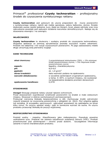 Primacol® professional Czysty technorattan - profesjonalny środek do czyszczenia syntetycznego rattanu Czysty technorattan jest gotowym do użycia preparatem do mycia powierzchni z syntetycznego rattanu, takich jak meble ogrodowe, osłony balkonów, donice. Środek doskonale usuwa resztki jedzenia, kurz, ślady po liściach, brud, ptasie odchody oraz inne zabrudzenia powstałe pod wpływem działania warunków atmosferycznych. Nadaje się do stosowania wewnątrz i na zewnątrz. WŁAŚCIWOŚCI Czysty technorattan to skuteczny i wydajny produkt do czyszczenia technorattanu. Wygodna aplikacja za pomocą spryskiwacza pozwala wyczyścić trudne zakamarki. Produkt nie odbarwia i nie rysuje czyszczonych powierzchni. Po jego zastosowaniu meble długo utrzymują swój pierwotny wygląd. DANE TECHNICZNE skład chemiczny: 2-propyloheksanol etoksylowany (7EO), < 5% anionowe środki powierzchniowo czynne, < 5% niejonowe środki powierzchniowo czynne zapach: pH: gęstość: okres trwałości: warunki składowania: łagodny, charakterystyczny 8,0-9,0 ok. 1,0 g/cm3 data ważności podana na opakowaniu w szczelnie zamkniętym oryginalnym opakowaniu, w temp. 5–30oC, w suchym miejscu, nie wystawiać na bezpośrednie działanie promieni słonecznych 0,575l opakowania handlowe: STOSOWANIE Uwaga! Stosując preparat należy używać rękawic ochronnych. Przed stosowaniem wypróbować wrażliwość powierzchni na środek w mało widocznym miejscu. Stosować w dobrze wentylowanych pomieszczeniach. Przesunąć czerwoną blokadę bezpieczeństwa w dół. Zachowując środki ostrożności rozpylić preparat na czyszczoną powierzchnię z odległości ok. 20cm. Myć wilgotna gąbką lub szmatką. W przypadku uporczywych zabrudzeń pozostawić do zadziałania na okres kilku minut. Po umyciu spłukać wodą i jeśli to konieczne wytrzeć do sucha. Po użyciu produktu przesunąć blokadę do pozycji wyjściowej. BEZPIECZEŃSTWO STOSOWANIA Produkt wodny - niepalny. Klasyfikowany jako niebezpieczny. Powoduje poważne uszkodzenia oczu. Preparat nie zawiera szkodliwych substancji lotnych (VOC). Produkt przechowywać pod zamknięciem i chronić przed dziećmi. Szczegółowe informacje zawarte w karcie charakterystyki produktu. Unicell Poland Sp. z o.o. , ul. Supraślska 25, 16-010 Wasilków, Polska tel. +48 (85) 71 04 000 , +48 (85) 71 86 860 , fax. +48 (85) 71 86 862 Strona 1 z 2 INFORMACJE PRAWNE Wszystkie informacje i dane zawarte tutaj są podane w dobrej wierze i w zgodzie z posiadaną przez nasze laboratoria wiedzą. Muszą jednak być przyjęte jako oznaczenia bez gwarancji, jeżeli produkt znajduje się poza naszą kontrolą. Informacja techniczna nie jest świadectwem jakości produktu ani też ofertą. Producent nie odpowiada za niewłaściwe użycie informacji zawartych na tej karcie, ani też za konsekwencje z tego wynikające. W przypadku wątpliwości zawsze należy przeprowadzić próbę. Producent zastrzega sobie prawo do zmiany powyższych danych bez powiadamiania klienta. Zapraszamy na nasze strony internetowe: www.unicell.pl, www.dekorujemydom.pl, www.primacol.pl. Wydanie Autor: Monika Karasewicz Data: 07.10.2015r. Aktualizacja Autor: Beata Michalczuk Data: 02.02.2016r. Unicell Poland Sp. z o.o. , ul. Supraślska 25, 16-010 Wasilków, Polska tel. +48 (85) 71 04 000 , +48 (85) 71 86 860 , fax. +48 (85) 71 86 862 Strona 2 z 2
