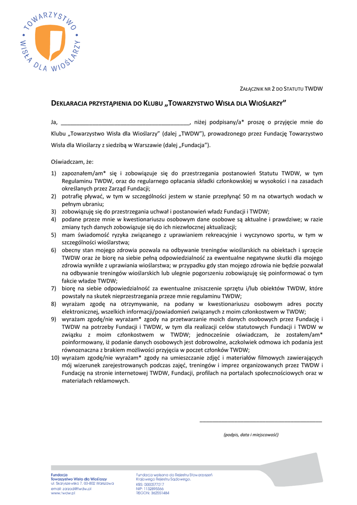 ZAŁĄCZNIK NR 2 DO STATUTU TWDW DEKLARACJA PRZYSTĄPIENIA DO KLUBU „TOWARZYSTWO WISŁA DLA WIOŚLARZY” Ja, _________________________________________, niżej podpisany/a* proszę o przyjęcie mnie do Klubu „Towarzystwo Wisła dla Wioślarzy” (dalej „TWDW”), prowadzonego przez Fundację Towarzystwo Wisła dla Wioślarzy z siedzibą w Warszawie (dalej „Fundacja”). Oświadczam, że: 1) zapoznałem/am* się i zobowiązuje się do przestrzegania postanowień Statutu TWDW, w tym Regulaminu TWDW, oraz do regularnego opłacania składki członkowskiej w wysokości i na zasadach określanych przez Zarząd Fundacji; 2) potrafię pływać, w tym w szczególności jestem w stanie przepłynąć 50 m na otwartych wodach w pełnym ubraniu; 3) zobowiązuję się do przestrzegania uchwał i postanowień władz Fundacji i TWDW; 4) podane przeze mnie w kwestionariuszu osobowym dane osobowe są aktualne i prawdziwe; w razie zmiany tych danych zobowiązuje się do ich niezwłocznej aktualizacji; 5) mam świadomość ryzyka związanego z uprawianiem rekreacyjnie i wyczynowo sportu, w tym w szczególności wioślarstwa; 6) obecny stan mojego zdrowia pozwala na odbywanie treningów wioślarskich na obiektach i sprzęcie TWDW oraz że biorę na siebie pełną odpowiedzialność za ewentualne negatywne skutki dla mojego zdrowia wynikłe z uprawiania wioślarstwa; w przypadku gdy stan mojego zdrowia nie będzie pozwalał na odbywanie treningów wioślarskich lub ulegnie pogorszeniu zobowiązuję się poinformować o tym fakcie władze TWDW; 7) biorę na siebie odpowiedzialność za ewentualne zniszczenie sprzętu i/lub obiektów TWDW, które powstały na skutek nieprzestrzegania przeze mnie regulaminu TWDW; 8) wyrażam zgodę na otrzymywanie, na podany w kwestionariuszu osobowym adres poczty elektronicznej, wszelkich informacji/powiadomień związanych z moim członkostwem w TWDW; 9) wyrażam zgodę/nie wyrażam* zgody na przetwarzanie moich danych osobowych przez Fundację i TWDW na potrzeby Fundacji i TWDW, w tym dla realizacji celów statutowych Fundacji i TWDW w związku z moim członkostwem w TWDW; jednocześnie oświadczam, że zostałem/am* poinformowany, iż podanie danych osobowych jest dobrowolne, aczkolwiek odmowa ich podania jest równoznaczna z brakiem możliwości przyjęcia w poczet członków TWDW; 10) wyrażam zgodę/nie wyrażam* zgody na umieszczanie zdjęć i materiałów filmowych zawierających mój wizerunek zarejestrowanych podczas zajęć, treningów i imprez organizowanych przez TWDW i Fundację na stronie internetowej TWDW, Fundacji, profilach na portalach społecznościowych oraz w materiałach reklamowych. _______________________________________ (podpis, data i miejscowość) Zgodnie z postanowieniami ustawy z dnia 29 sierpnia 1997 r. o ochronie danych osobowych (Dz. U. z 2015 r., poz. 2135 z późn. zm.) administratorem danych osobowych jest Fundacja Towarzystwo Wisła dla Wioślarzy, ul Skaryszewska 7, 03-802 Warszawa, wpisana do Krajowego Rejestru Sądowego pod numerem 0000577017. Ww. dane są zbierane w celach związanych z organizacją i uczestnictwem w TWDW w celu realizacji celów statutowych Fundacji i TWDW. Podanie danych jest dobrowolne (podst. prawna art. 23 ustawy z dnia 29 sierpnia 1997 r. o ochronie danych osobowych). Osobom, których dane dotyczą, przysługuje prawo dostępu do treści swoich danych osobowych oraz ich poprawiania. *niepotrzebne skreślić ZAŁĄCZNIK NR 3 DO STATUTU TWDW Nr członkowski: __________________ (wypełnia TWDW) KWESTIONARIUSZ OSOBOWY IMIĘ I NAZWISKO:_______________________________________________________________ DATA URODZENIA: ________________________________________________________ PESEL ______________________________________________________________________ ADRES ZAMIESZKANIA: ___________________________________________________________ E-MAIL: _________________________________ NR TELEFONU: __________________________ OSOBA, KTÓRĄ NALEŻY POWIADOMIĆ W RAZIE WYPADKU (IMIĘ I NAZWISKO, NUMER TELEFONU): ___________________________________________________________________________ INFORMACJA O KOMPETENCJACH WIOŚLARSKICH*: 1 __ 2 __ 3 __ 1 - POCZĄTKUJĄCY (NIGDY NIE SIEDZIAŁ/A** W WYCZYNOWEJ ŁODZI WIOŚLARSKIEJ) 2 - ŚREDNIOZAAWANSOWANY (PRZYNAJMNIEJ PRZEZ JEDEN SEZON UPRAWIAŁ/A** WIOŚLARSTWO NA POZIOMIE AMATORSKIM LUB AKADEMICKIM; SWOBODNIE POSŁUGUJE SIĘ NOMENKLATURĄ WIOŚLARSKĄ) 3 - ZAAWANSOWANY (ODBYWAŁ/A** W PRZESZŁOŚCI SAMODZIELNE TRENINGI WIOŚLARSKIE NA RZECE NA JEDYNCE ORAZ STARTOWAŁ/A* W ZAWODACH; SWOBODNIE POSŁUGUJE SIĘ NOMENKLATURĄ WIOŚLARSKĄ) INFORMACJE NA TEMAT WYSOKOŚCI I ZASAD PŁATNOŚCI SKŁADKI CZŁONKOWSKIEJ: ZGODNIE Z UCHWAŁĄ NR 1/2016 ZARZĄDU FUNDACJI Z DNIA 08.04. 2016 R. MIESIĘCZNA WYSOKOŚĆ SKŁADKI CZŁONKOWSKIEJ WYNOSI: 100,- ZŁ (SŁOWNIE: STO ZŁOTYCH) DLA WSZYSTKICH CZŁONKÓW, KTÓRZY UKOŃCZYLI 24 LATA; 50,- ZŁ (SŁOWNIE: PIĘĆDZIESIĄT ZŁOTYCH), DLA CZŁONKÓW KTÓRZY NIE UKOŃCZYLI 24 LAT. SKŁADKA CZŁONKOWSKA JEST PŁATNA „Z GÓRY” DO 10 DNIA KAŻDEGO MIESIĄCA KALENDARZOWEGO NA RACHUNEK BANKOWY FUNDACJI 25 1050 1025 1000 0090 3072 2434 PROWADZONY W BANKU ING BANK ŚLĄSKI S.A. W MIESIĄCU, W KTÓRYM NASTĄPIŁO PRZYJĘCIE CZŁONKA DO TWDW PEŁNĄ SKŁADKĘ NALEŻY UIŚCIĆ W TERMINIE 3 DNI OD PRZYJĘCIA W POCZET CZŁONKÓW TWDW, NA RACHUNEK BANKOWY FUNDACJI WSKAZANY POWYŻEJ. W TYTULE PRZELEWU NALEŻY WPISAĆ INFORMACJE WEDŁUG PONIŻSZEGO WZORU: „SKŁADKA CZŁONKOWSKA TWDW, IMIĘ I NAZWISKO CZŁONKA” WPŁATY SĄ W PIERWSZEJ KOLEJNOŚCI ZALICZANE NA POCZET NAJDŁUŻEJ WYMAGALNYCH PŁATNOŚCI. TERMINEM PŁATNOŚCI JEST DATA OBCIĄŻENIA RACHUNKU BANKOWEGO FUNDACJI WYMAGANĄ NALEŻNOŚCIĄ. UWAGA: ZE SKŁADKI CZŁONKOWSKIEJ NIE JEST FINANSOWANA OPIEKA TRENERSKA. * zaznaczyć odpowiednie **niepotrzebne skreślić