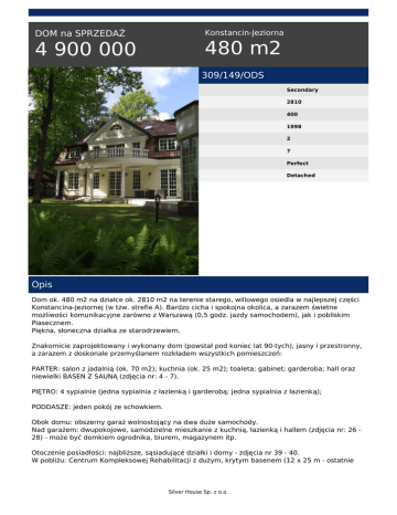 DOM na SPRZEDAŻ 4 900 000 Konstancin-Jeziorna 480 m2 309/149/ODS Secondary 2810 400 1998 2 7 Perfect Detached Opis Dom ok. 480 m2 na działce ok. 2810 m2 na terenie starego, willowego osiedla w najlepszej części Konstancina-Jeziornej (w tzw. strefie A). Bardzo cicha i spokojna okolica, a zarazem świetne możliwości komunikacyjne zarówno z Warszawą (0,5 godz. jazdy samochodem), jak i pobliskim Piasecznem. Piękna, słoneczna działka ze starodrzewiem. Znakomicie zaprojektowany i wykonany dom (powstał pod koniec lat 90-tych), jasny i przestronny, a zarazem z doskonale przemyślanem rozkładem wszystkich pomieszczeń: PARTER: salon z jadalnią (ok. 70 m2); kuchnia (ok. 25 m2); toaleta; gabinet; garderoba; hall oraz niewielki BASEN Z SAUNĄ (zdjęcia nr: 4 - 7). PIĘTRO: 4 sypialnie (jedna sypialnia z łazienką i garderobą; jedna sypialnia z łazienką); PODDASZE: jeden pokój ze schowkiem. Obok domu: obszerny garaż wolnostojący na dwa duże samochody. Nad garażem: dwupokojowe, samodzielne mieszkanie z kuchnią, łazienką i hallem (zdjęcia nr: 26 28) - może być domkiem ogrodnika, biurem, magazynem itp. Otoczenie posiadłości: najbliższe, sąsiadujące działki i domy - zdjęcia nr 39 - 40. W pobliżu: Centrum Kompleksowej Rehabilitacji z dużym, krytym basenem (12 x 25 m - ostatnie Silver House Sp. z o.o. zdjęcie), las z tzw. ścieżką zdrowia (Chojnowski Park Krajobrazowy), pełnowymiarowy kort tenisowy oraz stajnia i wypożyczalnia koni. POLECAM I ZACHĘCAM DO OGLĄDANIA *Informacje zawarte w opisie nieruchomości nie stanowią oferty w rozumieniu Kodeksu Cywilnego. Dążymy do tego, aby informacje zawarte w opisach oferowanych przez nas nieruchomości były możliwie dokładne, kompletne i aktualne. Z uwagi jednak na fakt, iż czasami pochodzą one od osób trzecich i część z nich nie zawsze daje się zweryfikować, Silver House Sp. z o.o. nie ponosi odpowiedzialności za ich dokładność, kompletność i aktualność. Janusz Jednorowski tel. 511 220 230 tel. (22) 319 80 00 email: [email protected] Silver House Sp. z o.o. Powered by TCPDF (www.tcpdf.org)