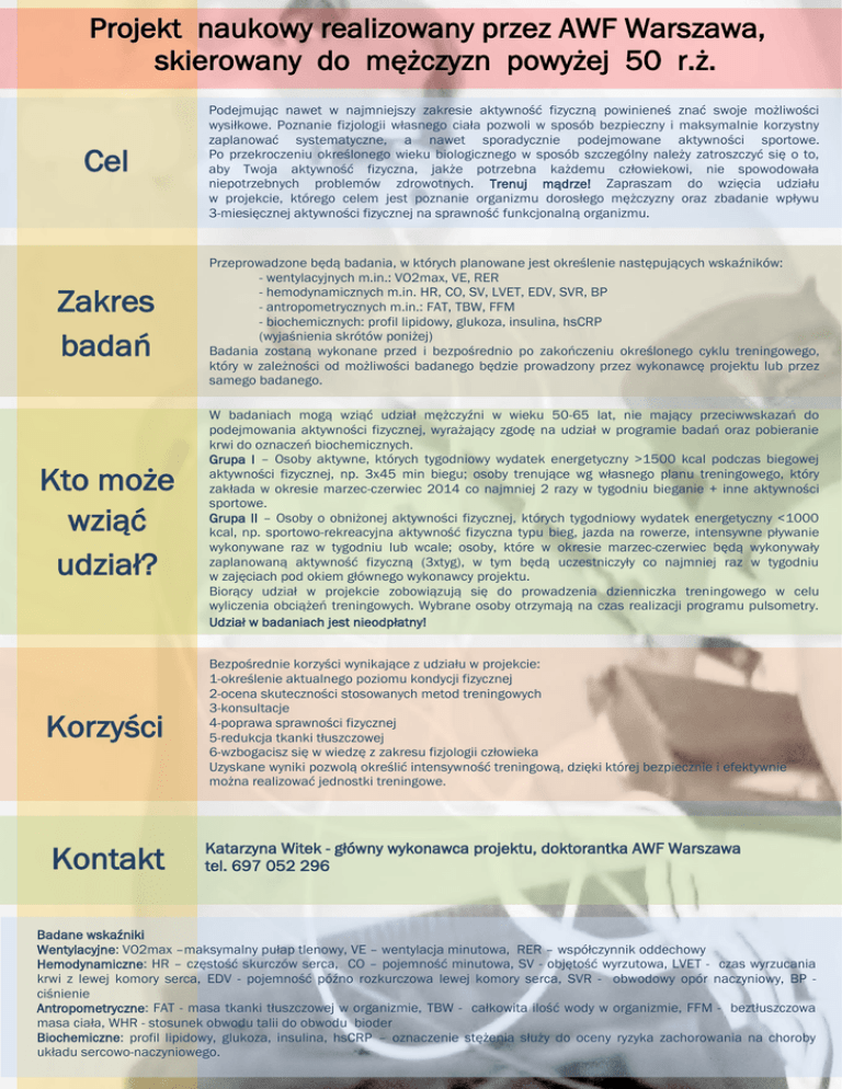 Projekt naukowy realizowany przez AWF Warszawa, skierowany do mężczyzn powyżej 50 r.ż. Cel Podejmując nawet w najmniejszy zakresie aktywność fizyczną powinieneś znać swoje możliwości wysiłkowe. Poznanie fizjologii własnego ciała pozwoli w sposób bezpieczny i maksymalnie korzystny zaplanować systematyczne, a nawet sporadycznie podejmowane aktywności sportowe. Po przekroczeniu określonego wieku biologicznego w sposób szczególny należy zatroszczyć się o to, aby Twoja aktywność fizyczna, jakże potrzebna każdemu człowiekowi, nie spowodowała niepotrzebnych problemów zdrowotnych. Trenuj mądrze! Zapraszam do wzięcia udziału w projekcie, którego celem jest poznanie organizmu dorosłego mężczyzny oraz zbadanie wpływu 3-miesięcznej aktywności fizycznej na sprawność funkcjonalną organizmu. Zakres badań Przeprowadzone będą badania, w których planowane jest określenie następujących wskaźników: - wentylacyjnych m.in.: VO2max, VE, RER - hemodynamicznych m.in. HR, CO, SV, LVET, EDV, SVR, BP - antropometrycznych m.in.: FAT, TBW, FFM - biochemicznych: profil lipidowy, glukoza, insulina, hsCRP (wyjaśnienia skrótów poniżej) Badania zostaną wykonane przed i bezpośrednio po zakończeniu określonego cyklu treningowego, który w zależności od możliwości badanego będzie prowadzony przez wykonawcę projektu lub przez samego badanego. Kto może wziąć udział? W badaniach mogą wziąć udział mężczyźni w wieku 50-65 lat, nie mający przeciwwskazań do podejmowania aktywności fizycznej, wyrażający zgodę na udział w programie badań oraz pobieranie krwi do oznaczeń biochemicznych. Grupa I – Osoby aktywne, których tygodniowy wydatek energetyczny >1500 kcal podczas biegowej aktywności fizycznej, np. 3x45 min biegu; osoby trenujące wg własnego planu treningowego, który zakłada w okresie marzec-czerwiec 2014 co najmniej 2 razy w tygodniu bieganie + inne aktywności sportowe. Grupa II – Osoby o obniżonej aktywności fizycznej, których tygodniowy wydatek energetyczny <1000 kcal, np. sportowo-rekreacyjna aktywność fizyczna typu bieg, jazda na rowerze, intensywne pływanie wykonywane raz w tygodniu lub wcale; osoby, które w okresie marzec-czerwiec będą wykonywały zaplanowaną aktywność fizyczną (3xtyg), w tym będą uczestniczyły co najmniej raz w tygodniu w zajęciach pod okiem głównego wykonawcy projektu. Biorący udział w projekcie zobowiązują się do prowadzenia dzienniczka treningowego w celu wyliczenia obciążeń treningowych. Wybrane osoby otrzymają na czas realizacji programu pulsometry. Udział w badaniach jest nieodpłatny! Korzyści Kontakt Bezpośrednie korzyści wynikające z udziału w projekcie: 1-określenie aktualnego poziomu kondycji fizycznej 2-ocena skuteczności stosowanych metod treningowych 3-konsultacje 4-poprawa sprawności fizycznej 5-redukcja tkanki tłuszczowej 6-wzbogacisz się w wiedzę z zakresu fizjologii człowieka Uzyskane wyniki pozwolą określić intensywność treningową, dzięki której bezpiecznie i efektywnie można realizować jednostki treningowe. Katarzyna Witek - główny wykonawca projektu, doktorantka AWF Warszawa tel. 697 052 296 Badane wskaźniki Wentylacyjne: VO2max –maksymalny pułap tlenowy, VE – wentylacja minutowa, RER – współczynnik oddechowy Hemodynamiczne: HR – częstość skurczów serca, CO – pojemność minutowa, SV - objętość wyrzutowa, LVET - czas wyrzucania krwi z lewej komory serca, EDV - pojemność późno rozkurczowa lewej komory serca, SVR - obwodowy opór naczyniowy, BP ciśnienie Antropometryczne: FAT - masa tkanki tłuszczowej w organizmie, TBW - całkowita ilość wody w organizmie, FFM - beztłuszczowa masa ciała, WHR - stosunek obwodu talii do obwodu bioder Biochemiczne: profil lipidowy, glukoza, insulina, hsCRP – oznaczenie stężenia służy do oceny ryzyka zachorowania na choroby układu sercowo-naczyniowego.