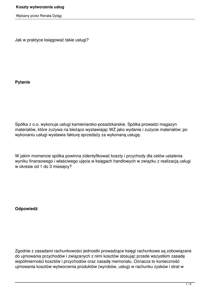 Koszty wytworzenia usług Wpisany przez Renata Dyląg Jak w praktyce księgować takie usługi? Pytanie Spółka z o.o. wykonuje usługi kamieniarsko-posadzkarskie. Spółka prowadzi magazyn materiałów, które zużywa na bieżąco wystawiając WZ jako wydanie i zużycie materiałów; po wykonaniu usługi wystawia fakturę sprzedaży za wykonaną usługę. W jakim momencie spółka powinna zidentyfikować koszty i przychody dla celów ustalenia wyniku finansowego i właściwego ujęcia w księgach handlowych w związku z realizacją usługi w okresie od 1 do 3 miesięcy? Odpowiedź Zgodnie z zasadami rachunkowości jednostki prowadzące księgi rachunkowe są zobowiązane do ujmowania przychodów i związanych z nimi kosztów stosując przede wszystkim zasadę współmierności kosztów i przychodów oraz zasadę memoriału. Oznacza to konieczność ujmowania kosztów wytworzenia produktów (wyrobów, usług) w rachunku zysków i strat w 1/5 Koszty wytworzenia usług Wpisany przez Renata Dyląg okresie, w którym jednostka uzyskała przychód ze sprzedaży tych produktów. Pozostałe koszty (czyli koszty niebędące bezpośrednimi lub pośrednimi kosztami wytworzenia) odnoszone są na wynik w okresie ich poniesienia. Natomiast zgodnie z zasadą memoriałową przychody ze sprzedaży usług jak również koszty związane z ich osiągnięciem wykazuje się w księgach rachunkowych w momencie ich osiągnięcia (poniesienia) niezależnie od terminu ich zapłaty. Uzasadnienie W przypadku firm, które ujmują koszty jednocześnie w zespole 4 i 5, ponoszone w poszczególnych okresach koszty proste ujmuje się w pełnej wysokości na kontach układu rodzajowego, a następnie poprzez konto Rozliczenie kosztów przenosi się je na odpowiednie konta zespołu 5 lub do rozliczenia w czasie (zespół 6). W przypadku sprzedaży usług ustala się koszt wytworzenia tych usług (koszty wytworzenia wszystkich usług są gromadzone na koncie zespołu 5 Koszty działalności podstawowej) i przeksięgowuje się go na konto Koszt własny sprzedanych usług (zespół 7). W przypadku występowania na koniec okresu usług będących w toku, ich wartość zostaje ustalona jako saldo konta Koszty działalności podstawowej. Saldo to może dzień bilansowy pozostać na koncie „Koszty działalności usługowej" lub zostać przeniesione na konto „Usługi niezakończone", natomiast na początek następnego roku obrotowego przeksięgowuje się je ponownie w ciężar konta „Koszty działalności usługowej". Saldo usług niezakończonych należy ująć w bilansie w aktywach obrotowych (jako zapasy). Firmy, które ujmują koszty wyłącznie na kontach zespołu 5 ewidencjonują na nich w ciągu okresu koszty dotyczące tego okresu, a koszty przypadające na okresy przyszłe ujmują na koncie „Rozliczenia międzyokresowe kosztów". Koszty wytworzenia usług, ujęte na koncie „Koszty działalności usługowej" przenosi się na koniec każdego okresu, jako koszt wytworzenia sprzedanych usług na konto „Koszt własny sprzedanych usług". Podobnie jak w wariancie poprzednim, saldo na koncie Koszty działalności usługowej oznacza usługi niezakończone na koniec okresu. 2/5 Koszty wytworzenia usług Wpisany przez Renata Dyląg Firmy księgujące koszty w zespole 4 ujmują na nich koszty ponoszone w ciągu okresu. Na koniec okresu należy ustalić wartość usług niezakończonych i zaksięgować na koncie Ma Rozliczenie kosztów i Wn Produkcja w toku. Należy podkreślić, że firma może wyceniać produkty w toku produkcji (usługi niezakończone) w wysokości kosztów wytworzenia obejmujących bezpośrednie i pośrednie koszty wytworzenia, w wysokości tylko bezpośrednich kosztów wytworzenia bądź nie wyceniać ich w ogóle - jeżeli nie zniekształca to stanu aktywów oraz wyniku finansowego jednostki. Dokonany wybór w tym zakresie powinien być opisany w przyjętej przez jednostkę polityce rachunkowości. Przykład 1. Firma stosuje 4 i 5 zespół kont: 1. Koszty rodzajowe poniesione w okresie, łącznie 10.000 zł: Wn konta zespołu 4 Ma różne konta korespondujące 2. Rozliczenie kosztów rodzajowych (8000 dotyczy kosztów działalności usługowej, pozostałe 2000 dotyczy kosztów zarządu): Wn konto 502 Koszty działalności usługowej - 8000 zł Wn konto 551 Koszty ogólnego zarządu - 2000 zł Ma konto 490 Rozliczenie kosztów - 10.000 zł 3. Sprzedaż usług zakończonych w bieżącym okresie 15.000 zł (faktura sprzedaży): Wn konto 201 Rozrachunki z odbiorcami krajowymi niepowiązanymi - 15.000 zł Ma konto 700 Sprzedaż produktów 15.000 zł 3/5 Koszty wytworzenia usług Wpisany przez Renata Dyląg 4. Ustalenie i zaksięgowanie kosztu wytworzenia sprzedanych usług - 7000 zł: Wn konto 712 Koszt własny sprzedanych usług działalności podstawowej - 7000 zł Ma konto 502 Koszty działalności usługowej - 7000 zł 5. Przeksięgowanie salda konta 502 usługi niezakończonej - 1000 zł Wn konto 603 Usługi niezakończone Ma konto 502 Koszty działalności usługowej. W przypadku ustalania wyniku finansowego w wariancie porównawczym, firma przeksięgowuje na wynik finansowy osiągnięte przychody (15.000), koszty ujęte w układzie rodzajowym 10.000 oraz zmianę (zwiększenie) stanu produktów (saldo ustalone na koncie rozliczenie kosztów po przeksięgowaniu na nie salda kont 712 (7000 zł) i 551 (2000 zł). W wariancie kalkulacyjnym zamiast kosztów rodzajowych na wynik finansowy przeksięgowuje się koszt własny sprzedanych usług oraz koszty zarządu. Nie ustala się w tym przypadku zmiany stanu produktów. Przykład 2 Firma stosuje tylko zespół 5: 1. Firma poniosła w danym okresie koszty, łącznie 10.000 zł, z tego 8000 zł dotyczy kosztów działalności usługowej, pozostałe 2000 zł dotyczy kosztów zarządu: Wn konto 502 Koszty działalności usługowej - 8000 zł Wn konto 551 Koszty ogólnego zarządu - 2000 zł Ma konto (różne konta korespondujące) - 10.000 zł 2. Sprzedaż u