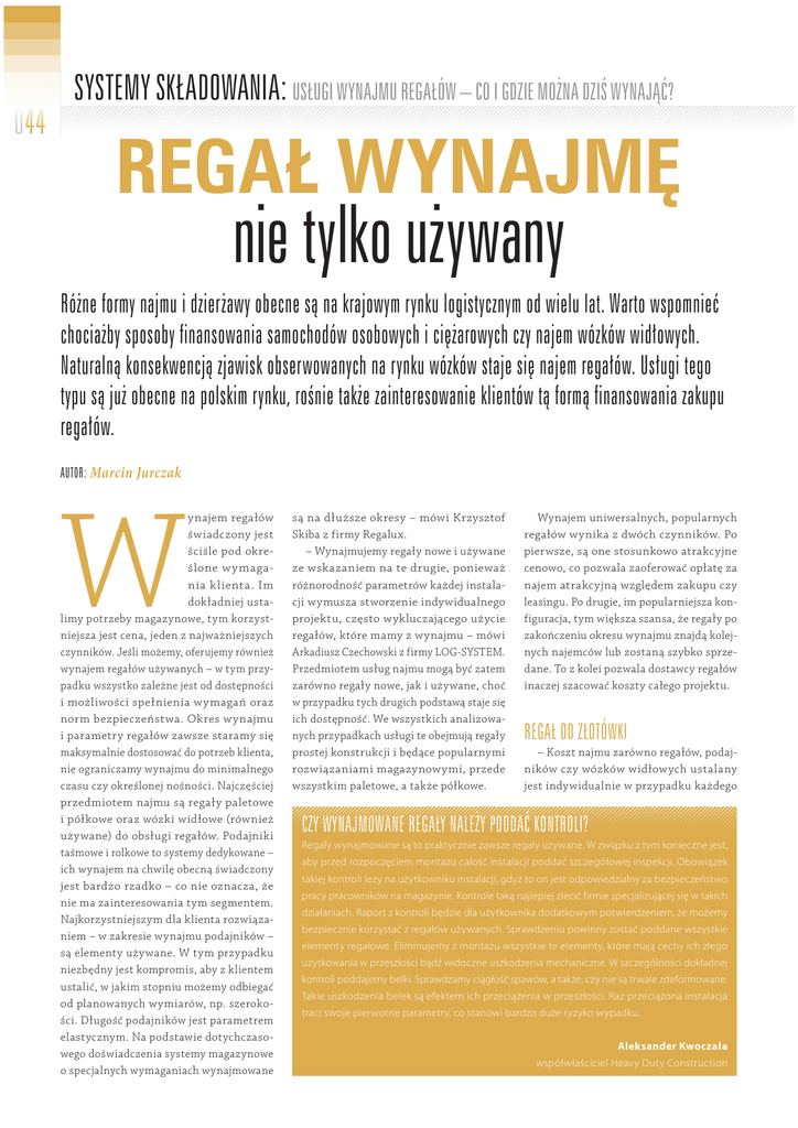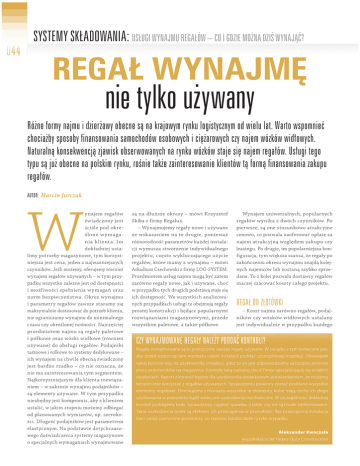 0044 4444 SYSTEMY SKŁADOWANIA: USŁUGI WYNAJMU REGAŁÓW – CO I GDZIE MOŻNA DZIŚ WYNAJĄĆ? REGAŁ WYNAJMĘ nie tylko używany Różne formy najmu i dzierżawy obecne są na krajowym rynku logistycznym od wielu lat. Warto wspomnieć chociażby sposoby finansowania samochodów osobowych i ciężarowych czy najem wózków widłowych. Naturalną konsekwencją zjawisk obserwowanych na rynku wózków staje się najem regałów. Usługi tego typu są już obecne na polskim rynku, rośnie także zainteresowanie klientów tą formą finansowania zakupu regałów. AUTOR: Marcin Jurczak W ynajem regałów świadczony jest ściśle pod określone w y magania k lienta. Im dokładniej ustalimy potrzeby magazynowe, tym korzystniejsza jest cena, jeden z najważniejszych czynników. Jeśli możemy, oferujemy również wynajem regałów używanych – w tym przypadku wszystko zależne jest od dostępności i możliwości spełnienia wymagań oraz norm bezpieczeństwa. Okres wynajmu i parametry regałów zawsze staramy się maksymalnie dostosować do potrzeb klienta, nie ograniczamy wynajmu do minimalnego czasu czy określonej nośności. Najczęściej przedmiotem najmu są regały paletowe i półkowe oraz wózki widłowe (również używane) do obsługi regałów. Podajniki taśmowe i rolkowe to systemy dedykowane – ich wynajem na chwilę obecną świadczony jest bardzo rzadko – co nie oznacza, że nie ma zainteresowania tym segmentem. Najkorzystniejszym dla klienta rozwiązaniem – w zakresie wynajmu podajników – są elementy używane. W tym przypadku niezbędny jest kompromis, aby z klientem ustalić, w jakim stopniu możemy odbiegać od planowanych wymiarów, np. szerokości. Długość podajników jest parametrem elastycznym. Na podstawie dotychczasowego doświadczenia systemy magazynowe o specjalnych wymaganiach wynajmowane są na dłuższe okresy – mówi Krzysztof Skiba z firmy Regalux. – Wynajmujemy regały nowe i używane ze wskazaniem na te drugie, ponieważ różnorodność parametrów każdej instalacji wymusza stworzenie indywidualnego projektu, często wykluczającego użycie regałów, które mamy z wynajmu – mówi Arkadiusz Czechowski z firmy LOG-SYSTEM. Przedmiotem usług najmu mogą być zatem zarówno regały nowe, jak i używane, choć w przypadku tych drugich podstawą staje się ich dostępność. We wszystkich analizowanych przypadkach usługi te obejmują regały prostej konstrukcji i będące popularnymi rozwiązaniami magazynowymi, przede wszystkim paletowe, a także półkowe. Wynajem uniwersalnych, popularnych regałów wynika z dwóch czynników. Po pierwsze, są one stosunkowo atrakcyjne cenowo, co pozwala zaoferować opłatę za najem atrakcyjną względem zakupu czy leasingu. Po drugie, im popularniejsza konfiguracja, tym większa szansa, że regały po zakończeniu okresu wynajmu znajdą kolejnych najemców lub zostaną szybko sprzedane. To z kolei pozwala dostawcy regałów inaczej szacować koszty całego projektu. REGAŁ OD ZŁOTÓWKI – Koszt najmu zarówno regałów, podajników czy wózków widłowych ustalany jest indywidualnie w przypadku każdego C WWY CZ CZY WYN WYNA WYNAJ WYNAJM AJMMOWAN AJMO MOW MOWA OWAN ANE NEE RRE REGAŁ REGA REG GAŁ GAŁY AŁYY NALEŻY NAL NNA ALEŻ ALEŻY LEŻY EŻY ŻY PPO PODD PODDA POD DDAĆ DAĆ AĆ KONTROLI? KKO KON ONTTROL ONTR ONTRO TROOLI?I? WYNAJMOWANE REGAŁY PODDAĆ Regały wynajmowane są to praktycznie zawsze regały używane. W związku z tym konieczne jest, aby przed rozpoczęciem montażu całość instalacji poddać szczegółowej inspekcji. Obowiązek takiej kontroli leży na użytkowniku instalacji, gdyż to on jest odpowiedzialny za bezpieczeństwo pracy pracowników na magazynie. Kontrole taką najlepiej zlecić firmie specjalizującej się w takich działaniach. Raport z kontroli będzie dla użytkownika dodatkowym potwierdzeniem, że możemy bezpiecznie korzystać z regałów używanych. Sprawdzeniu powinny zostać poddane wszystkie elementy regałowe. Eliminujemy z montażu wszystkie te elementy, które mają cechy ich złego użytkowania w przeszłości bądź widoczne uszkodzenia mechaniczne. W szczególności dokładnej kontroli poddajemy belki. Sprawdzamy ciągłość spawów, a także, czy nie są trwale zdeformowane. Takie uszkodzenia belek są efektem ich przeciążenia w przeszłości. Raz przeciążona instalacja traci swoje pierwotne parametry, co stanowi bardzo duże ryzyko wypadku. Aleksander Kwoczała współwłaściciel Heavy Duty Construction NOWOCZESNY MAGAZYN / SIERPIEŃ-WRZESIEŃ 2013 projektu. Nie stosujemy sztywnej wyceny za miejsce paletowe czy miesiąc – każda kalkulacja zależna jest od wymagań i potrzeb klienta. Różna cena jest dla regałów o nośności 500 kg na miejsce paletowe i regałów o nośności 1000 kg na miejsce paletowe. Podobnie jest w przypadku wózków widłowych – inny koszt jest dla wózka widłowego o udźwigu 1,5 tony i wózka widłowego o udźwigu 3 ton. W kwestii regałów cenę najmu określa: waga palety, konfiguracja ilości poziomów, okres najmu, miejsca dostawy, więc każdy projekt wyceniany jest indywidualnie – mówi Krzysztof Skiba. Wśród ofert firm wynajmujących znajdują się takie, które określają minimalny czas wynajmu lub takie, przy których czas ten nie jest sztywno określany, a podstawą jest przede wszystkim kalkulacja finansowa. W obu przypadkach o opłacalności wynajmu ostatecznie decydują czynniki ekonomiczne. Warto zwrócić uwagę na fakt, że kalkulacja kosztu wynajmu zależy od wielu czynników. Należy zauważyć pewne prawidłowości. Skomplikowanie regału znacznie podnosi koszt wynajmu. W wielu przypadkach mały projekt jest REKLAMA nieopłacalny. Dostawcy usług w różny sposób szacują minimalne wartości takich projektów – mierząc je liczbą miejsc paletowych, wartością nowych regałów (poniżej pewnego progu nie opłaca się inwestować w najem) czy liczbą miejsc paletowych. W zależnośc