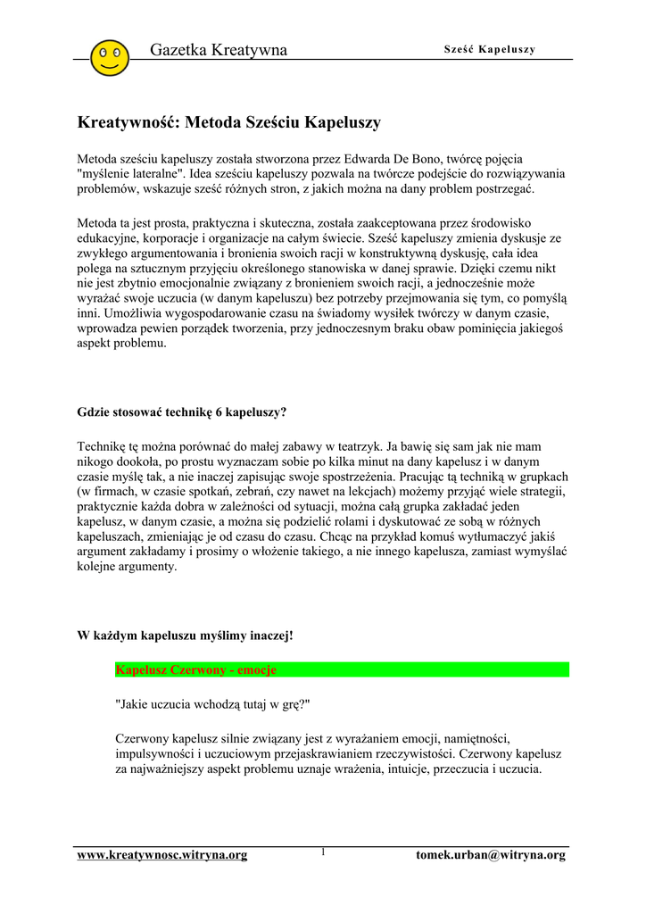 Gazetka Kreatywna S ześ ć Kap el u s zy Kreatywność: Metoda Sześciu Kapeluszy Metoda sześciu kapeluszy została stworzona przez Edwarda De Bono, twórcę pojęcia "myślenie lateralne". Idea sześciu kapeluszy pozwala na twórcze podejście do rozwiązywania problemów, wskazuje sześć różnych stron, z jakich można na dany problem postrzegać. Metoda ta jest prosta, praktyczna i skuteczna, została zaakceptowana przez środowisko edukacyjne, korporacje i organizacje na całym świecie. Sześć kapeluszy zmienia dyskusje ze zwykłego argumentowania i bronienia swoich racji w konstruktywną dyskusję, cała idea polega na sztucznym przyjęciu określonego stanowiska w danej sprawie. Dzięki czemu nikt nie jest zbytnio emocjonalnie związany z bronieniem swoich racji, a jednocześnie może wyrażać swoje uczucia (w danym kapeluszu) bez potrzeby przejmowania się tym, co pomyślą inni. Umożliwia wygospodarowanie czasu na świadomy wysiłek twórczy w danym czasie, wprowadza pewien porządek tworzenia, przy jednoczesnym braku obaw pominięcia jakiegoś aspekt problemu. Gdzie stosować technikę 6 kapeluszy? Technikę tę można porównać do małej zabawy w teatrzyk. Ja bawię się sam jak nie mam nikogo dookoła, po prostu wyznaczam sobie po kilka minut na dany kapelusz i w danym czasie myślę tak, a nie inaczej zapisując swoje spostrzeżenia. Pracując tą techniką w grupkach (w firmach, w czasie spotkań, zebrań, czy nawet na lekcjach) możemy przyjąć wiele strategii, praktycznie każda dobra w zależności od sytuacji, można całą grupka zakładać jeden kapelusz, w danym czasie, a można się podzielić rolami i dyskutować ze sobą w różnych kapeluszach, zmieniając je od czasu do czasu. Chcąc na przykład komuś wytłumaczyć jakiś argument zakładamy i prosimy o włożenie takiego, a nie innego kapelusza, zamiast wymyślać kolejne argumenty. W każdym kapeluszu myślimy inaczej! Kapelusz Czerwony - emocje "Jakie uczucia wchodzą tutaj w grę?" Czerwony kapelusz silnie związany jest z wyrażaniem emocji, namiętności, impulsywności i uczuciowym przejaskrawianiem rzeczywistości. Czerwony kapelusz za najważniejszy aspekt problemu uznaje wrażenia, intuicje, przeczucia i uczucia. www.kreatywnosc.witryna.org 1 [email protected] Gazetka Kreatywna S ześ ć Kap el u s zy Kolor ten jest pewnego rodzaju włącznikiem uczuć, każda czynność, rzecz wiąże się z nimi, zakładając ten kapelusz mamy nakaz ich wyrażania. Pozbywamy się obiektywizmu, wszystko w tym kolorze wyrażamy, subiektywnie, coś się podoba lub nie. Nie pytamy dlaczego coś lubimy bardziej lub mniej, to są nasze uczucia i mamy wolność ich wyrażania w tym przebraniu. Decyzje podejmowane w tym kolorze mogą być nawet irracjonalne, przy emocjonalnym podejściu nie ma czasu na racjonalne myślenie, decyzje mogą być szybkie i gwałtowne, emocja jest reakcją na pierwsze wrażenie. Niektórzy uważają, że myśliciel powinien być pozbawiony emocji, że emocje zakłócają myślenie. Jednak trzeba pamiętać ze każda decyzja wymaga emocji. Czerwony kapelusz nadaje subiektywnego znaczenia myśleniu. W pracy grupowej pozwala na otwarte wyrażanie uczuć, bez ich chowania i ukrywania, przecież to tylko odgrywanie ról, nie wyrażamy uczuć tylko odgrywamy rolę ;) Kapelusz Biały - obiektywizm Biały kapelusz jest całkowitym przeciwieństwem czerwonego, wskazuje na czystość, sterylność, neutralność i logikę. Biały kapelusz zajmuje się faktami i liczbami. Białą rolę można porównać do roli komputera, istnieje pewien obiektywny algorytm postępowania, do którego się stosujemy, nie ma uczuć, nie ma emocji jest tylko to, co da się racjonalnie przedstawić. Kolor biały jest włącznikiem faktów, np. mówimy: "teraz wkładamy biały kapelusz i analizujemy same fakty", należy pamiętać, że o faktach się nie dyskutuje, one istnieją. One musza być jak najbardziej obiektywne w pewnym aspekcie np. "ten budynek ma 10 lat". Biały kapelusz stosujemy, zwykle na początku zmiany wątku. Przykład, gdy przechodzimy do omawiania problemu niskich płac, najpierw musimy spytać o to, jakie są rzeczywiste płace, wtedy właśnie stosujemy ten kolor. Bialy posługuje się konkretnymi zestawami informacji, statystykami, dokumentami, analizami. Człowiek w białym nie ocenia zdarzeń, tylko wyjawia dane na konkretny temat i komentuje w granicach posiadanych informacji. Należy pamiętać, o tym ze fakty nie zawsze muszą być faktami. Większość tak zwanych faktów to poprostu osobiste uwagi, poczynione w dobrej wierze, lub coś, co uznajemy za fakt. Dlatego dobrze jest czasem zastosować podział na fakty sprawdzone, fakty oparte na wierze, fakty "na ogół", czy też zastosować inną skalę prawdopodobieństwa. Na przykład czy stwierdzenie, ze "kobiety malują paznokcie" jest faktem? Możemy tu zastosować np. skalę prawdopodobieństwa, lub bardziej sprecyzować fakty np. "kobiety które mogą być zainteresowane naszym produktem (zmywaczem do paznokci) malują paznokcie". Stosując się do zasad dobrego dialogu twórczego, możemy przyjąć, że wszystko to z czym przystępujemy do rozwiązania problemu, czyli nasza pierwotna wiedza na dany temat, znajduje się w białym kapeluszu. Dobrze jest za tym jako pierwszy punkt spotkania określić, biały kapelusz jako przedstawienie problemu. www.kreatywnosc.witryna.org 2 [email protected] Gazetka Kreatywna S ześ ć Kap el u s zy Kapelusz Czarny - pesymizm Czarny kapelusz to podejście pesymistyczne, negatywne, ma oceniać i ostrzegać przed zagrożeniami. Człowiek w czarnym nakryciu głowy, nadmiernie krytykuje rzeczywistość, widzi tylko złe jej aspekty. Czarny świat jest pełen zagrożeń, pełen negatywizmu i niepowodzeń. Zadaniem zakładającego czarny kapelusz jest wykazanie wszystkich wad, niedociągnięć, braków i zagrożeń. Czarny kapelusz szuka dziury w całym, sprawdza czy wszystko do tej pory omawiane napewno j