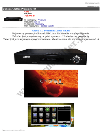 Informacje o produkcie Utworzono 03-03-2017 Dekoder AzBox Premium HD Cena : 949,00 zł 799,00 zł Nr katalogowy : Premium Producent : Azbox Dostępność : Dostępny Stan magazynowy : bardzo wysoki w w w .c ar d sp lit te r .p l Azbox HD Premium Linux WLAN Najnowszej generacji odbiornik HD Linux Multimedia w najlepszej cenie. Dekoder jest powystawowy, w pełni sprawny z 12 miesięczną gwarancją. Tuner jest już z wgranym oprogramowaniem, klient nie musi nic samemu programować :-) Wygenerowano w programie www.oscGold.com Co daje nam nowy HD-Box? System Linux ● możliwość PVR (osobista nagrywarka video, nagrywaj programy telewizyjne na dysk) ● WLAN (internet bezprzewodowy) ● NG RACE GoGo List (bezpłatna aktualizacja listy kanałów) ● Radio ● Dostęp do portali internetowych (np. YouTube) ● Dostęp do portali muzycznych ● Czytnik RSS-News ● Procesor SIGMA SMP 8634 ● Pamięć FLASH 32MB ● EEPROM 256KB ● SD RAM 256MB w w w .c ar d sp lit te r .p l ● Dostęp internetowy: ❍ Połączenie przez WLAN (bezprzewodowy) lub RJ45 (przewodowy) ❍ Interfejs przez pilot ❍ Aktualizacja listy kanałów przez internet oraz USB ❍ Przeglądarka internetowa ❍ Czytnik RSS-News ❍ Klient E-Mail (POP) Informacje o produkcie Odtwarzacz multimedialny: Audio: MP3, WAV, AIFF, WMA, Ogg Vobis ■ Obrazy: JPEG,BMP,TIFF,GIF, PNG ■ Video: MPEG1,MPEG2, MPEG4,DivX,XviD,MKV, AVI SSF ■ Video-Audio Aüflösung: MPEG-2/MPEG-4 Part 10 AVC/H.264 HD, [email protected] 1920x1080@50Hz(MPEG-2 ISO/IEC13818 Transport Stream Specifikation) ■ Wejście: max 90 MB/s ■ Aspect Ratio: 4:3, Letterbox, 16:9, Pan Scan Gniazda In/Out: 2x USB2 (jedno z przodu i jedno z tyłu) ● Złącze RJ45 LAN 10/100 ● Czytnik Smartcard ● HDD Lan przez SAMBA ● 2x IDE kontroler ● Wyjście Dolby Digital ● Złącze HDMI ● Złącze UHF ● 2x Złącze SCART ● Wyjście YUV ● Wyjście RF w w w .c ● ar d sp lit te r .p l ■ Wygenerowano w programie www.oscGold.com sp lit te r .p l w w w .c ar d Gwarancja 12 miesięcy