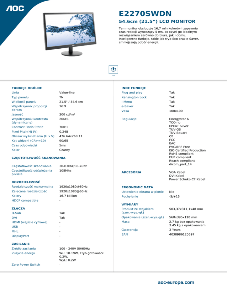 E2270SWDN 54.6cm (21.5”) LCD MONITOR Ten monitor obsługuje 16,7 mln kolorów i zapewnia czas reakcji wynoszący 5 ms, co czyni go idealnym rozwiązaniem zarówno do biura, jak i domu. Inteligentne funkcje, takie jak tryb Eco oraz e-Saver, zmniejszają pobór energii. TILT FUNKCJE OGÓLNE INNE FUNKCJE Linia Value-line Plug and play Tak Typ panelu TN Kensington Lock Tak Wielkość panelu 21.5" / 54.6 cm i-Menu Tak Współczynnik proporcji obrazu 16:9 e-Saver Tak Vesa 100x100 Jasność 200 cd/m² Współczynnik kontrastu (dynamiczny) 20M:1 Regulacje Contrast Ratio Static 700:1 Pixel Pitch(H) (V) 0.248 Obszar wyświetlania (H x V) 476.64x268.11 Kąt widzeni (CR>=10) 90/65 Czas odpowiedzi 5ms Kolor Czarny Energystar 6 TCO no EPEAT Silver TUV-GS TUV-Bauart CE FCC EAC PVC/BRF Free ISO Certified Production RoHS compliant EUP complient Reach compliant dicom_part_14 AKCESORIA VGA Kabel DVI Kabel Power Schuko C7 Kabel CZĘSTOTLIWOŚĆ SKANOWANIA Częstotliwość skanowania 30-83khz/50-76hz Częstotliwość odświeżania piksela 108Mhz ROZDZIELCZOŚĆ Rozdzielczość maksymalna 1920x1080@60Hz ERGONOMIC DATA Zalecana rozdzielczość 1920x1080@60Hz Ustawienie ekranu w pionie Nie Kolory 16.7 Million Pochylenie -5/+15 HDCP compatible WYMIARY ZŁĄCZA Tak Produkt ze stojakiem (szer.-wys.-gł.) 503,37x311,1x48 mm D-Sub DVI Tak Opakowanie (szer.-wys.-gł.) 560x395x110 mm HDMI (wejście cyfrowe) - Masa USB - 2.7 kg bez opakowania 3.45 kg z opakowaniem MHL - Gwarancja 3 Years DisplayPort - EAN 4038986125697 ZASILANIE Źródło zasilania 100 - 240V 50/60Hz Zużycie energii Wł.: 18.19W, Tryb gotowości: 0.2W, Wył.: 0.2W Zero Power Switch -