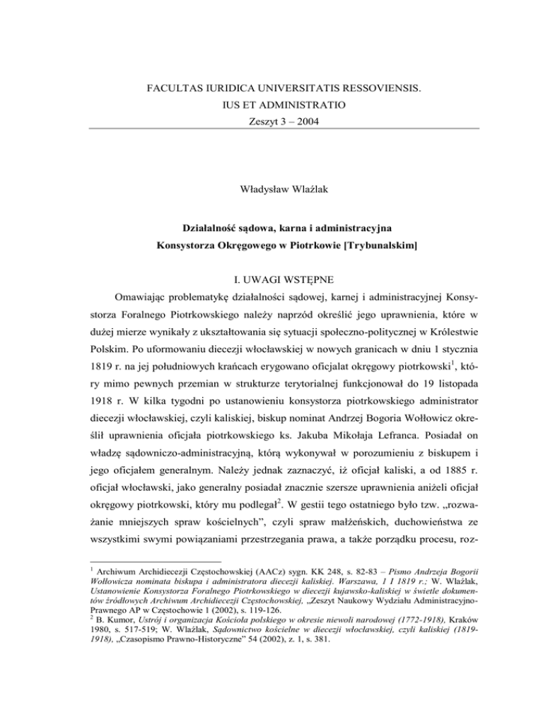 FACULTAS IURIDICA UNIVERSITATIS RESSOVIENSIS. IUS ET ADMINISTRATIO Zeszyt 3 – 2004 Władysław Wlaźlak Działalność sądowa, karna i administracyjna Konsystorza Okręgowego w Piotrkowie [Trybunalskim] I. UWAGI WSTĘPNE Omawiając problematykę działalności sądowej, karnej i administracyjnej Konsystorza Foralnego Piotrkowskiego należy naprzód określić jego uprawnienia, które w dużej mierze wynikały z ukształtowania się sytuacji społeczno-politycznej w Królestwie Polskim. Po uformowaniu diecezji włocławskiej w nowych granicach w dniu 1 stycznia 1819 r. na jej południowych krańcach erygowano oficjalat okręgowy piotrkowski1, który mimo pewnych przemian w strukturze terytorialnej funkcjonował do 19 listopada 1918 r. W kilka tygodni po ustanowieniu konsystorza piotrkowskiego administrator diecezji włocławskiej, czyli kaliskiej, biskup nominat Andrzej Bogoria Wołłowicz określił uprawnienia oficjała piotrkowskiego ks. Jakuba Mikołaja Lefranca. Posiadał on władzę sądowniczo-administracyjną, którą wykonywał w porozumieniu z biskupem i jego oficjałem generalnym. Należy jednak zaznaczyć, iż oficjał kaliski, a od 1885 r. oficjał włocławski, jako generalny posiadał znacznie szersze uprawnienia aniżeli oficjał okręgowy piotrkowski, który mu podlegał2. W gestii tego ostatniego było tzw. „rozważanie mniejszych spraw kościelnych”, czyli spraw małżeńskich, duchowieństwa ze wszystkimi swymi powiązaniami przestrzegania prawa, a także porządku procesu, roz1 Archiwum Archidiecezji Częstochowskiej (AACz) sygn. KK 248, s. 82-83 – Pismo Andrzeja Bogorii Wołłowicza nominata biskupa i administratora diecezji kaliskiej. Warszawa, 1 I 1819 r.; W. Wlaźlak, Ustanowienie Konsystorza Foralnego Piotrkowskiego w diecezji kujawsko-kaliskiej w świetle dokumentów źródłowych Archiwum Archidiecezji Częstochowskiej, „Zeszyt Naukowy Wydziału AdministracyjnoPrawnego AP w Częstochowie 1 (2002), s. 119-126. 2 B. Kumor, Ustrój i organizacja Kościoła polskiego w okresie niewoli narodowej (1772-1918), Kraków 1980, s. 517-519; W. Wlaźlak, Sądownictwo kościelne w diecezji włocławskiej, czyli kaliskiej (18191918), „Czasopismo Prawno-Historyczne” 54 (2002), z. 1, s. 381. 2 poznawania, badania i wypełniania wyroków sędziowskich, co należało wykonywać w świetle postanowień Soboru Trydenckiego3. Należy jednak zaznaczyć, iż uprawnienia konsystorza w dużej mierze określało prawodawstwo państwowe. Już 6/18 marca 1817 r. na mocy „Ukazu oznaczającego stopień dozoru i opieki rządu nad duchowieństwem rzymskokatolickim i funduszami przez niego posiadanymi”4 władze carskie oszacowały zakres władzy konsystorzy. Art. 11, 12, 13 i 14 tegoż ukazu odnosiły się do uprawnień personalnych, zaś art. 16 zobowiązywał konsystorz do składania sprawozdań Komisji Rządowej Wyznań Religijnych i Oświecenia Publicznego z tejże działalności. Z kolei art. 21 podawał kary, jakie mogły wymierzać sądy kościelne klerowi za popełnione „wykroczenia i występki przeciw powołaniu i obowiązkom duchownym”5. Bardziej szczegółowym w tej materii okazał się konkordat zawarty 22 lipca/3 sierpnia 1847 r. pomiędzy Stolicą Apostolską a Cesarstwem Rosyjskim6. W art. 14 podano sprawy podlegające władzy konsystorzy. Należały do nich problemy dyscyplinarne kleru w zakresie sporów, majątkowych, zniesławień, wyrządzonych krzywd oraz niewypełnienia zobowiązań wypływających z prawa lub czynu. Ponadto konsystorz rozpatrywał sprawy nieważności ślubów zakonnych, sprawował pieczę nad aktami stanu cywilnego, a także w jego kompetencji były zagadnienia dotyczące sakramentu małżeństwa. Istotnym było to, iż konsystorz mógł nakładać pokuty kanoniczne za dokonane zbrodnie, przewinienia lub występki, które wcześnie zostały osądzone przez sądy państwowe7. Warto podkreślić, iż wszystkie sprawy były rozstrzygane przez rządcę diecezji, czyli biskupa lub administratora po wcześniejszym rozpatrzeniu przez konsystorz. Wynikało to z faktu, iż ten ostatni był organem doradczym 3 AACz sygn. KD 24, s. 24-26 – Odezwa, czyli list pasterski Andrzeja Bogorii Wołłowicza nominata biskupa i administratora diecezji włocławskiej, czyli kaliskiej skierowany do duchowieństwa i wiernych oficjalatu foralnego piotrkowskiego. Warszawa, 10 II 1819 r. 4 Archiwum Diecezjalne we Włocławku (ADW) sygn. ADKK. AKKal. I/17 – Ukaz z 6/18 marca 1817 r. oznaczający stopień dozoru i opieki rządu nad duchowieństwem rzymskokatolickim i funduszami przez niego posiadanymi. 5 Wypis z protokołu Sekretariatu Stanu Królestwa Polskiego, Petersburg 1817, s. 6-10. 6 Najwyższy rozkaz, objawiony przez odezwę Sekretariatu Stanu przy Radzie Administracyjnej z dnia 8/20 października r.b. ogłasza w Dzienniku Praw, Konkordat w dniu 22 lipca/ 3 sierpnia 1847 r., między Pełnomocnikiem Najjaśniejszego Cesarza Wszech Rosyi i Króla Polskiego, a Pełnomocnikiem Jego Świątobliwości Papieża w Rzymie, zawarty. W Warszawie dnia 1/13 listopada 1856 r., „Dziennik Praw Królestwa Polskiego” 50 (1857), s. 99-127. 7 A. Aleksandrowicz, Brachium Saeculare według obecnie obowiązujących i dawniejszych konkordatów, Kraków 1934, s. 50-52. 3 biskupa, który nie musiał uzasadniać podjętych decyzji 8. Znaczny wpływ na działalność konsystorzy miała Komisja Rządowa WRiOP, która pomimo kilkukrotnej zmiany nazwy kreowała politykę wyznaniową w Królestwie Polskim, czego jaskrawym wyrazem było nadzorowanie życia zakonnego przez urzędnika konsystorza określanego mianem wizytatora klasztorów9. W tych trudnych okolicznościach doszło do zerwania konkordatu 22 listopada/4 grudnia 1866 r., co w rzeczywistości znacząco nie zmieniło obecnego stanu rzeczy, gdyż władze carskie dotychczasowych ustaleń prawnych i tak nie przestrzegały. Jedynym novum był fakt załatwiania dyspens papieskich za pośrednictwem Kolegium Duchownego w Peter